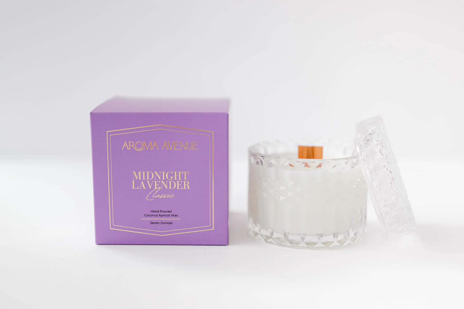 Our Midnight Lavender candle delivers an intriguing fresh and woodsy scent with a soapy edge. Its versatile fragrance is designed to be a sophisticated year round aroma and ideal for unwinding after a long day.