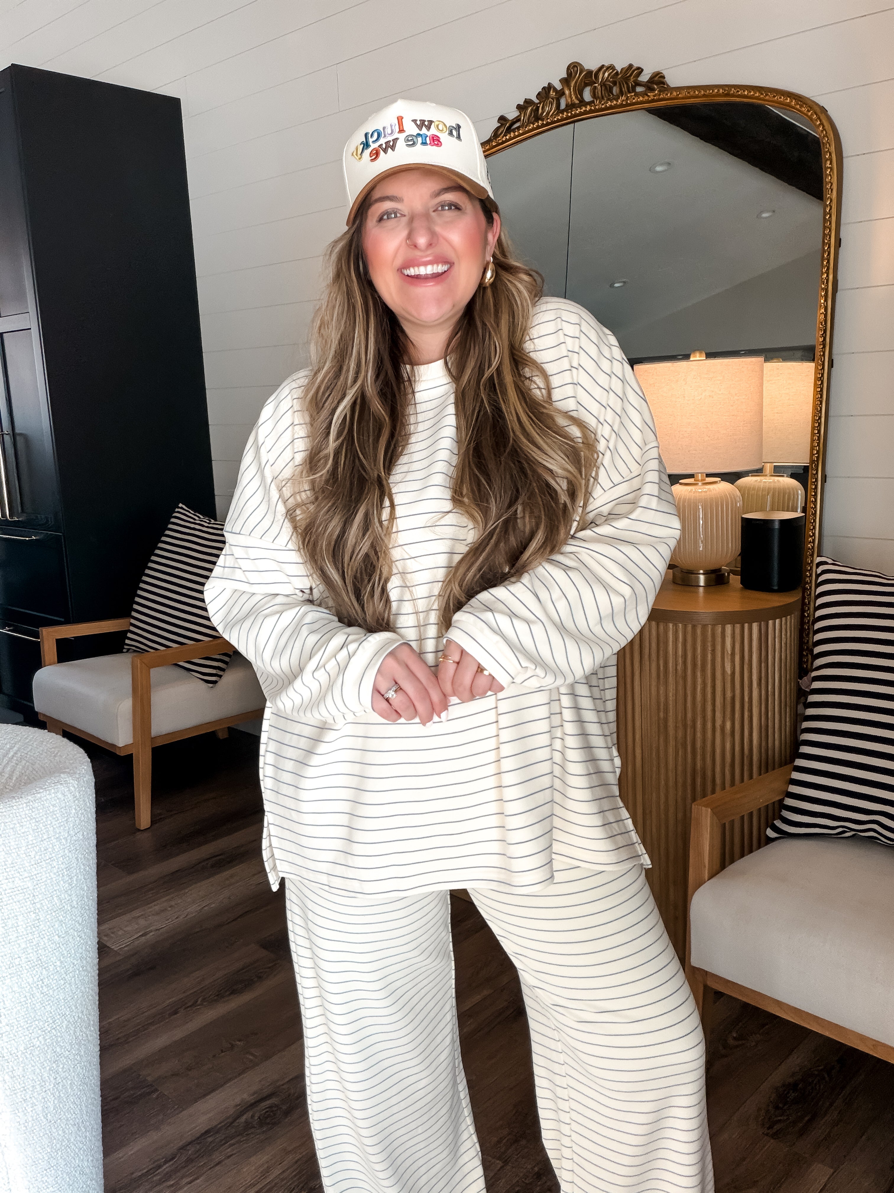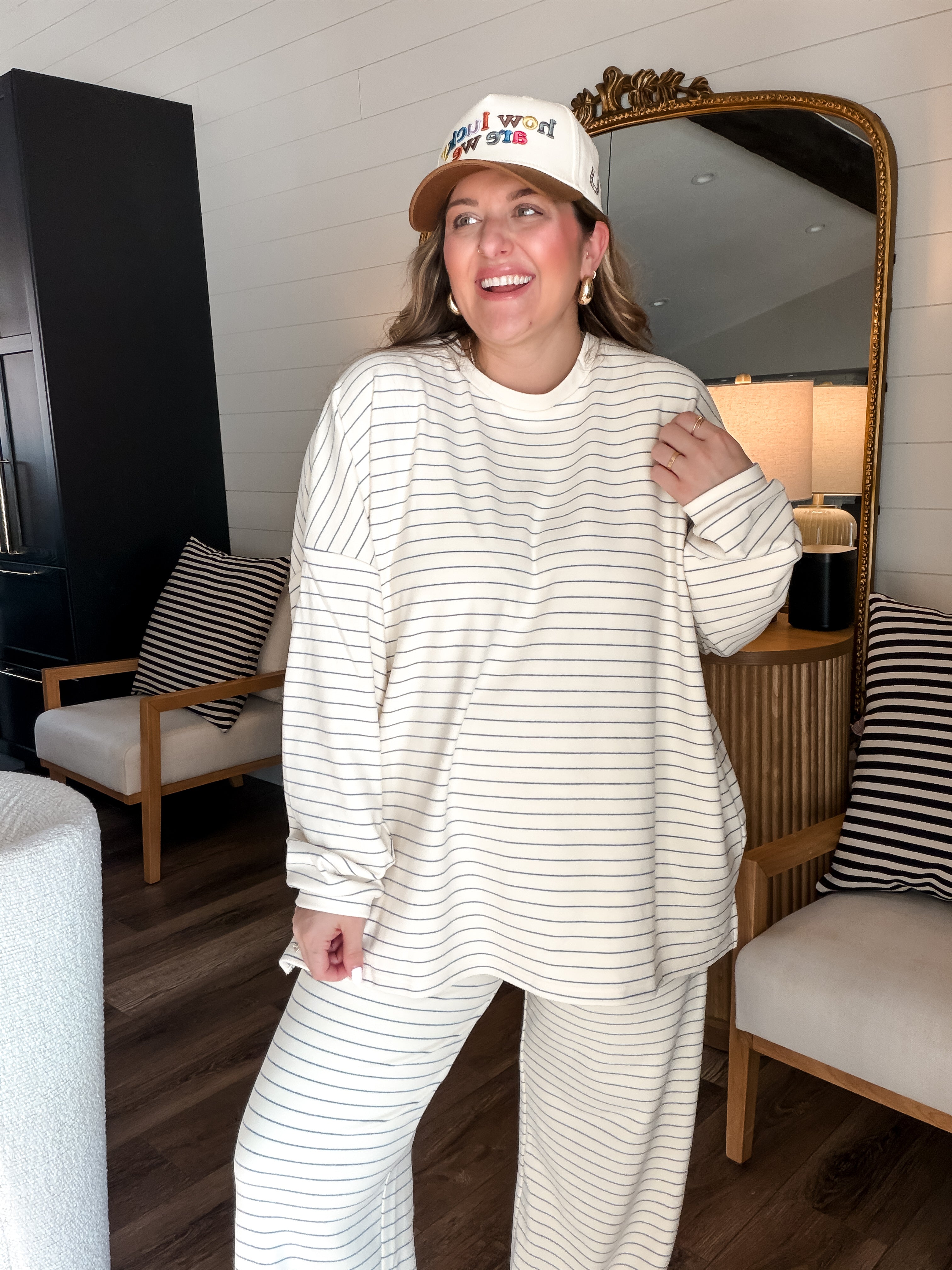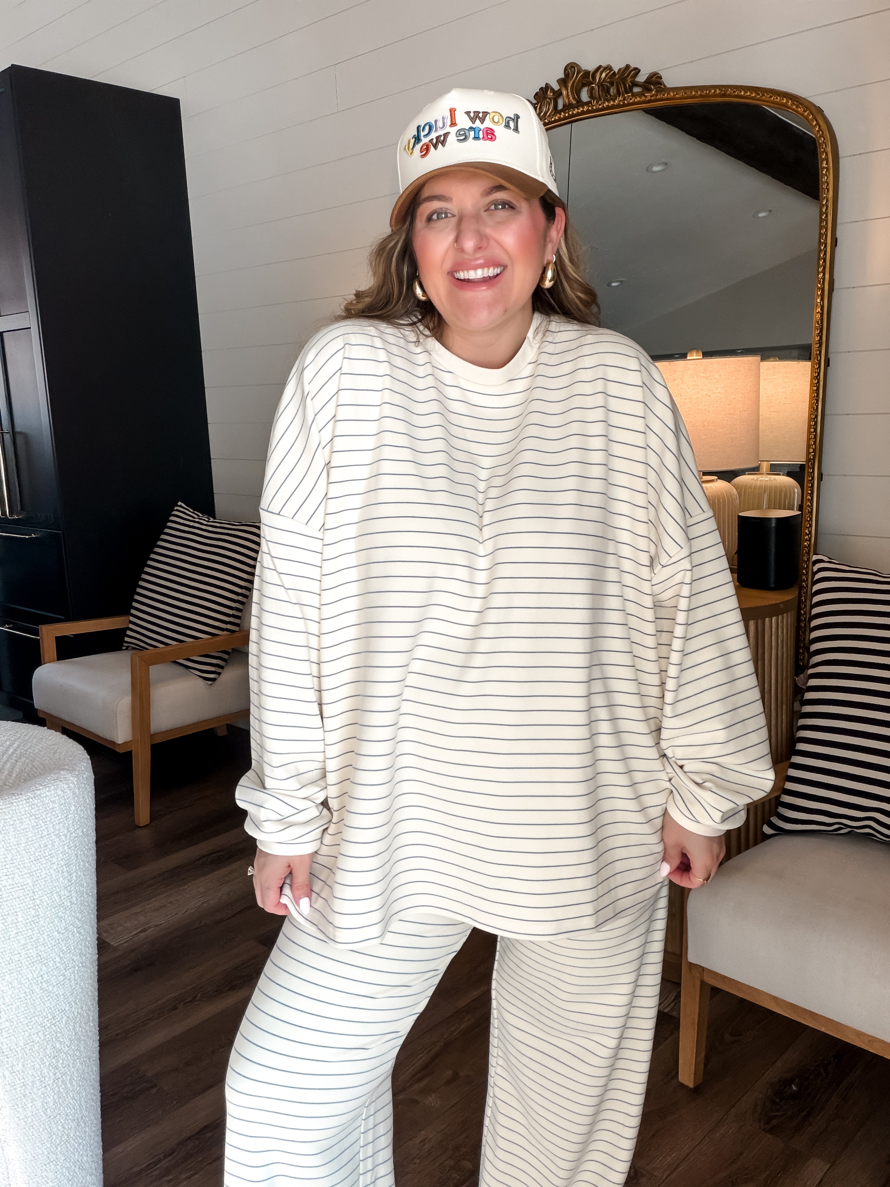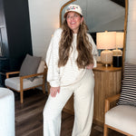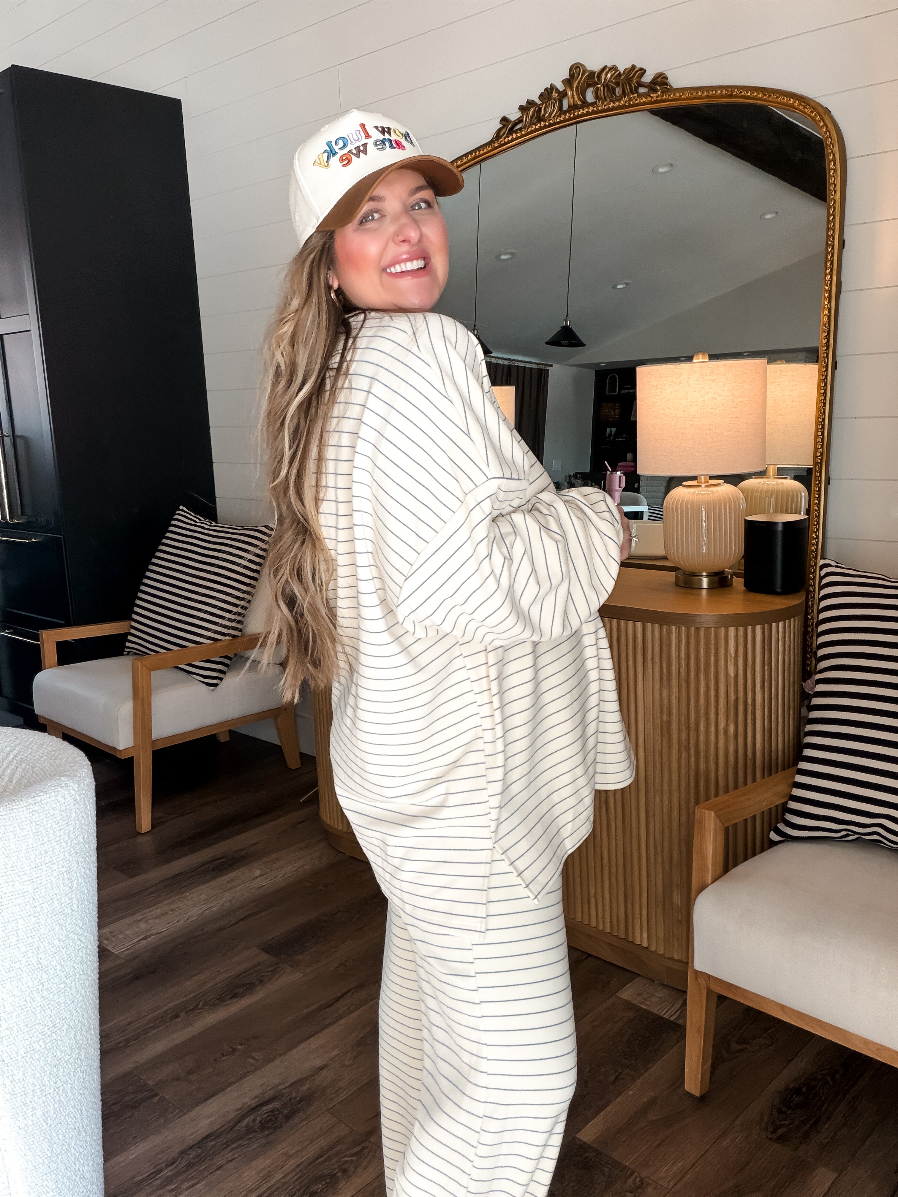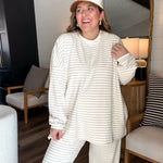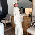 Meet your new go-to for both couch lounging and strutting! The Cloudy Days Stripe Pants in Ivory + Baby Blue are like a cozy hug for your legs, with a stretchy waistband that adapts to your height (shorties or tall folks, rejoice!). Plush fabric means you’ll stay warm and ready to tackle anything—whether that’s adding snazzy accessories or just hanging with your two-legged companions. Morgan even rocks them post-baby like a boss (size large)! Get ready to kick back or stand out!