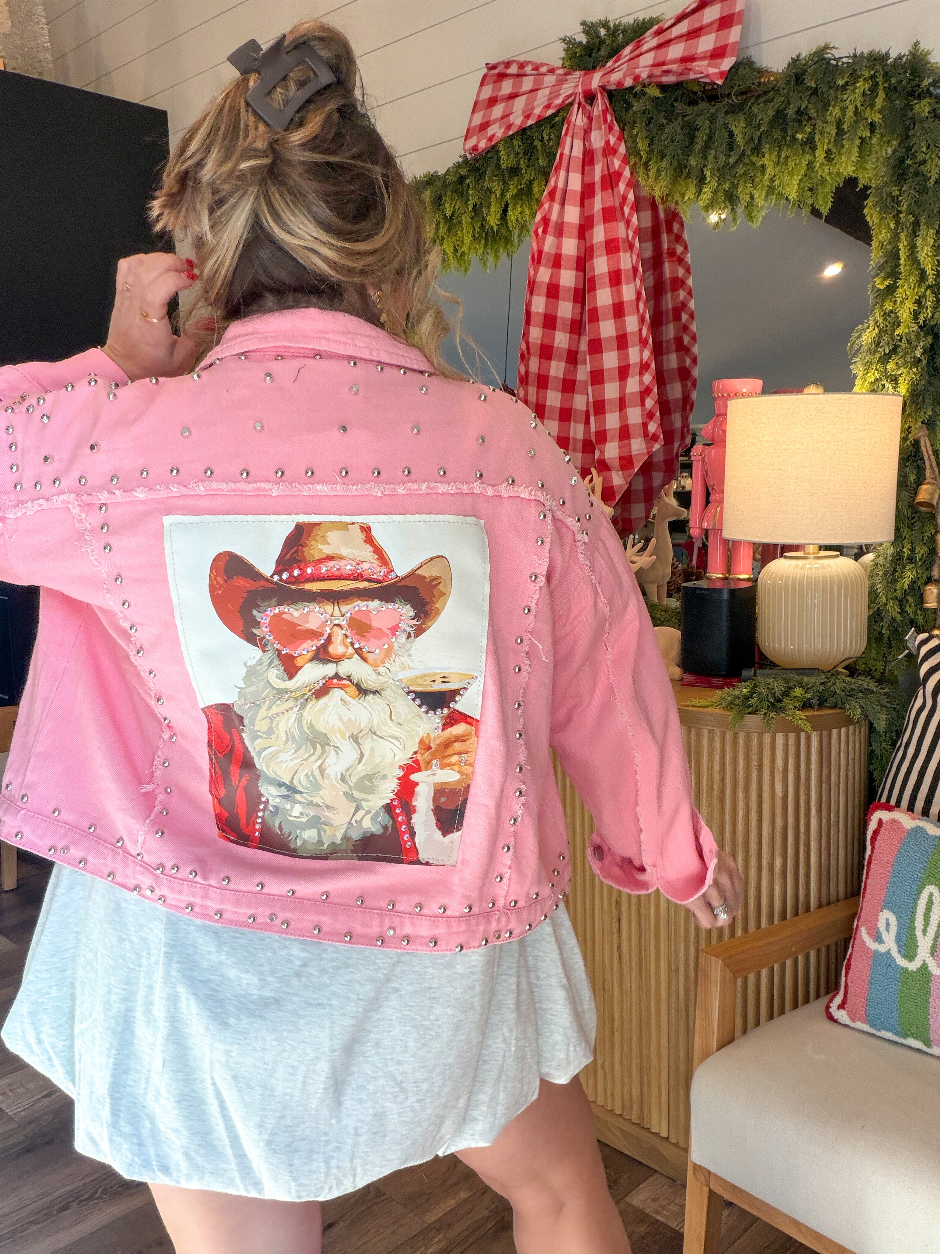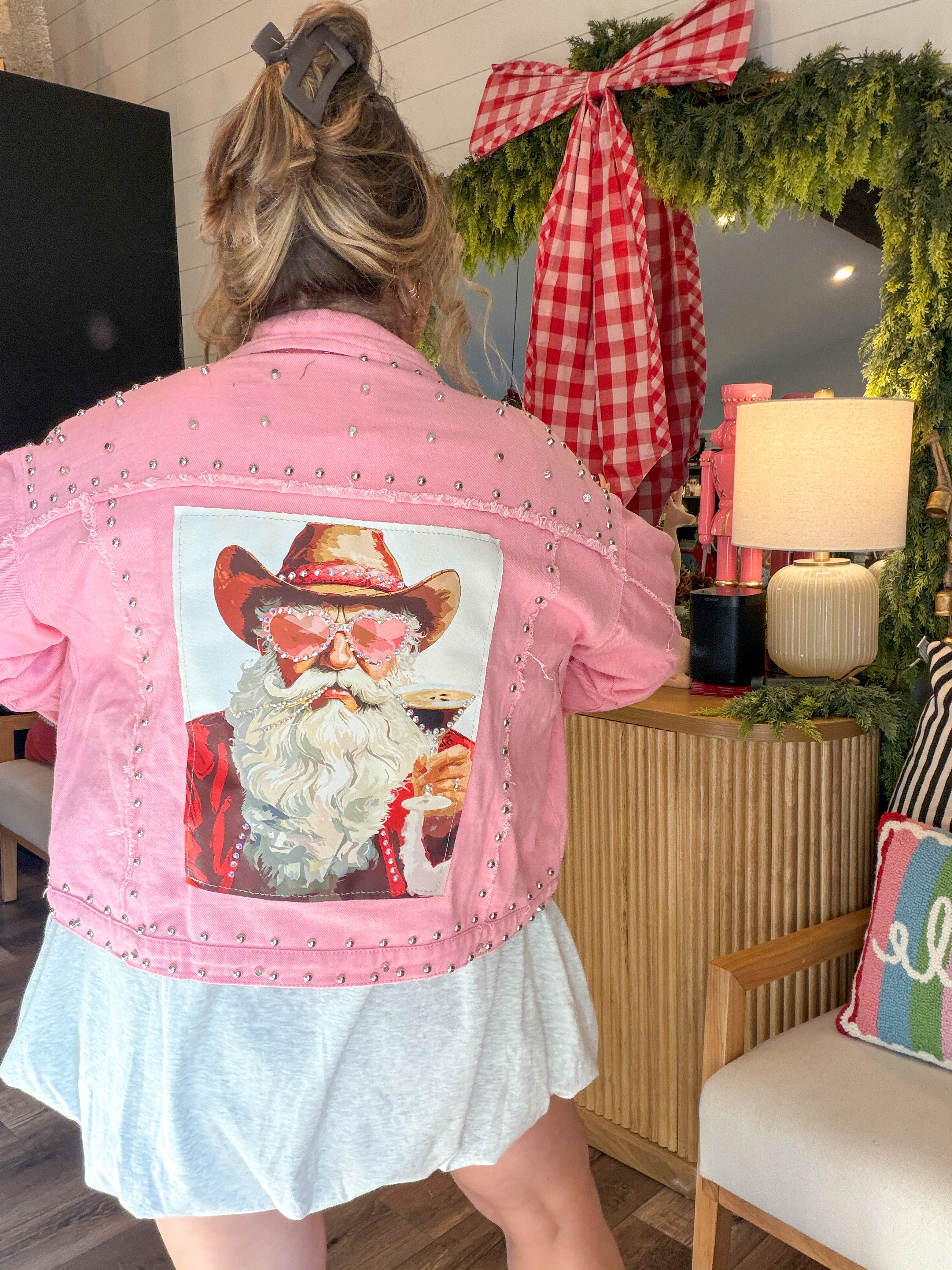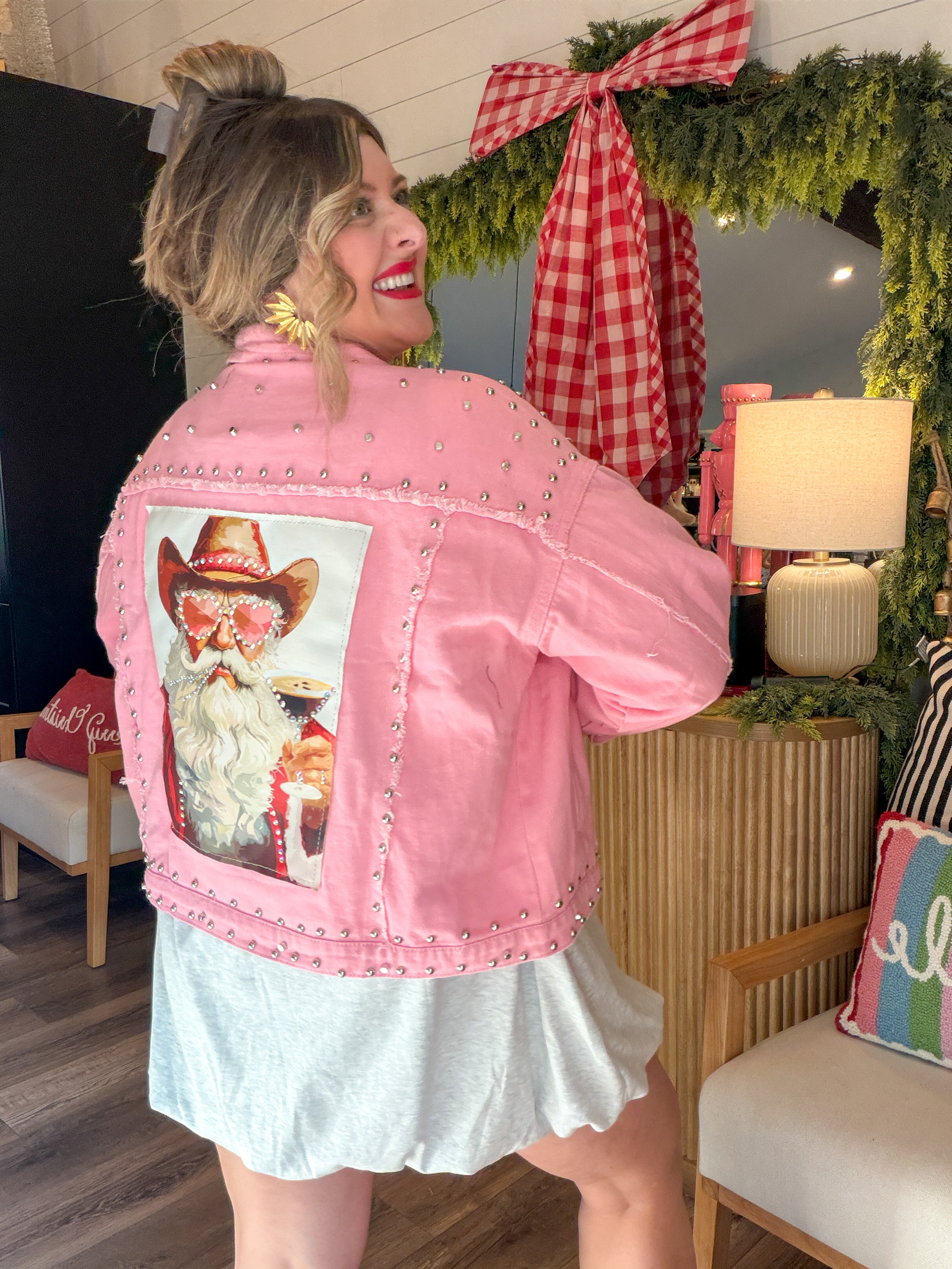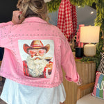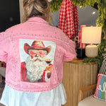 Sugar, spice, and a Santa who definitely rides with the top down. This oversized pink denim jacket is your new holiday personality — loud, iconic, and impossible to ignore. With silver stud detailing and a custom novelty Santa patch (complete with heart-shaped glasses and cowboy hat), this jacket is basically saying “Yes, I sleigh… respectfully.”