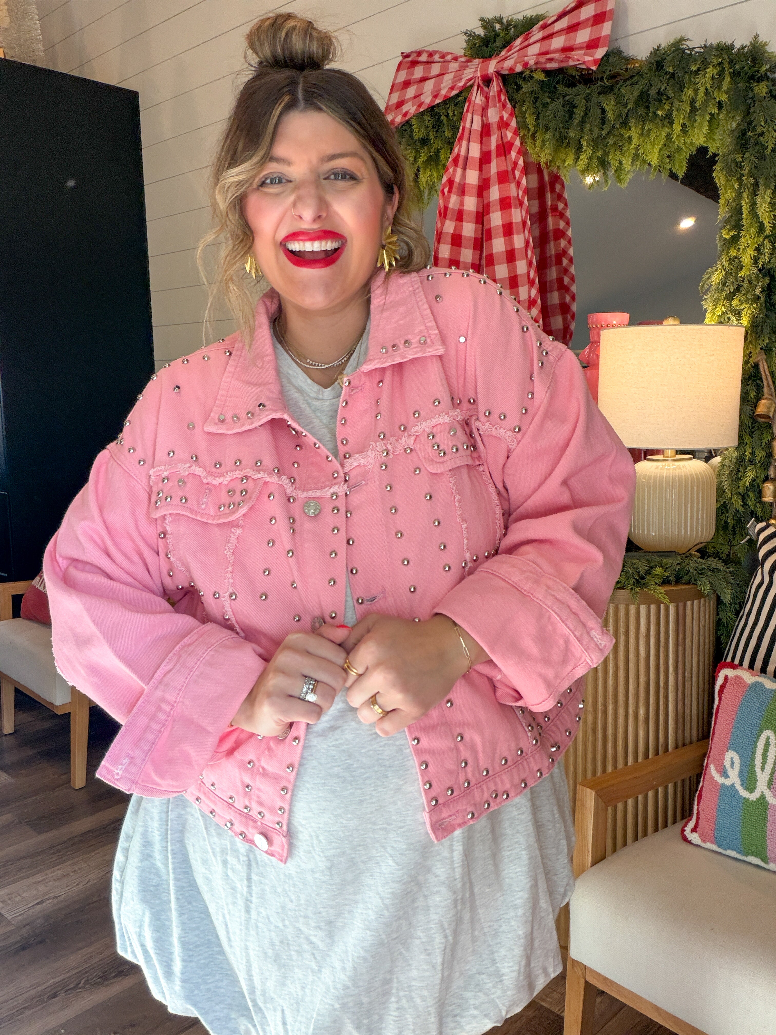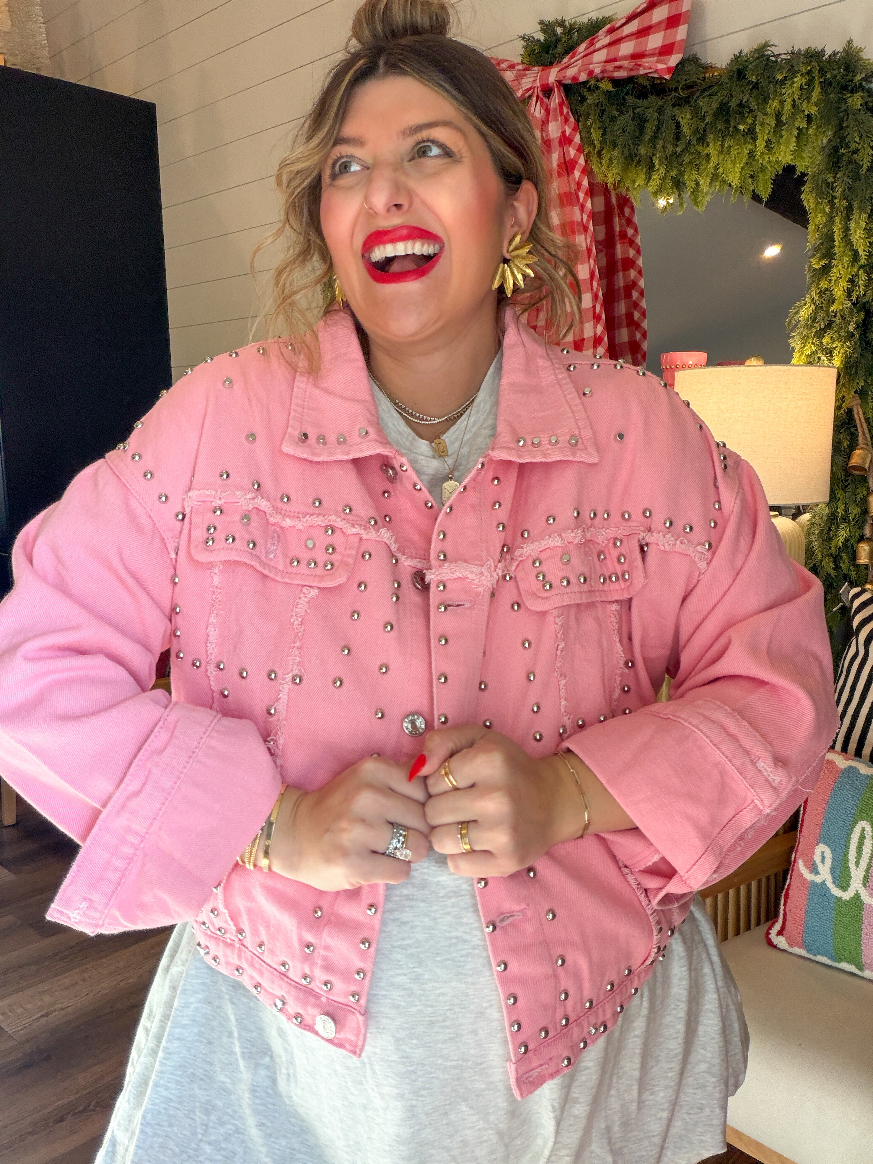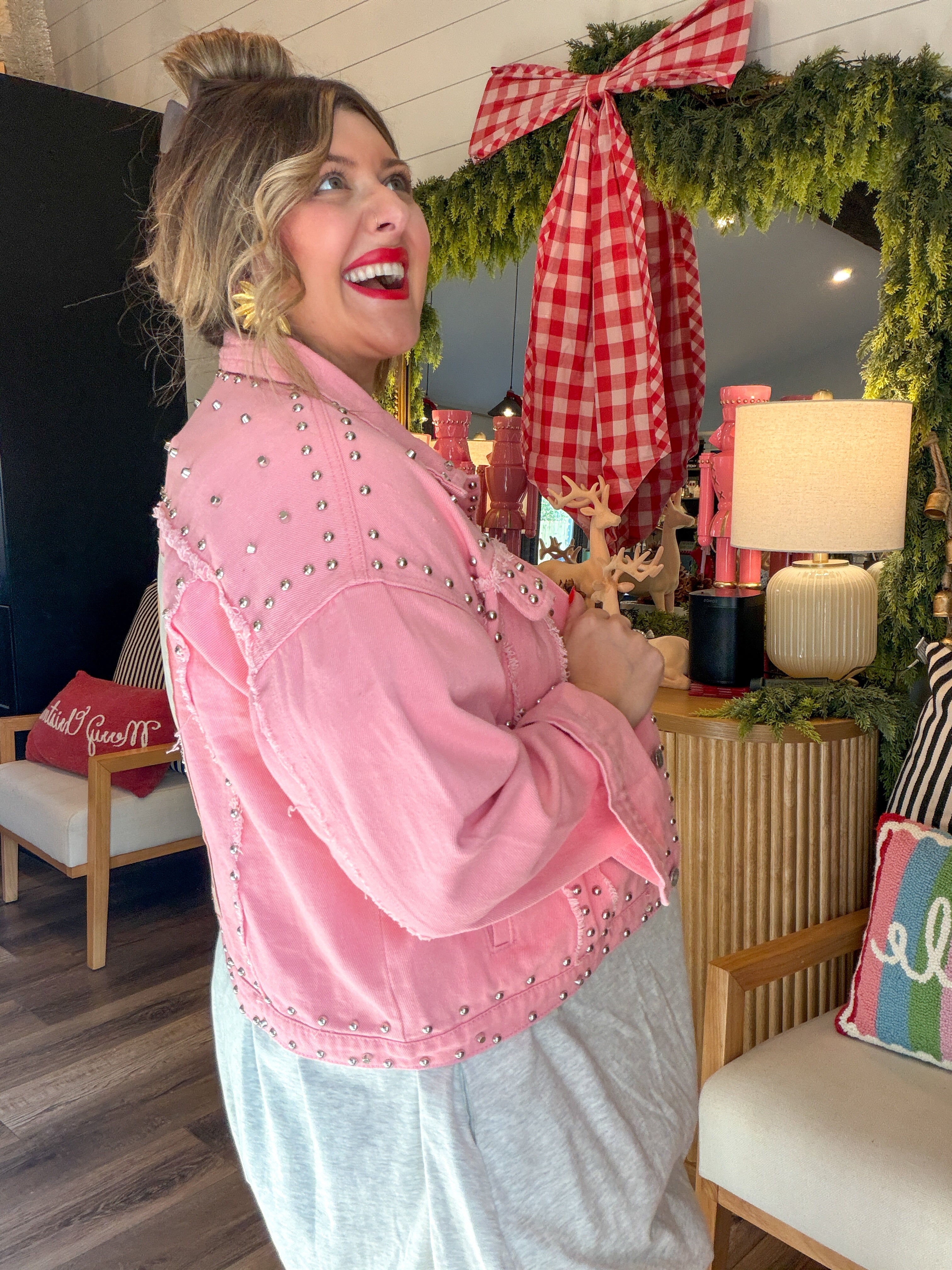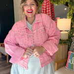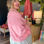 Sugar, spice, and a Santa who definitely rides with the top down. This oversized pink denim jacket is your new holiday personality — loud, iconic, and impossible to ignore. With silver stud detailing and a custom novelty Santa patch (complete with heart-shaped glasses and cowboy hat), this jacket is basically saying “Yes, I sleigh… respectfully.”