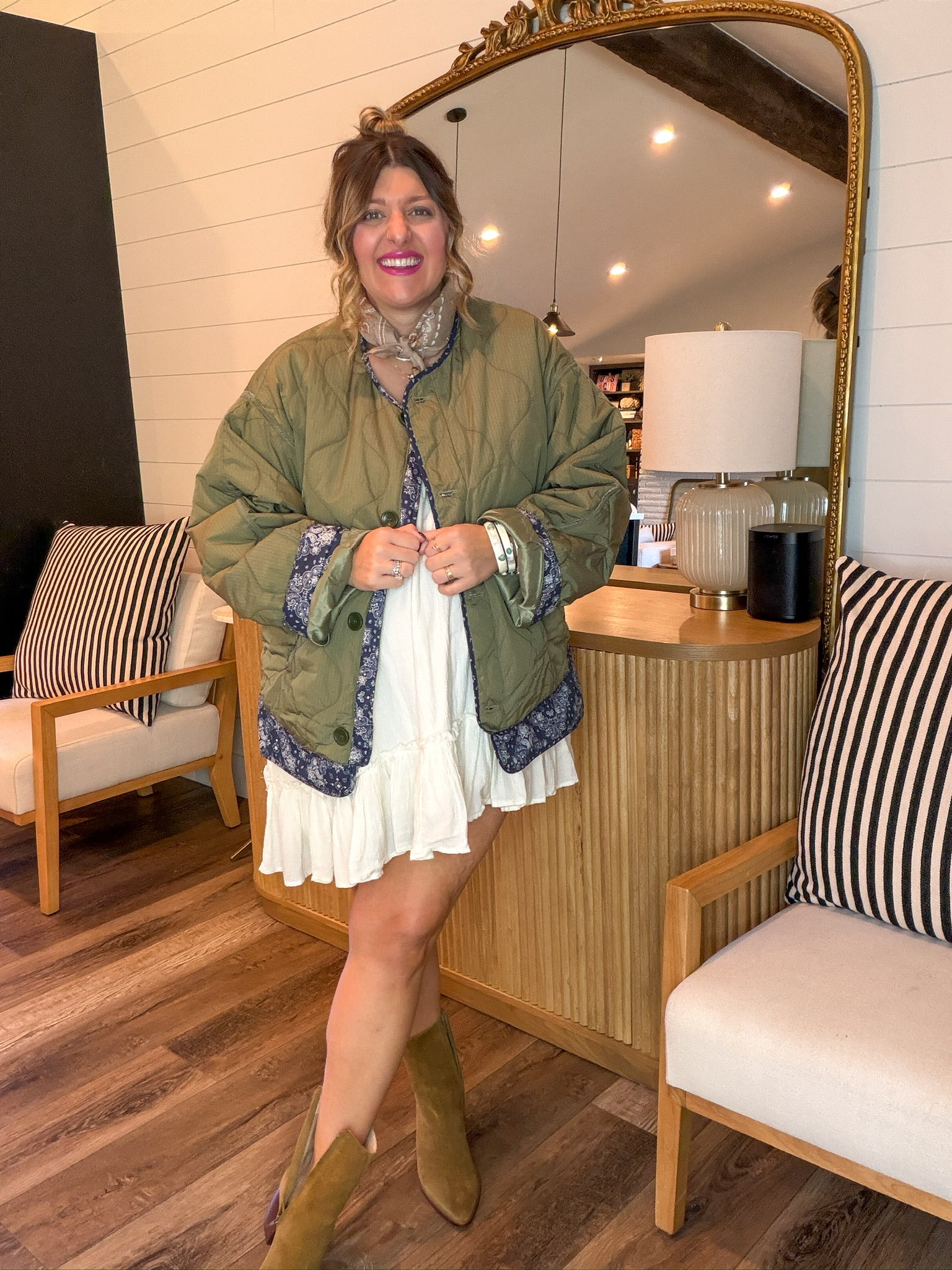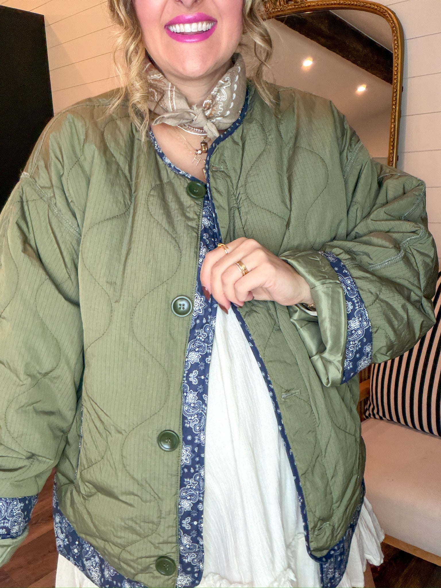 She’s military-core meets market-day chic. This olive quilted jacket is trimmed in bandana print and lined with a pattern that screams “cool aunt energy.” It’s like army coat took a detour through Nashville—and came back fabulous.