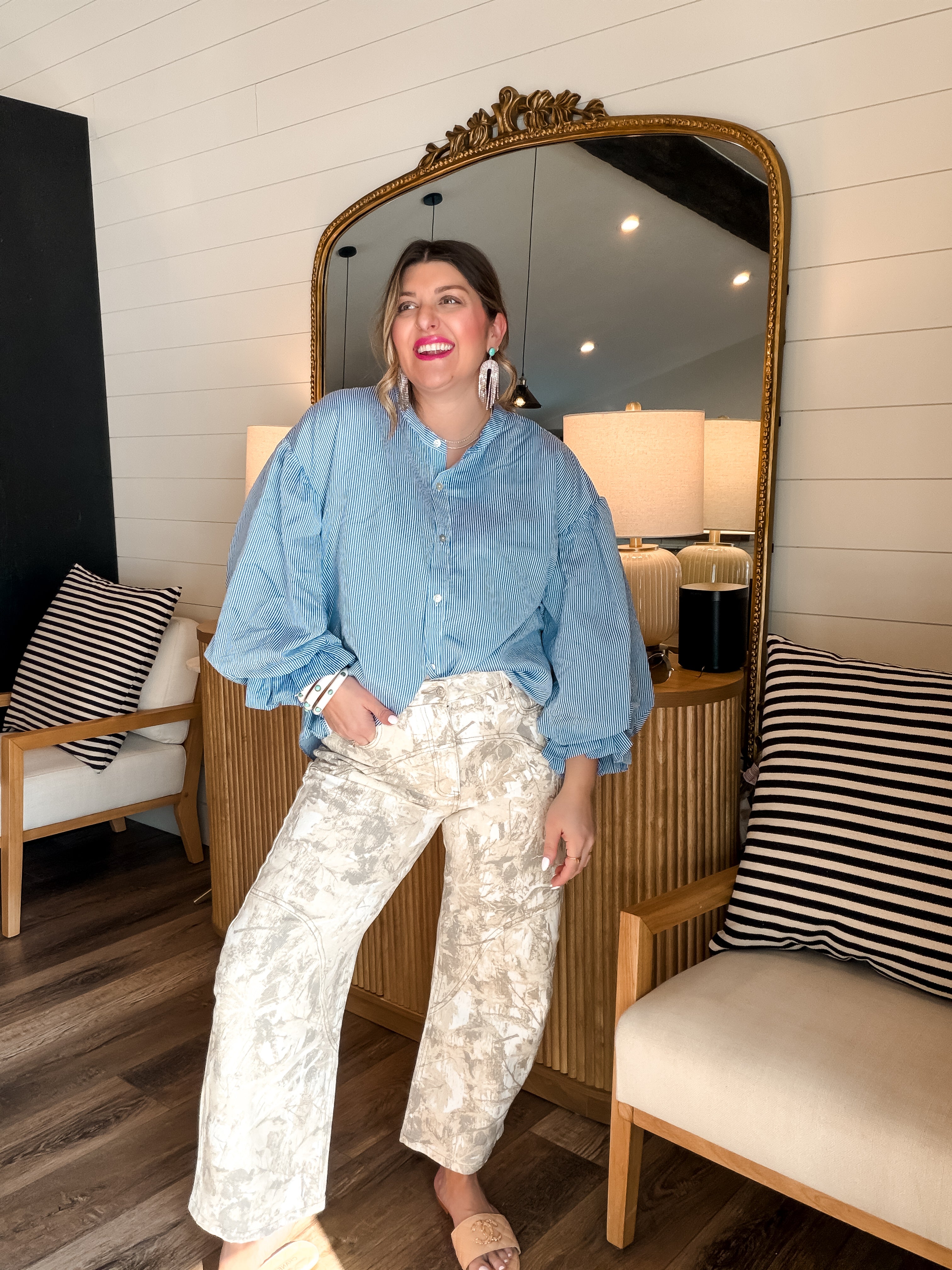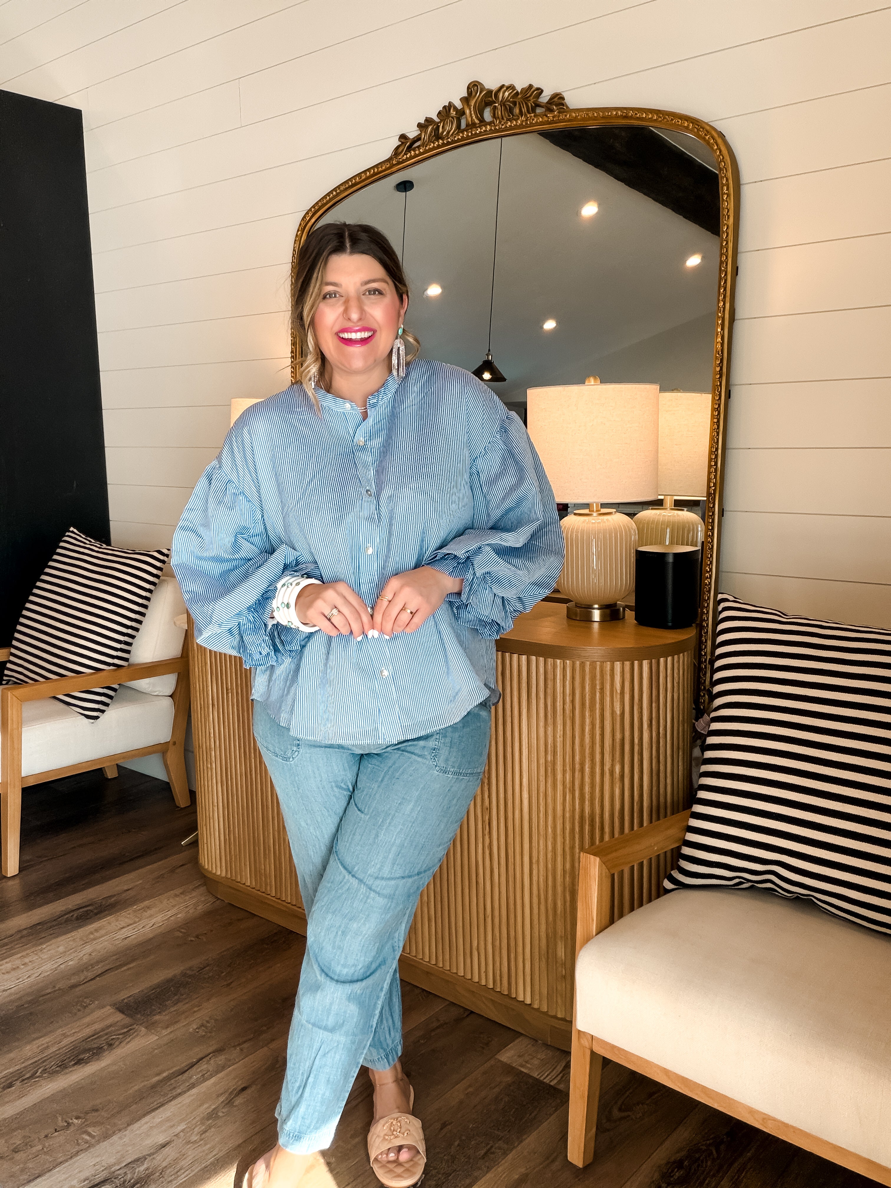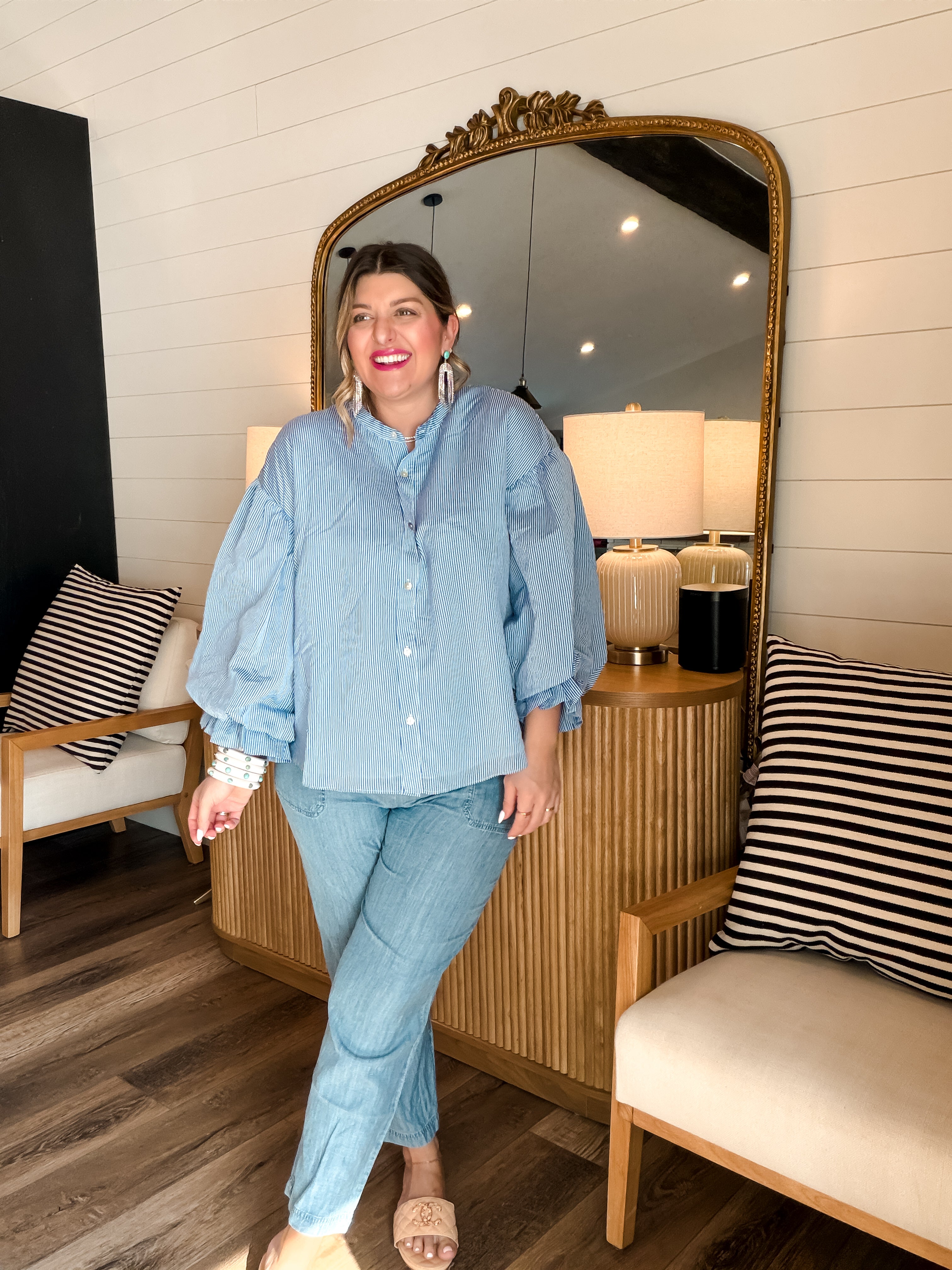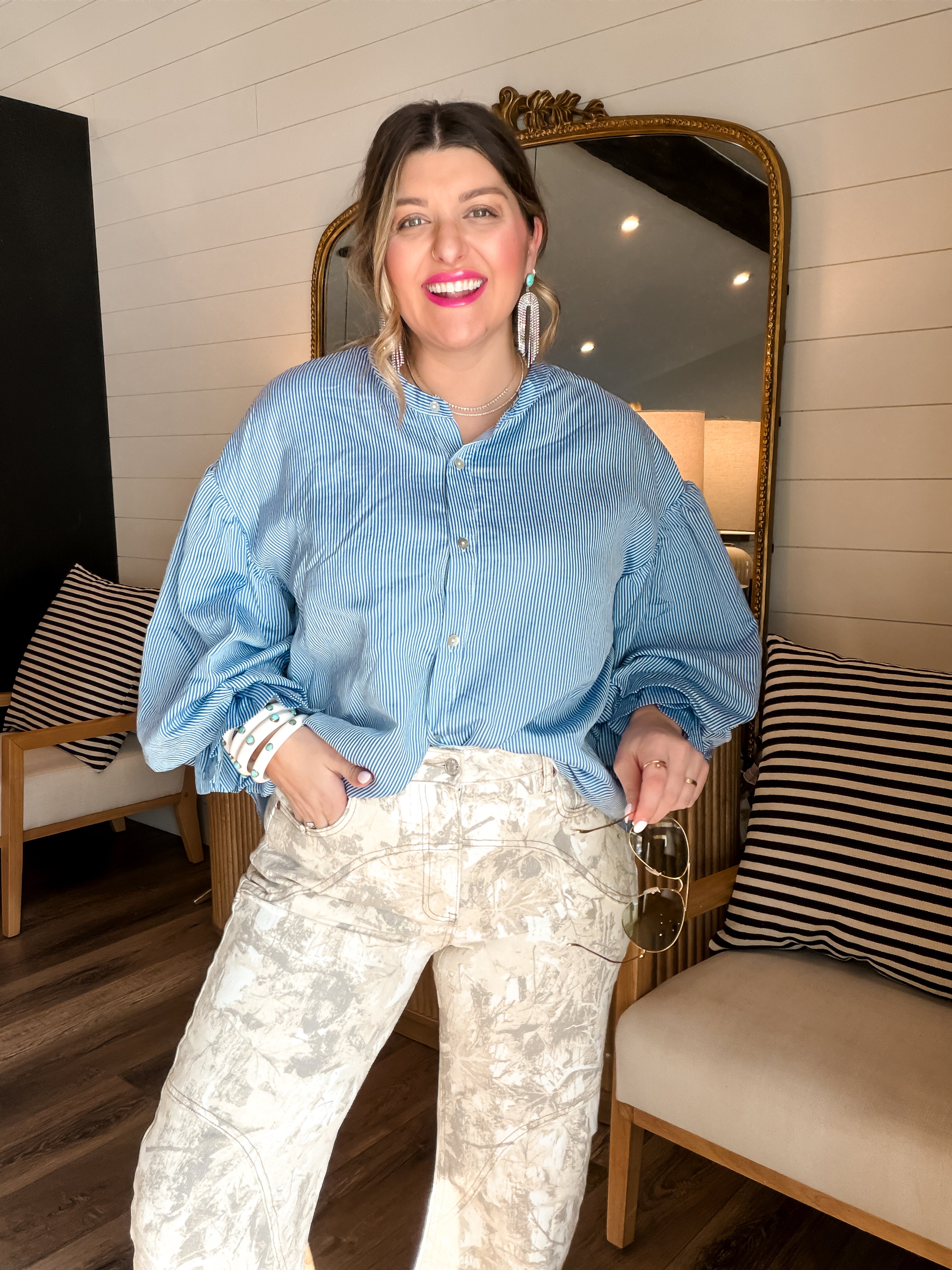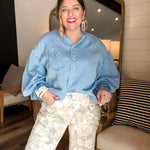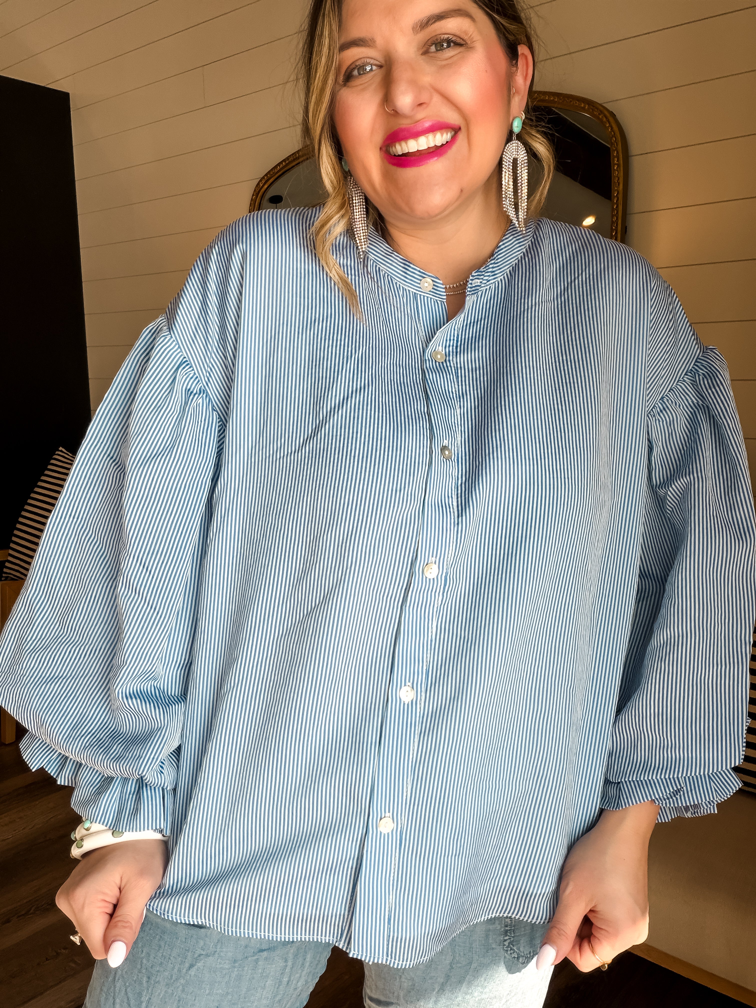Get ready to strut your stuff in the Bubbly Blouse - Pinstripe Blue! This long sleeve button-up adds a pop of playful flair with its chic pinstripes. Perfect for looking sharp while feeling like a million bucks (without the price tag)! Who said you can't mix business with bubbly?