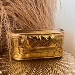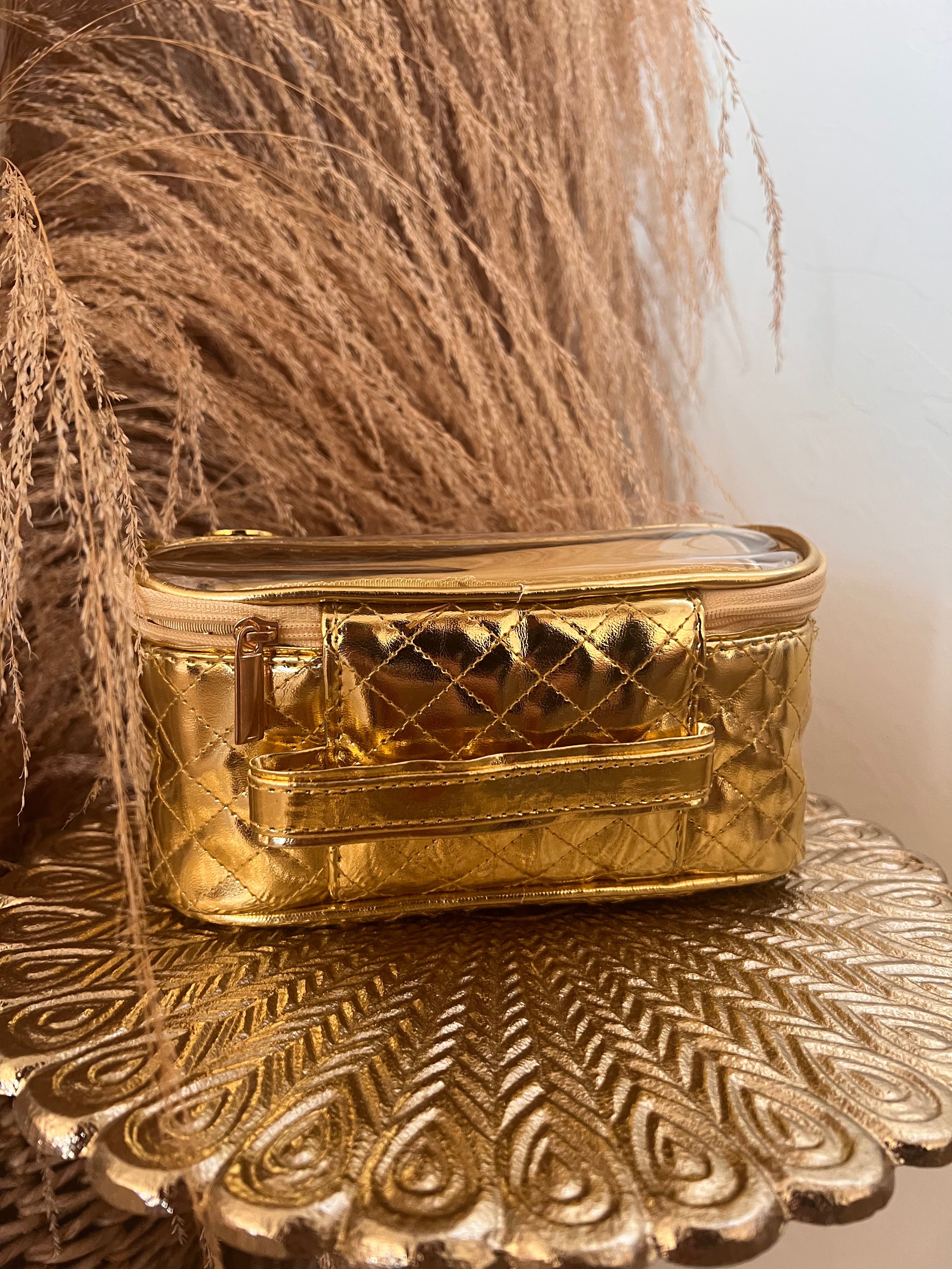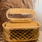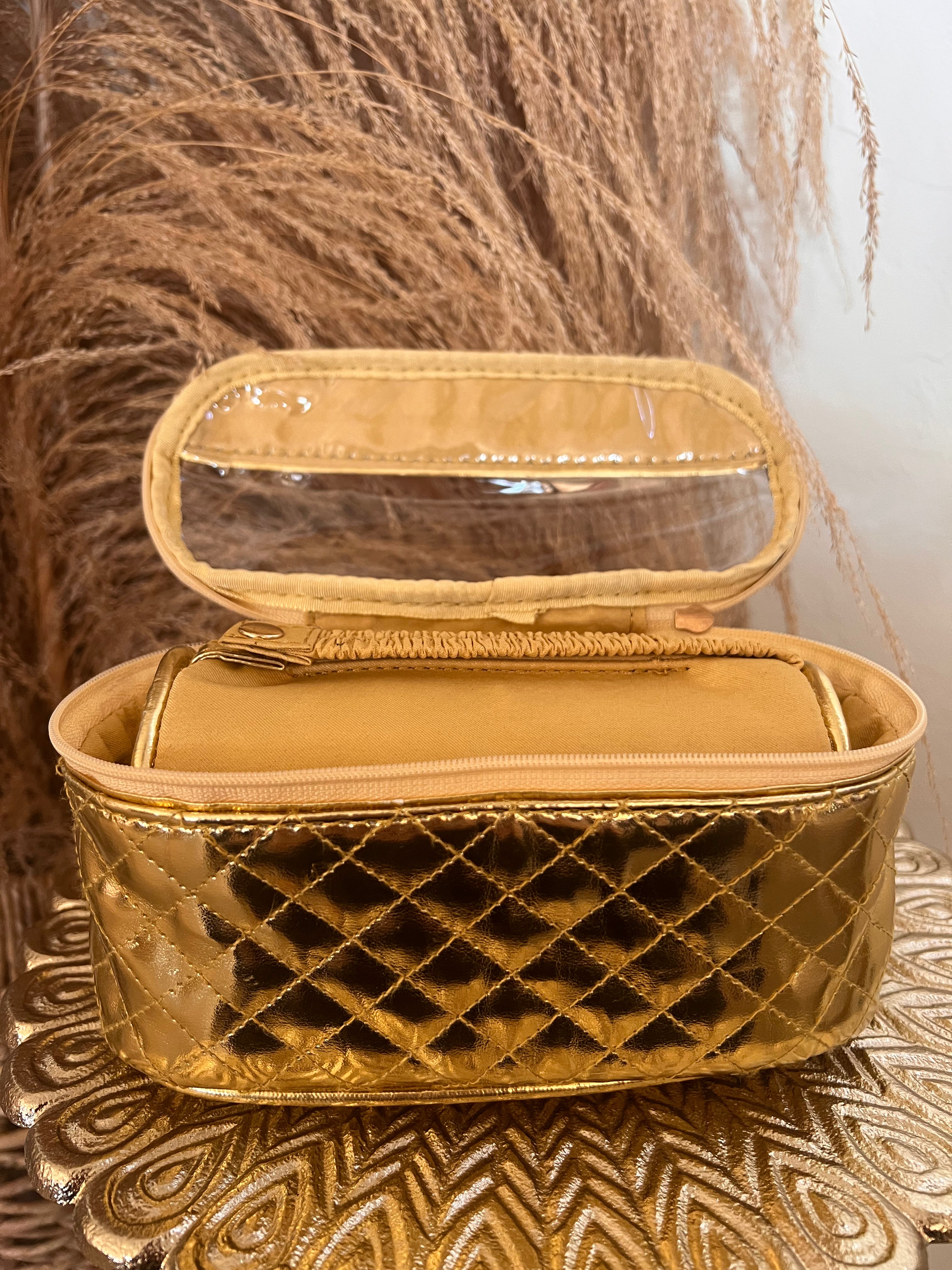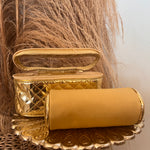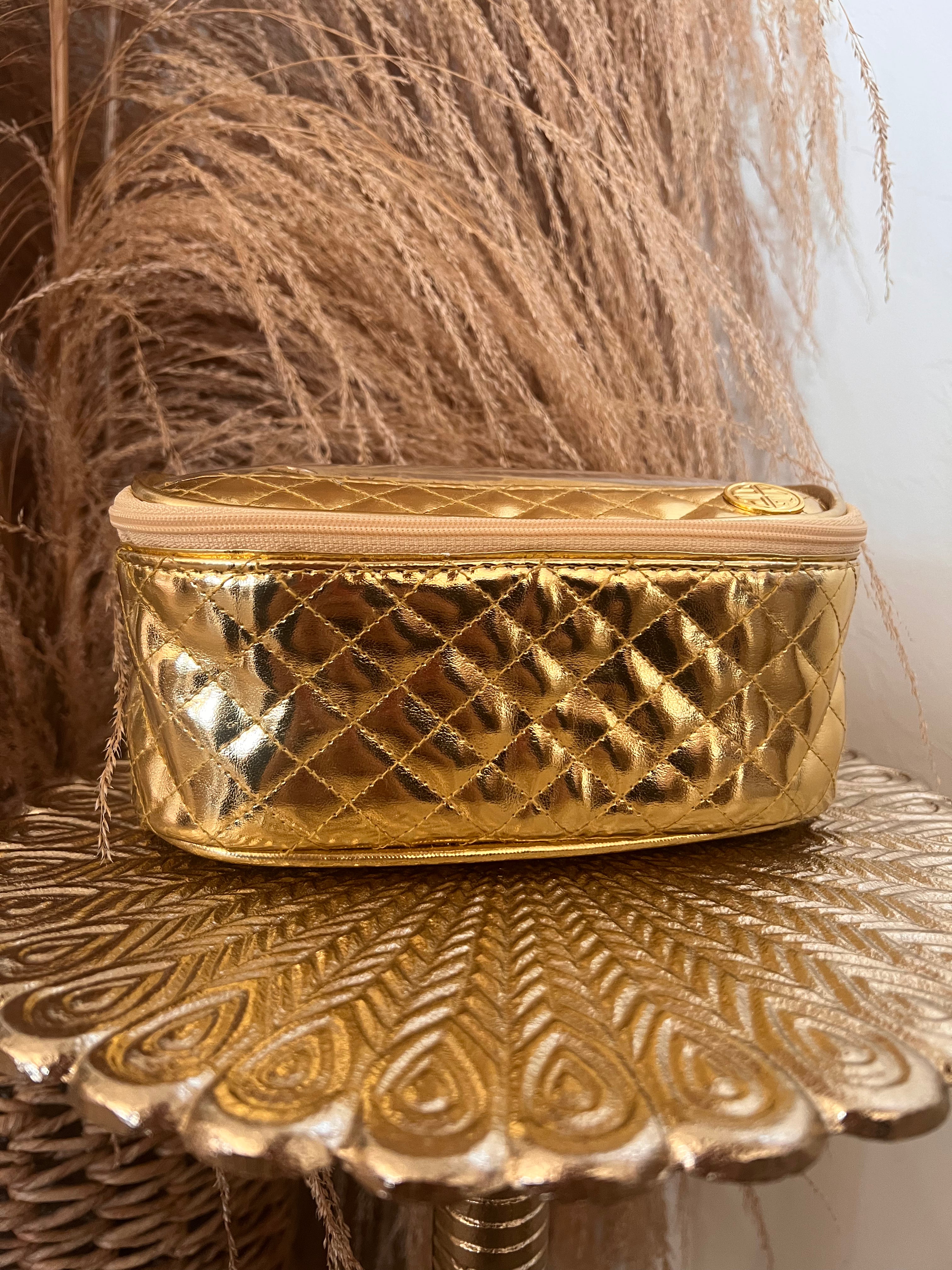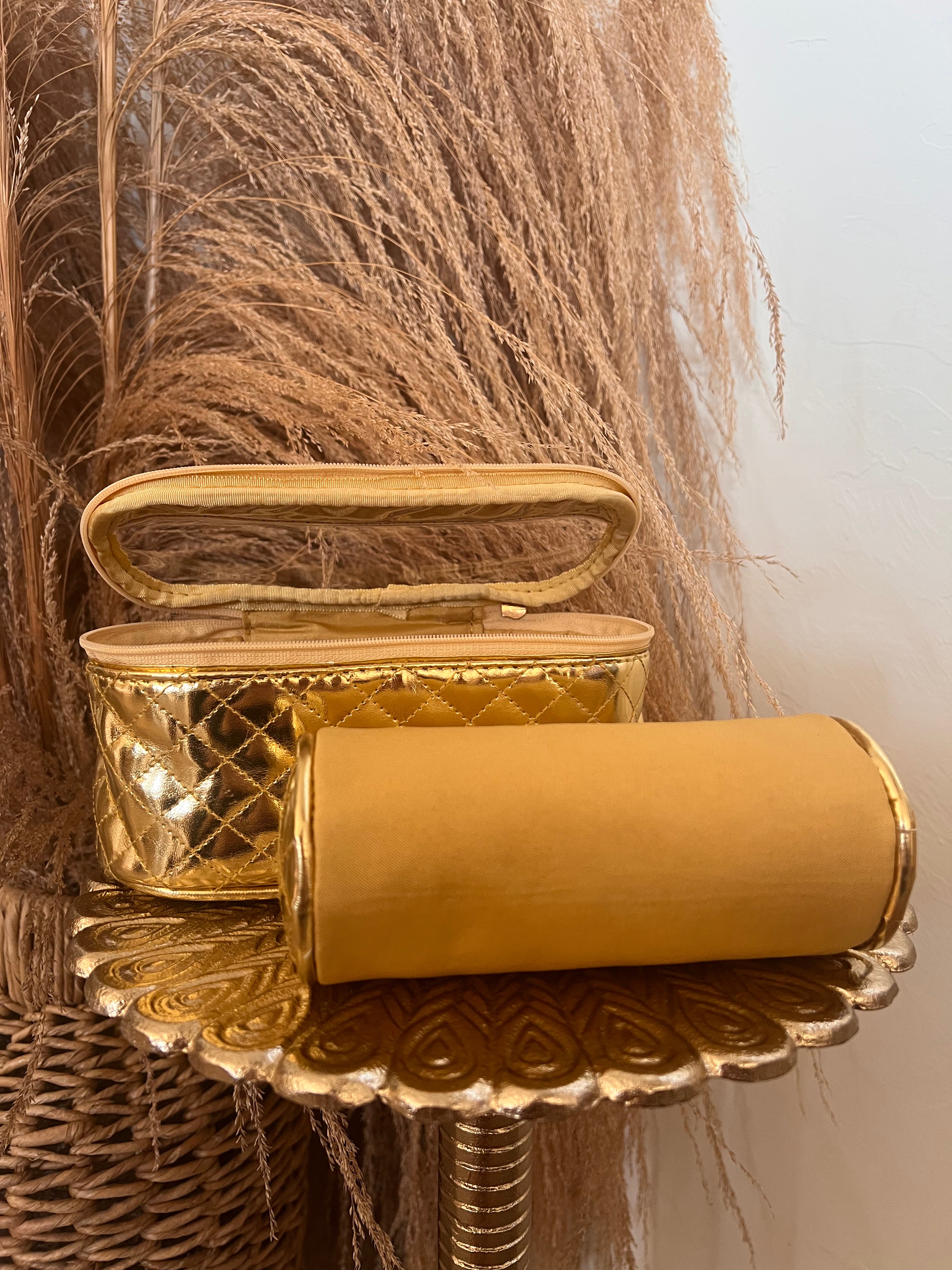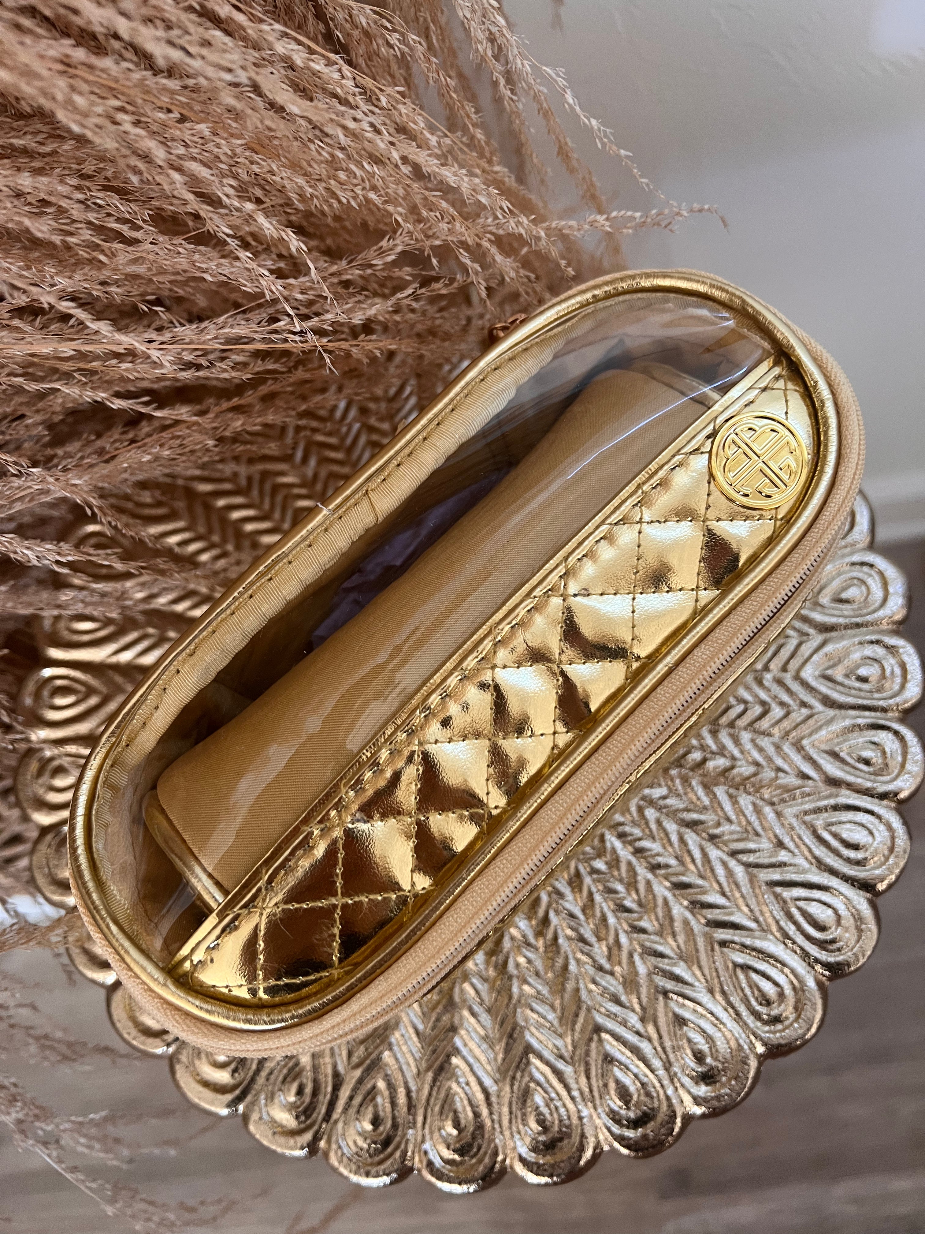 Say hello to your sparkle carry-on. Whether you’re packing for Paris or tossing it in your gym tote, this quilted gold case is the VIP suite your bangles deserve. Lined in signature BuDhaGirl satin with a removable roll for your AWB® collection, it’s the kind of travel upgrade that turns TSA lines into runways. ✈️✨