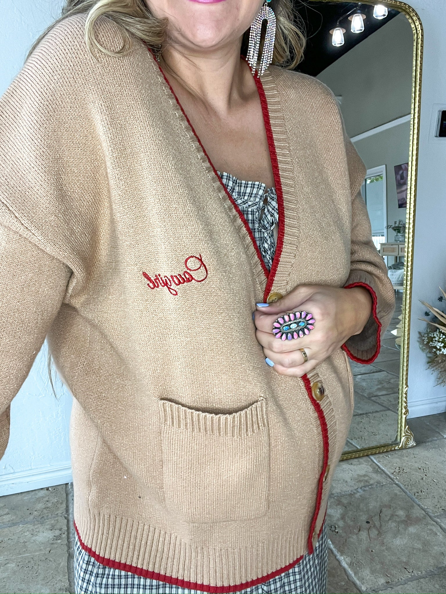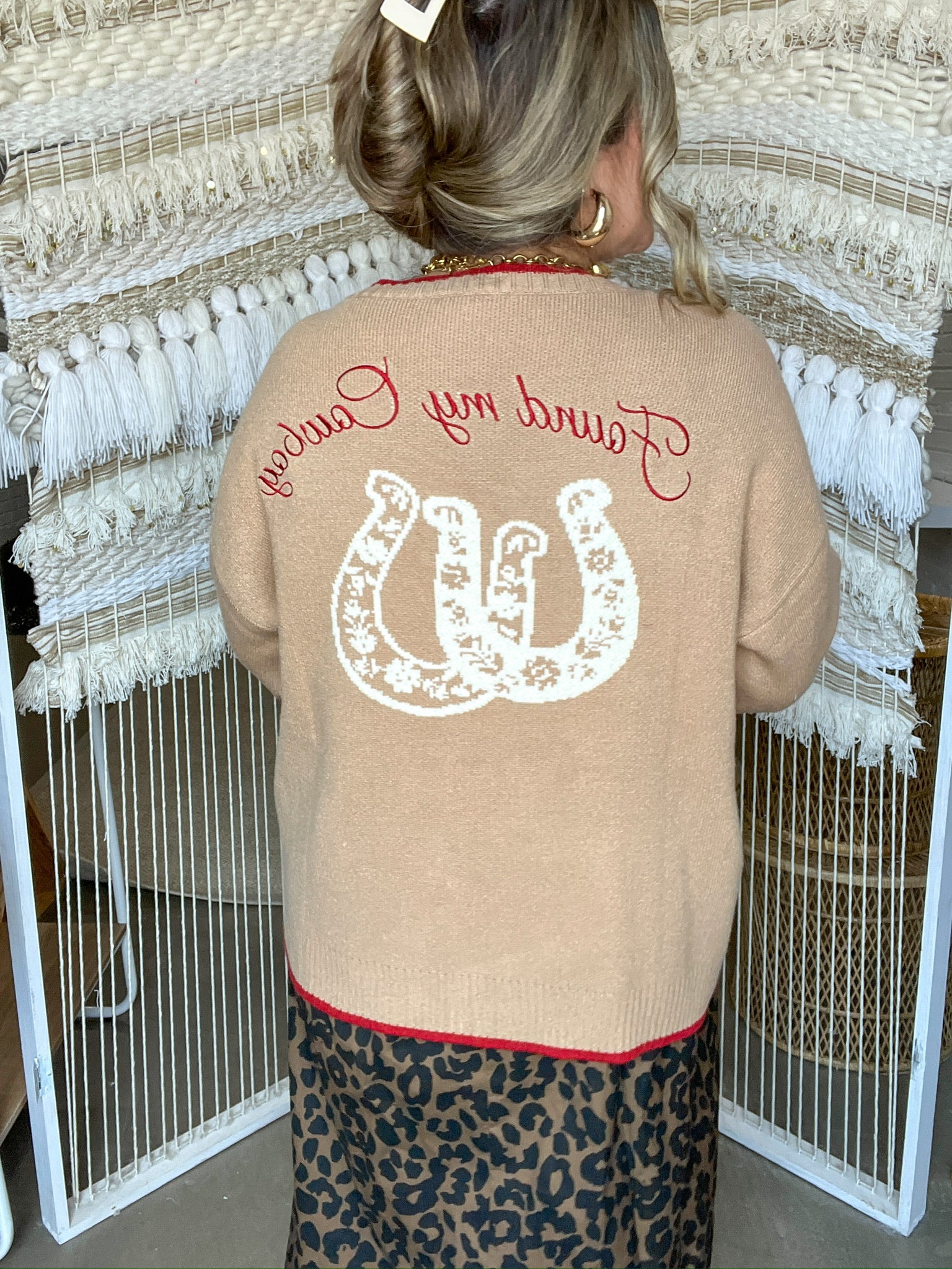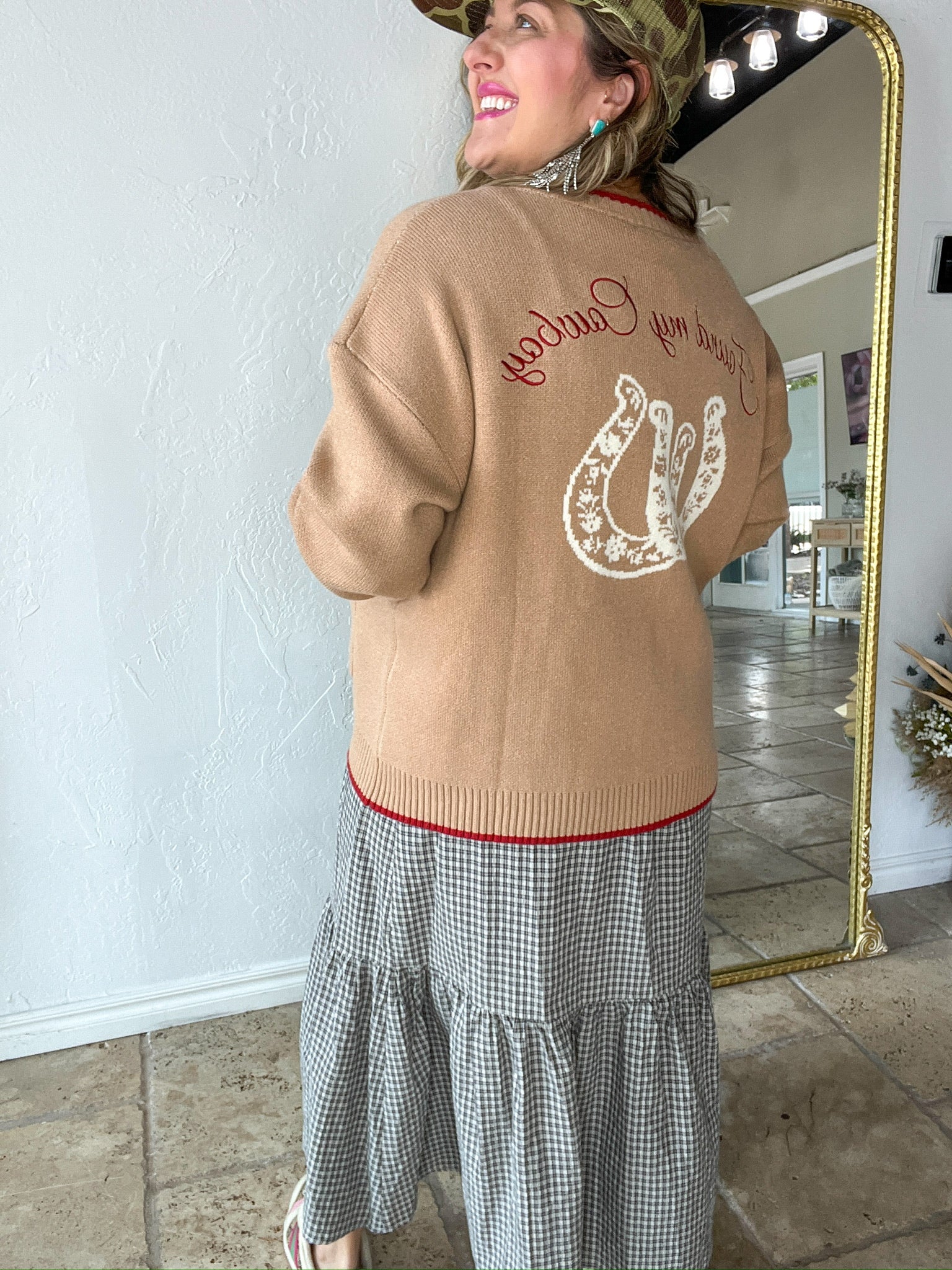 The cozy layer that says it all. Whether you’ve already found your cowboy or you’re manifesting one, this cardigan wraps you in western charm and buttery-soft warmth. With bold lettering and a floral horseshoe graphic on the back, it’s the cutest statement piece for fairgrounds, concerts, or just feelin’ flirty.
