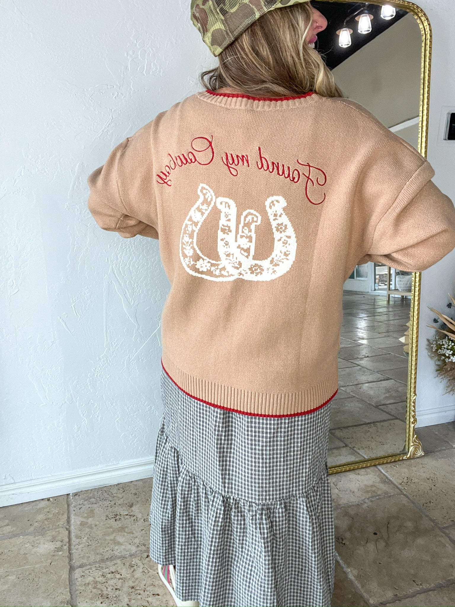 • “Found My Cowboy” script and floral horseshoe knit into the back