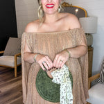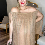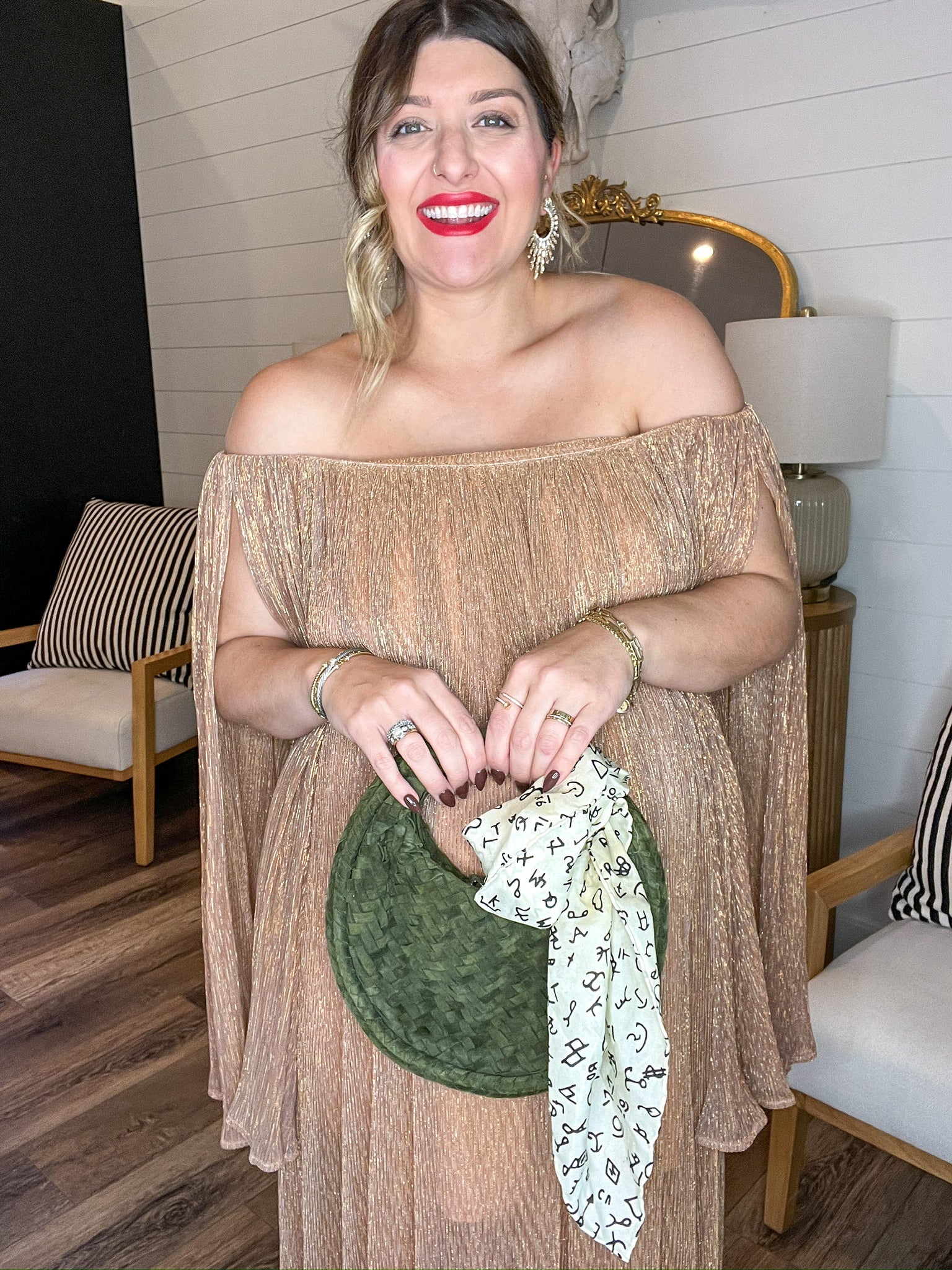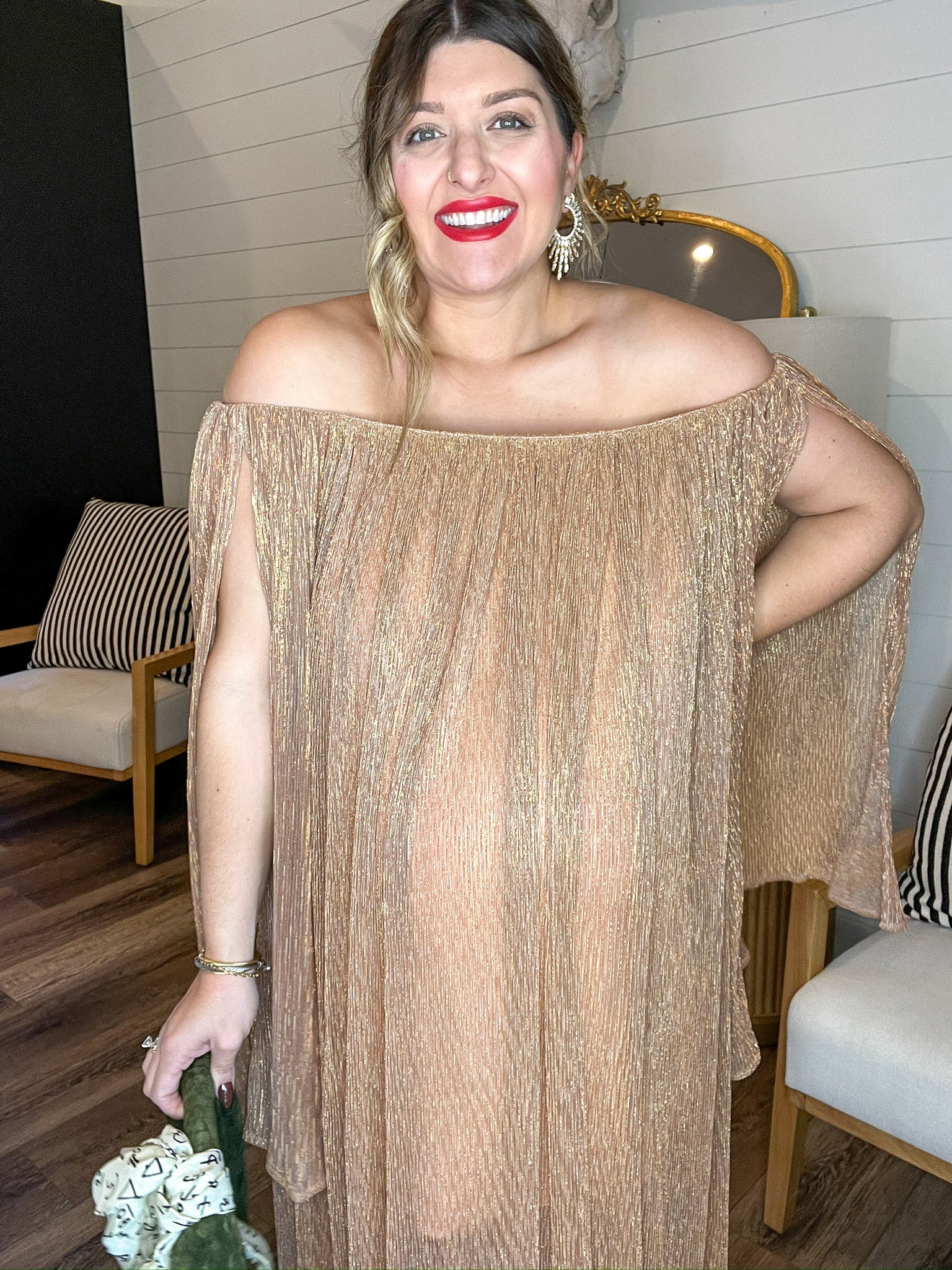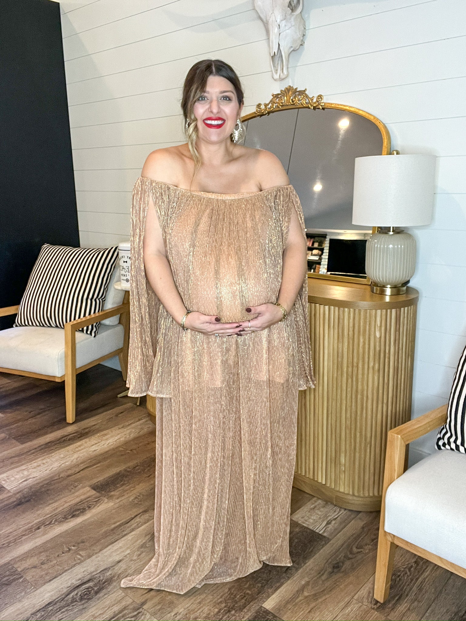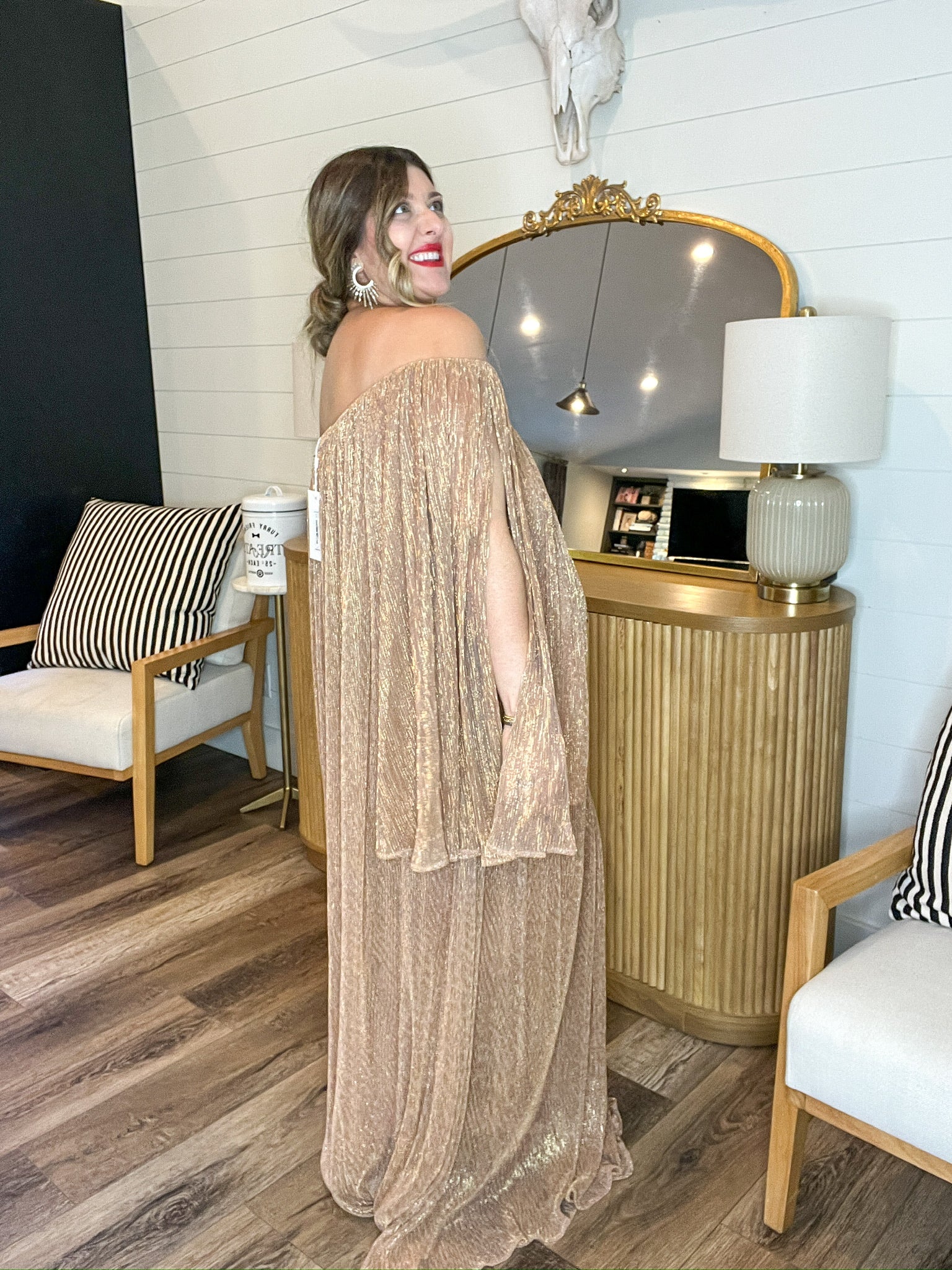 The Corinthia gown in gold is a stunner with its pleated metallic fabric. Off-shoulder styling recalls the draped beauty of ancient Corinth, perfect for nights by the gulf that call for a touch of shimmer.