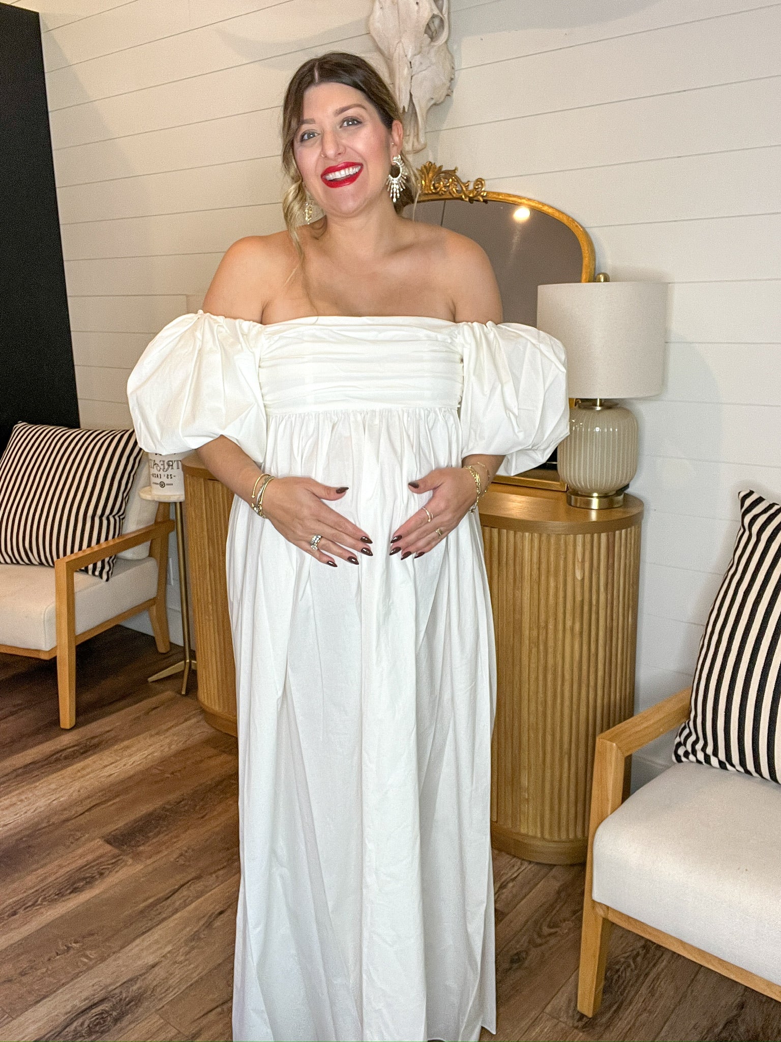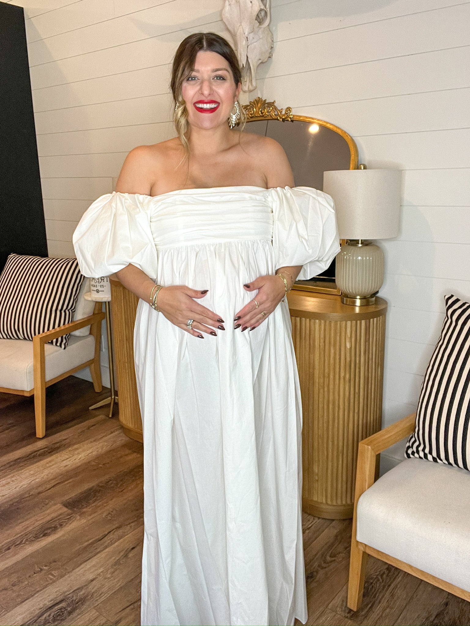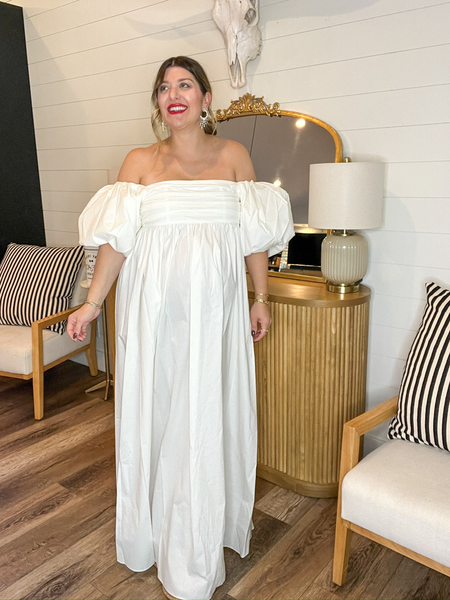 Solid stretch cotton. Off-the-shoulder sleeves. Empire waist. Maxi length.
