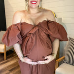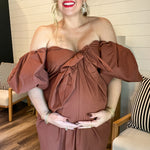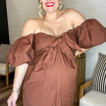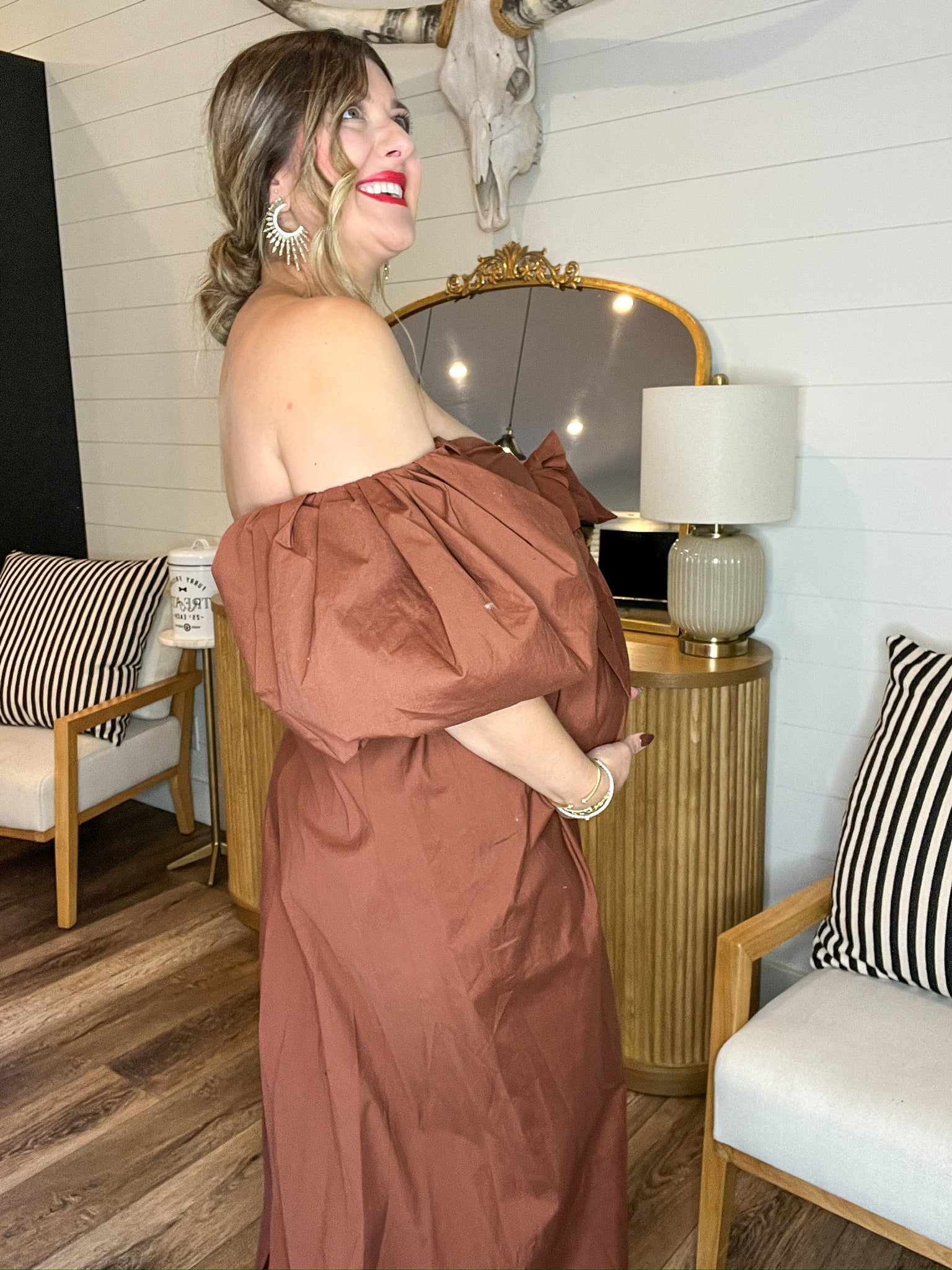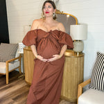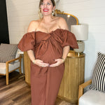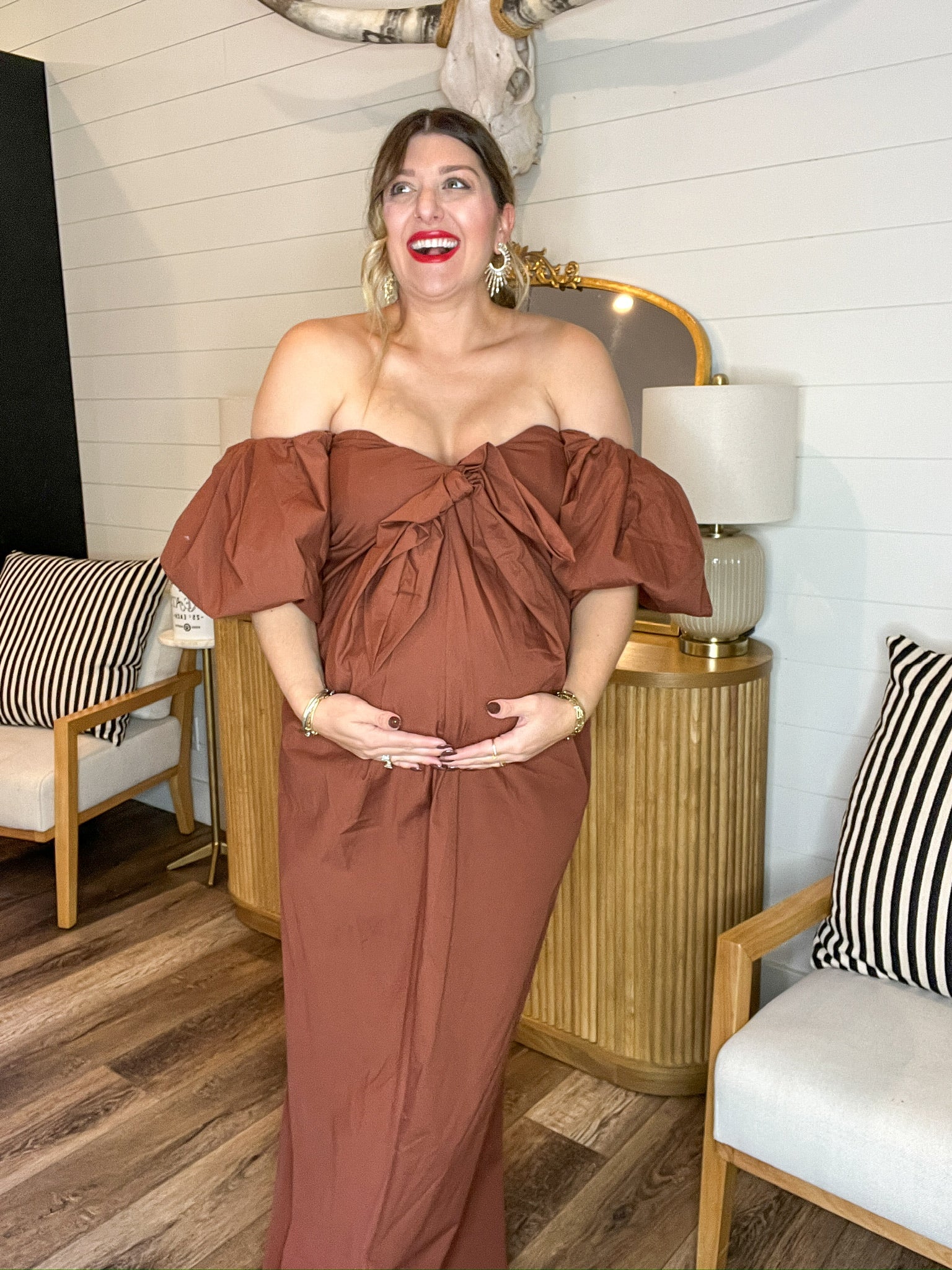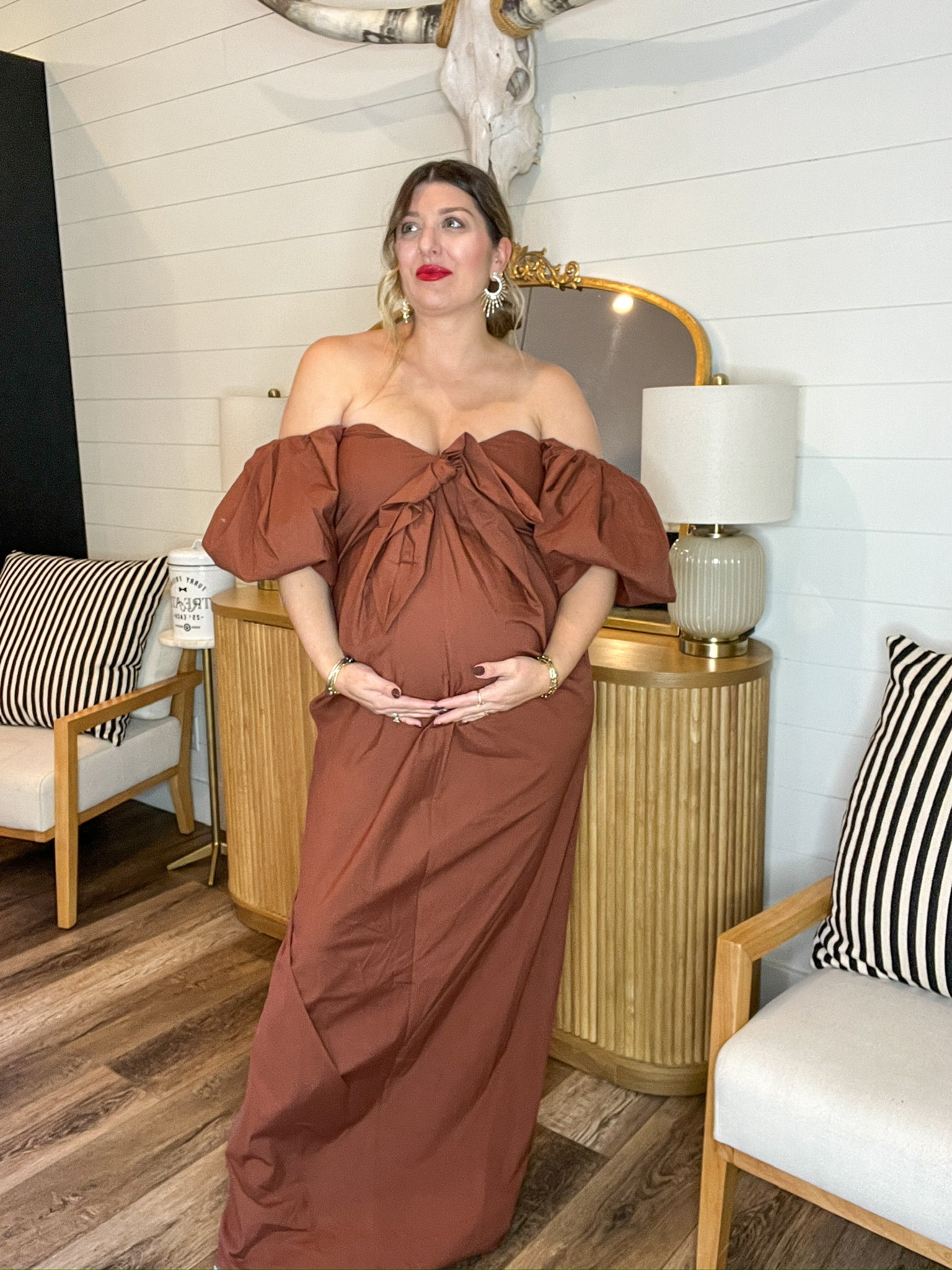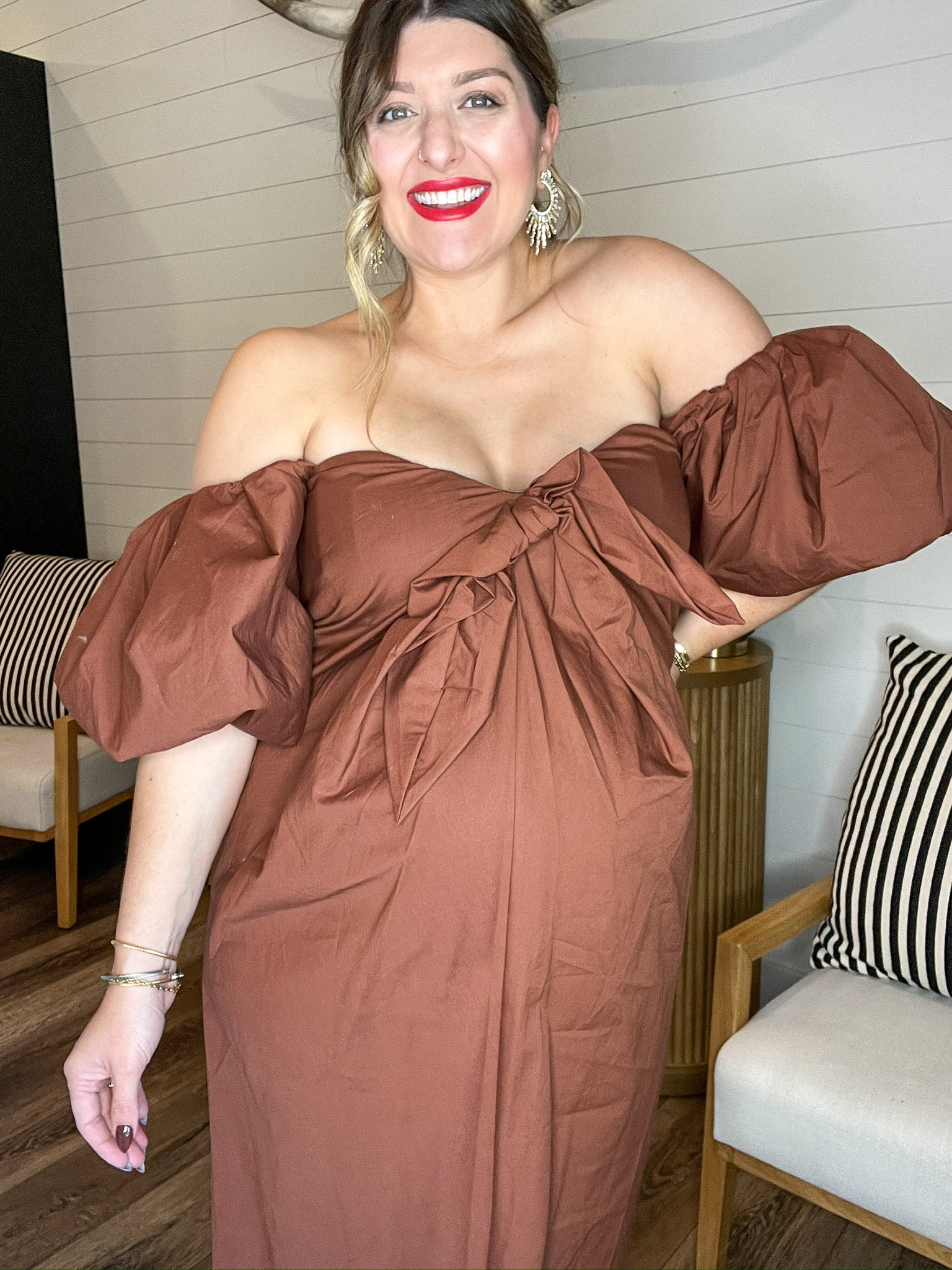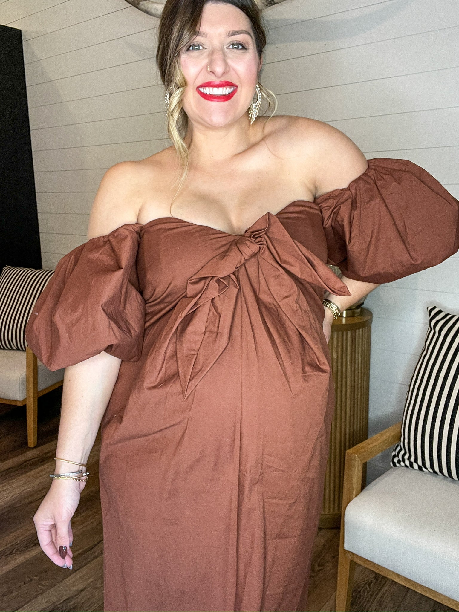Rich in tone and statuesque in form, the Reyna Dress is a vision of quiet strength. The tie-front bodice and sleek column silhouette evoke the grace of ancient sculptures, made for evenings spent wandering marble halls and tracing history with every step.
