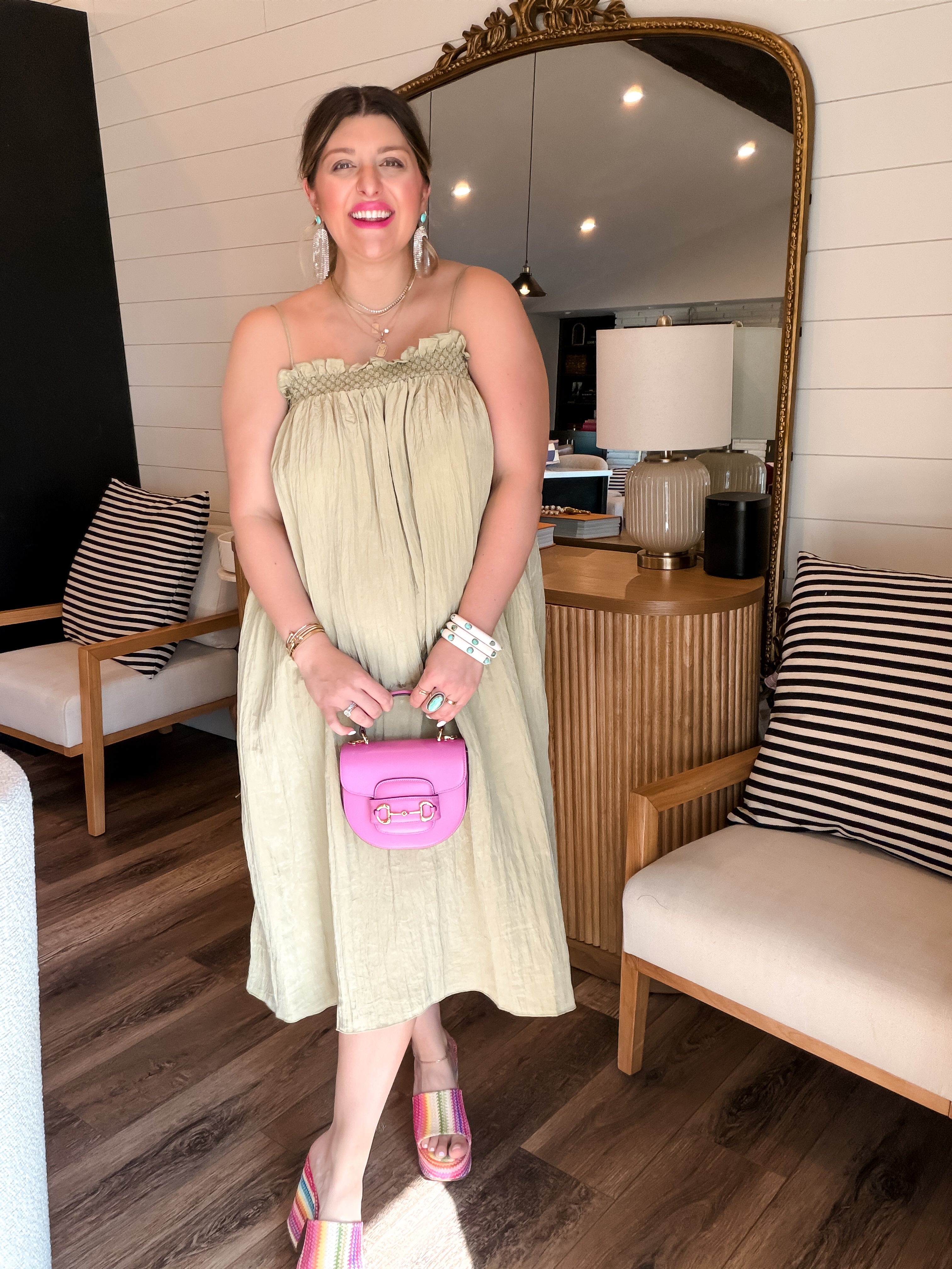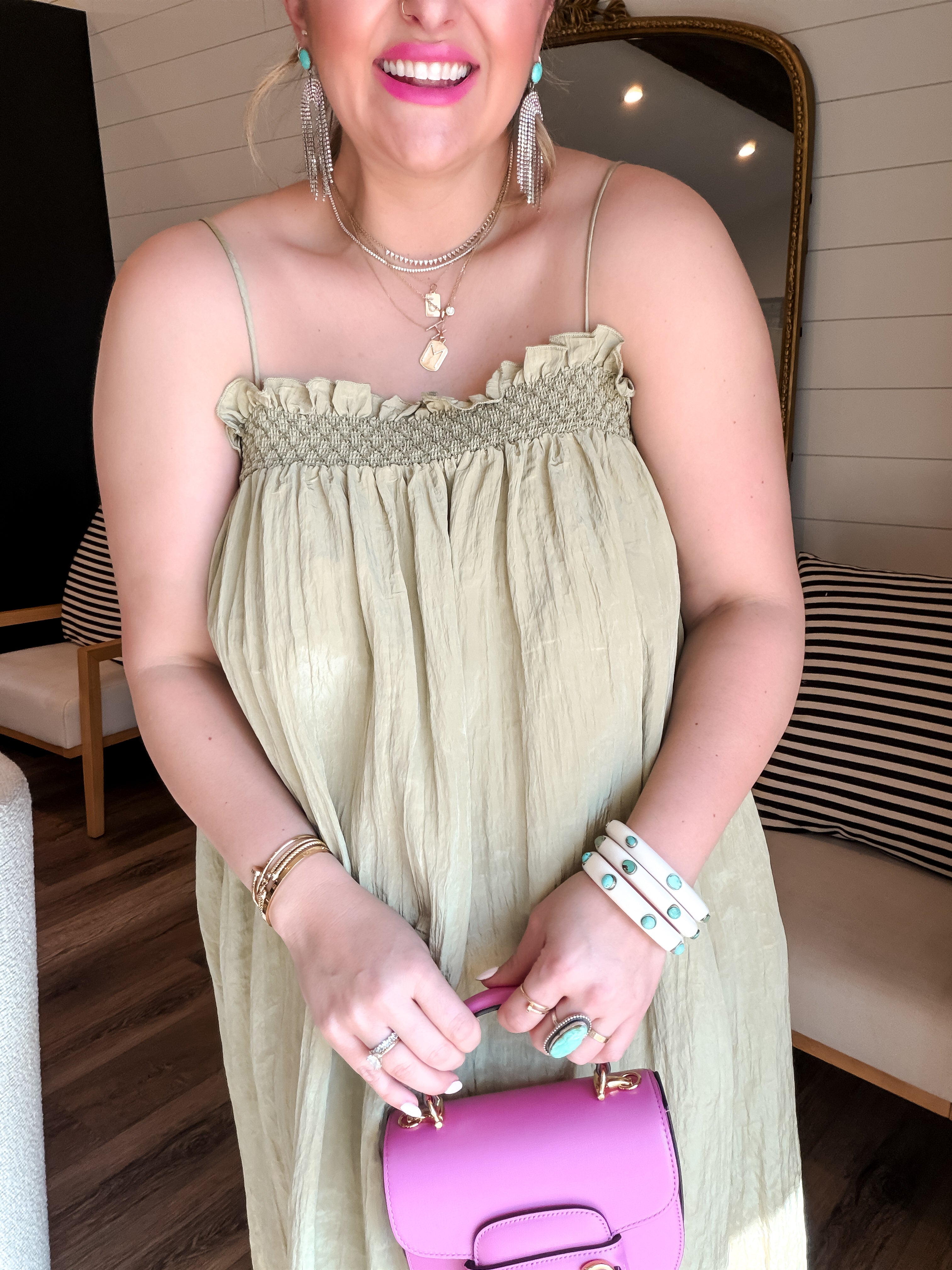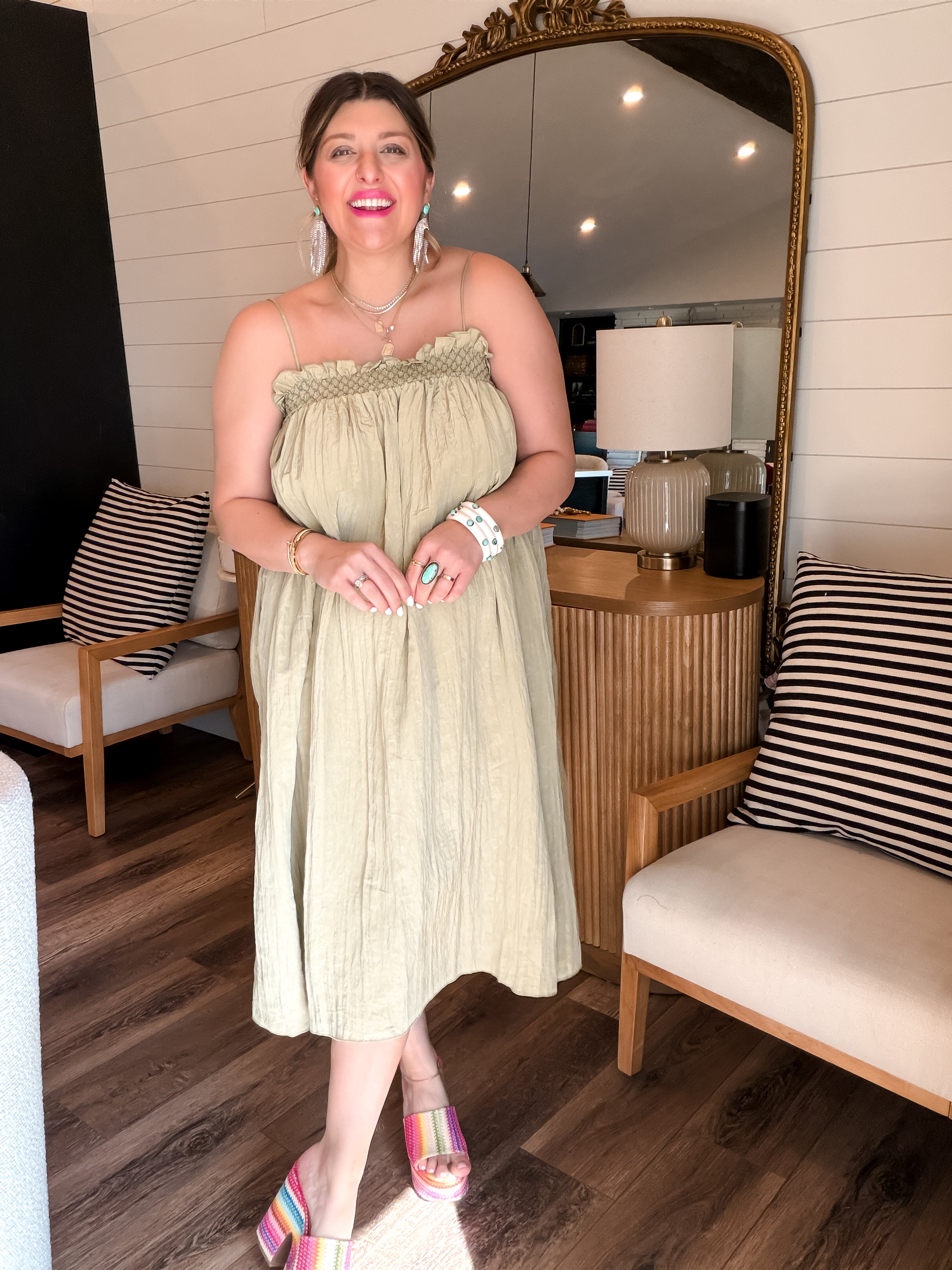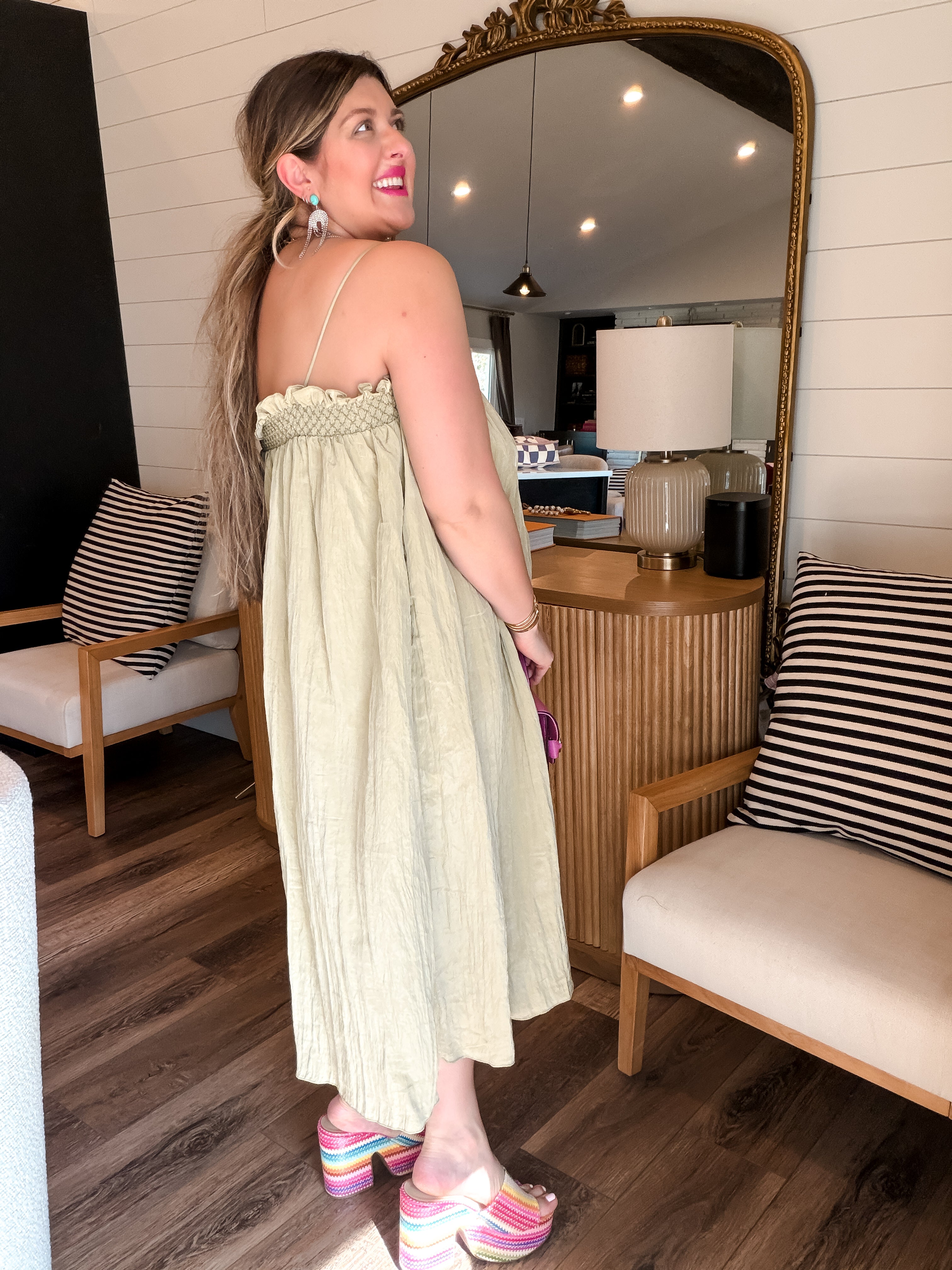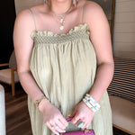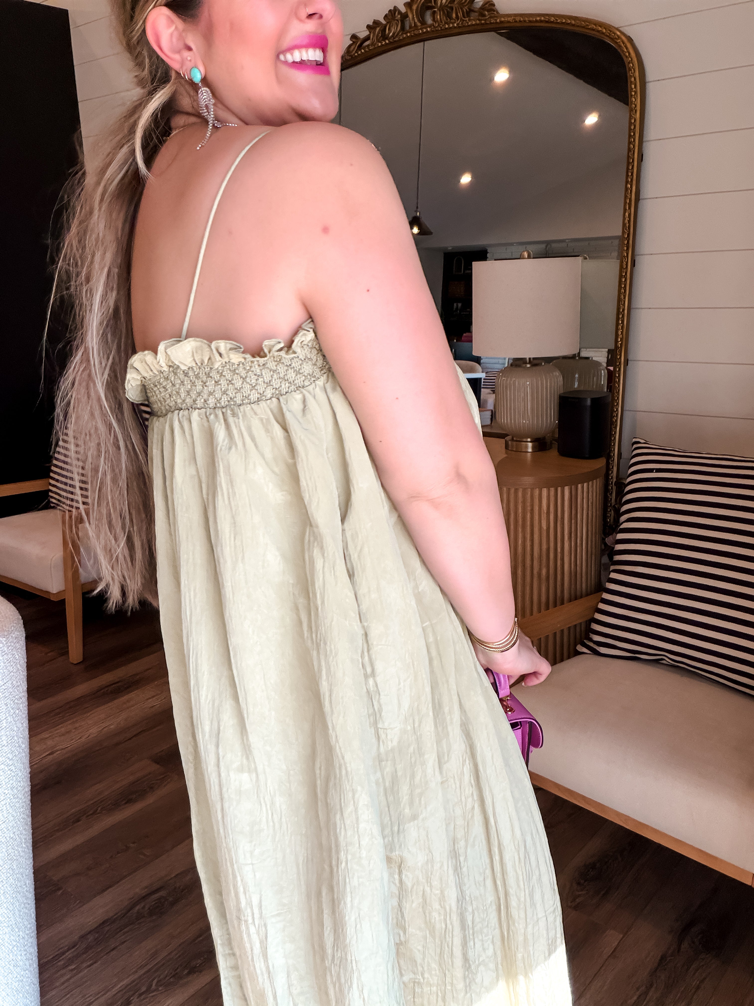 This stunning green maxi dress features a soft crinkle texture that flows beautifully with every step. Designed with a delicate ruffle neckline for a feminine touch, it’s effortlessly chic and endlessly flattering. Perfect for brunch dates, spring events, or any moment you want to feel pretty and polished.
