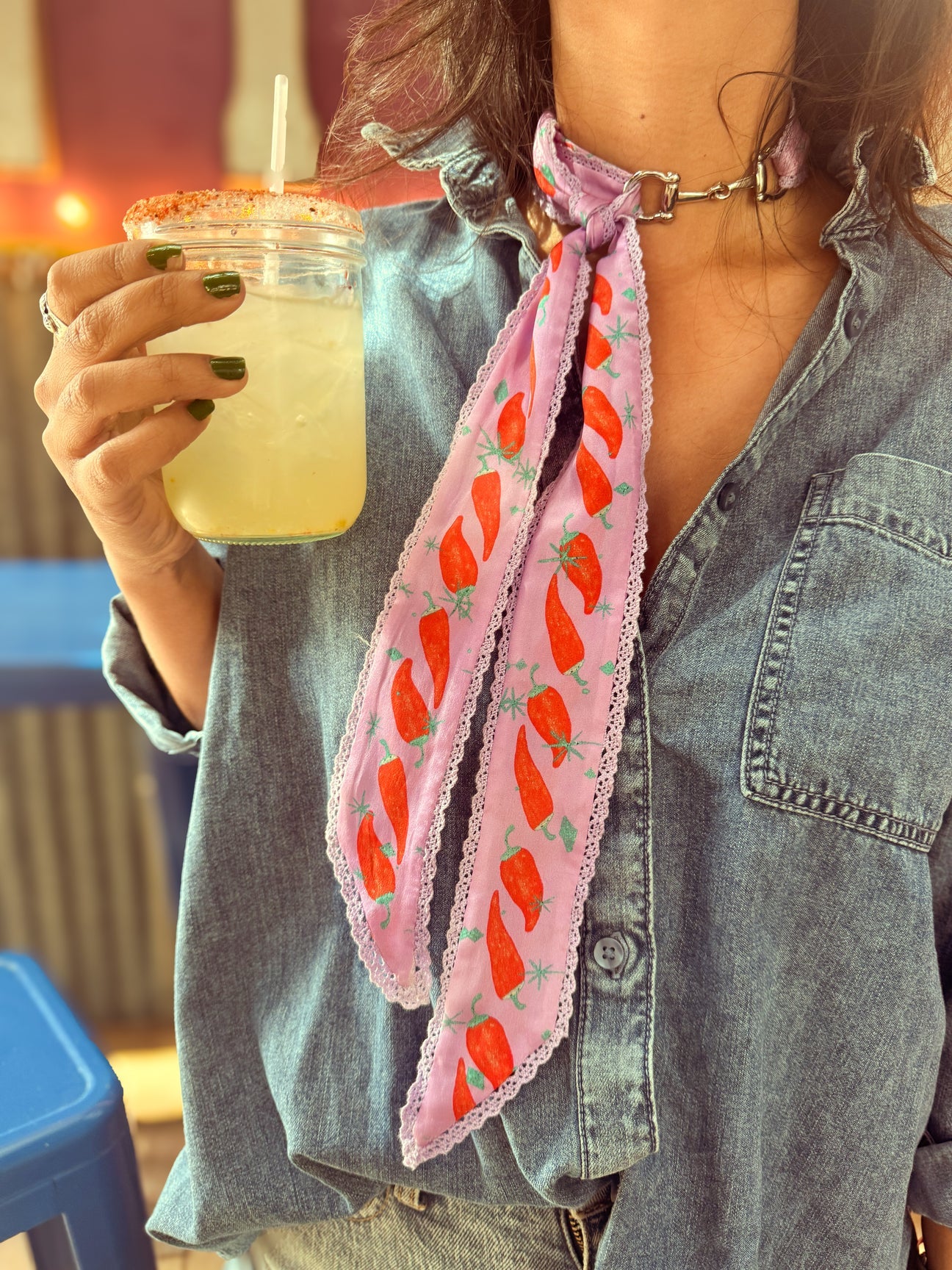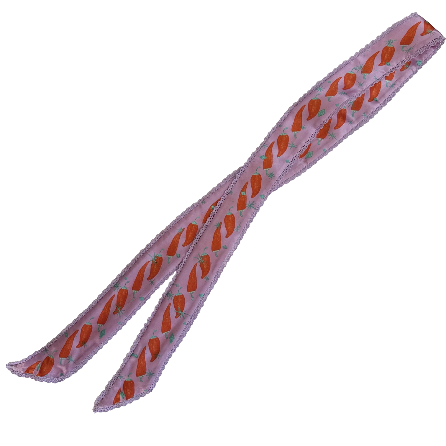 Hand drawn art on a beautiful silk twilly with a crochet trimmed edge.