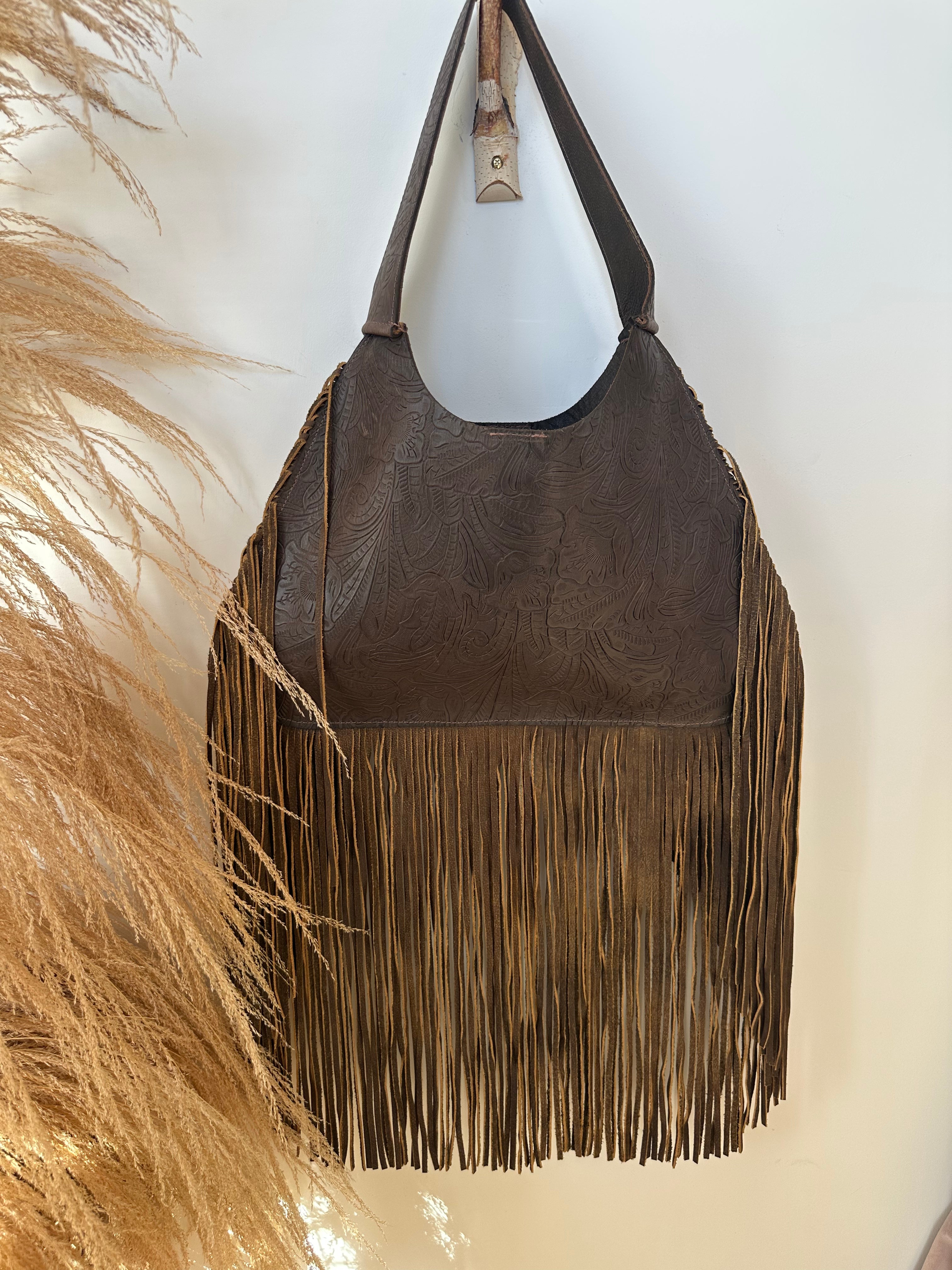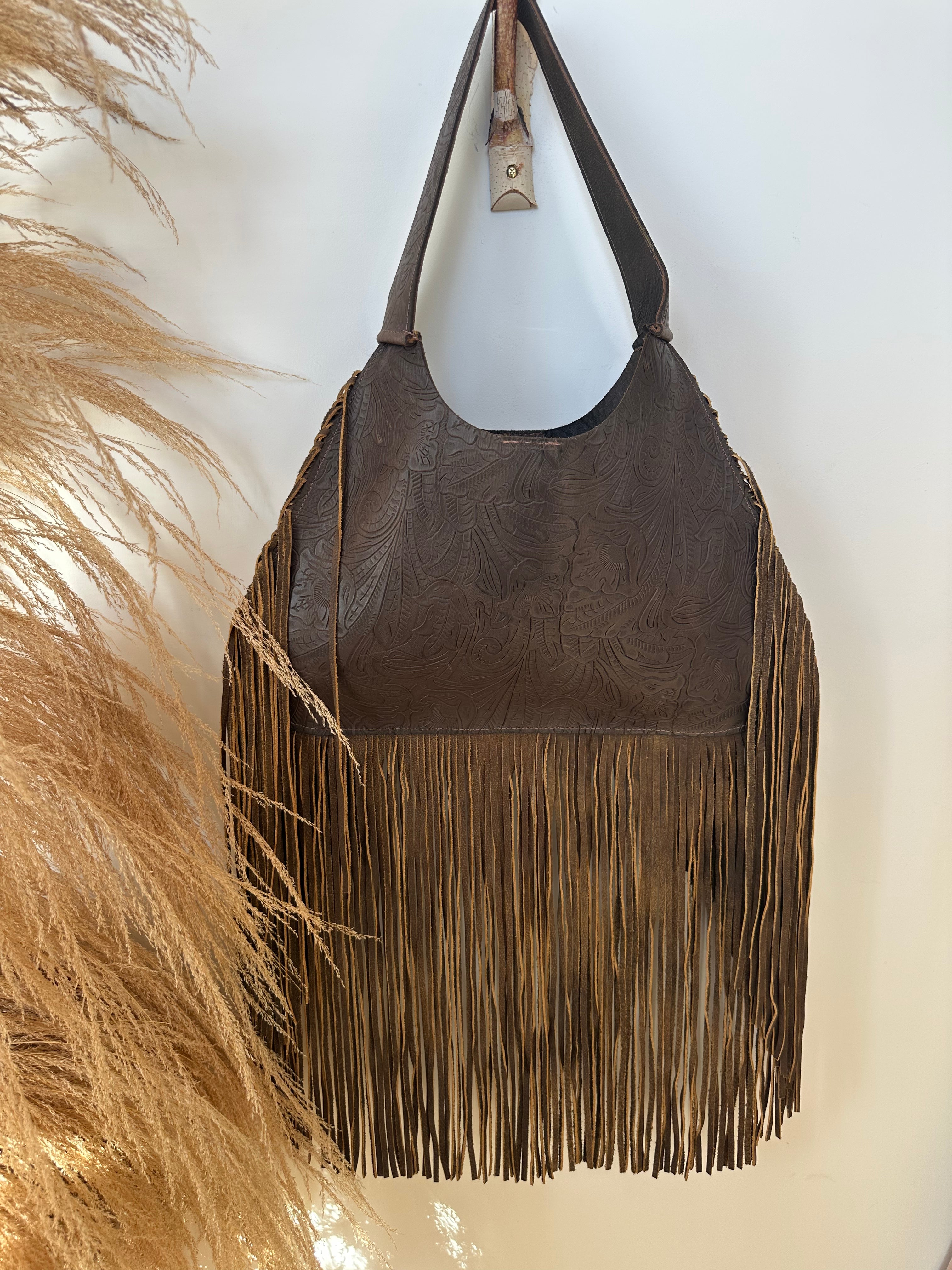 Meet your new ride-or-die bag — the Chocolate Brown Fringe Tooled Bag. She’s western soul meets boho edge, handcrafted in rich, chocolatey leather with intricate tooling that adds just the right amount of sass. And those long, swishy fringe details? Straight-up showstoppers.