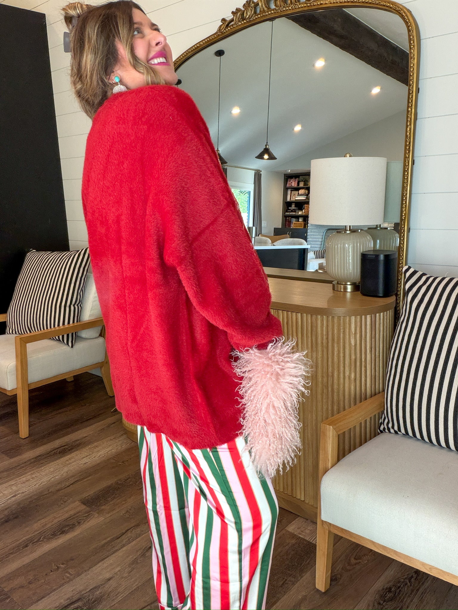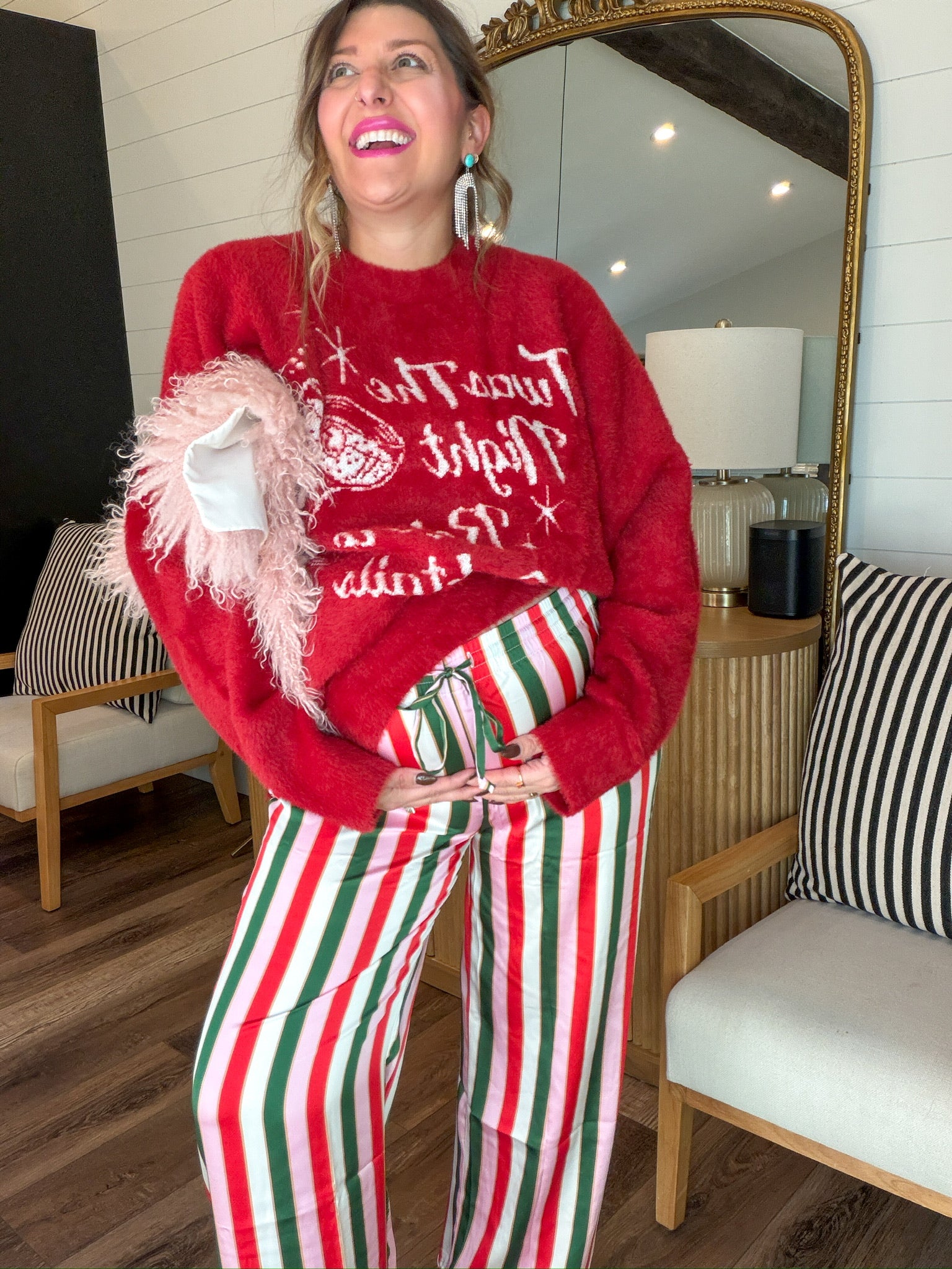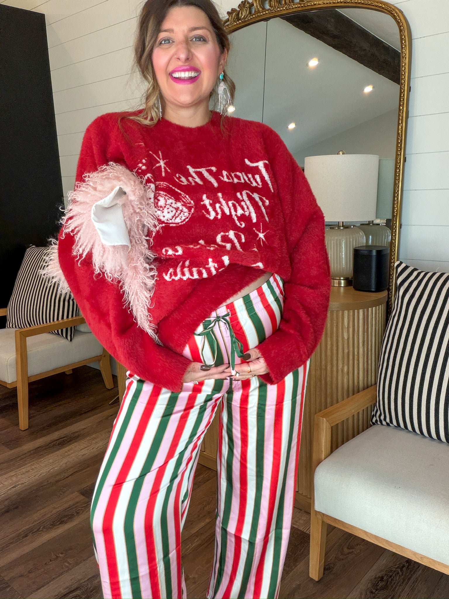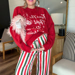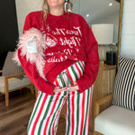 It’s beginning to look a lot like cocktails in this cozy crew sweater featuring a cheeky holiday graphic. The perfect mix of festive and fun, wear it casual with Mumu denim and boots or dress it up with a cute mini and heels for your next holiday happy hour!