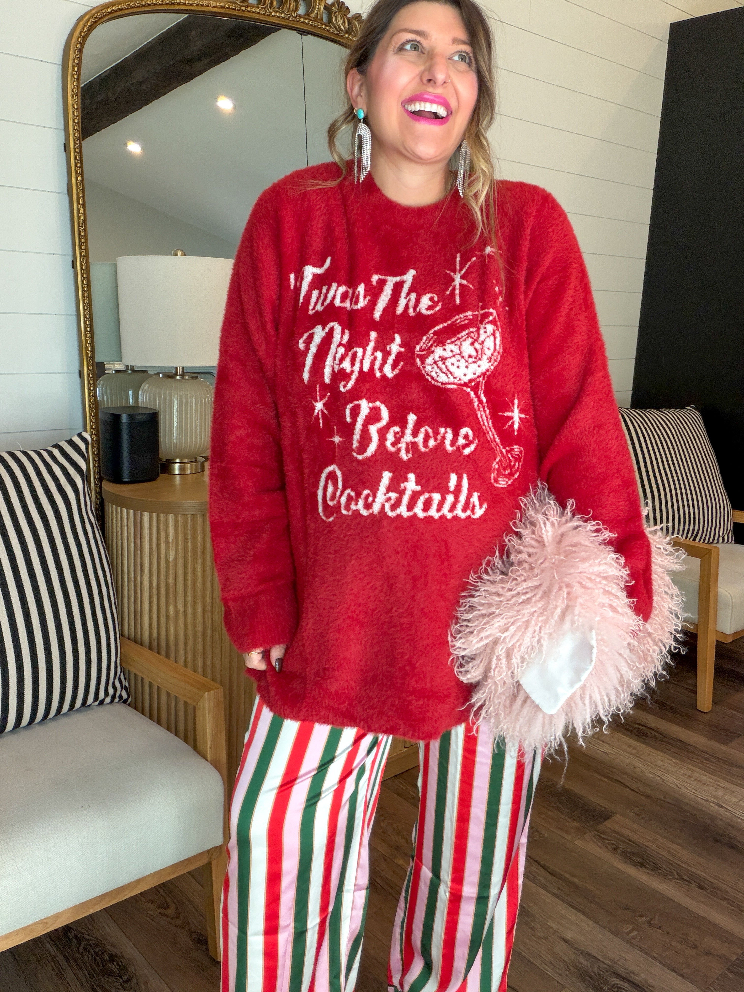 It’s beginning to look a lot like cocktails! The ‘Twas The Night Sweater from Show Me Your Mumu is your festive go-to for holiday cheer — cozy, cheeky, and just the right amount of extra. With its fuzzy knit texture and playful holiday graphic, it’s basically Christmas party perfection in sweater form.