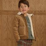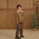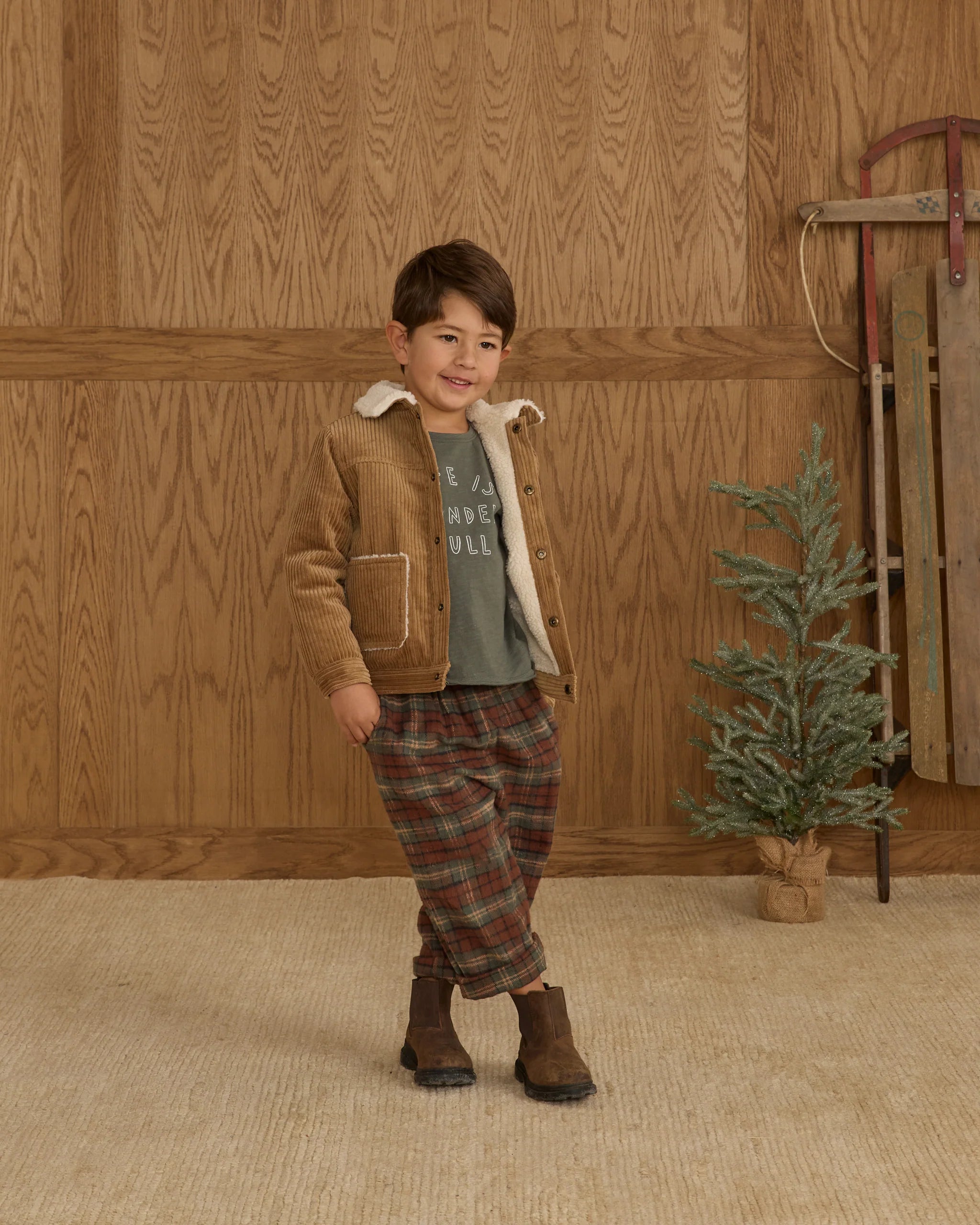 Our Corduroy Jacket brings warmth and classic style to chilly days. Designed with a cozy shearling collar, functional front pockets, and finished with brass shank buttons down the front.