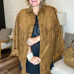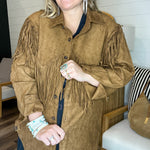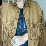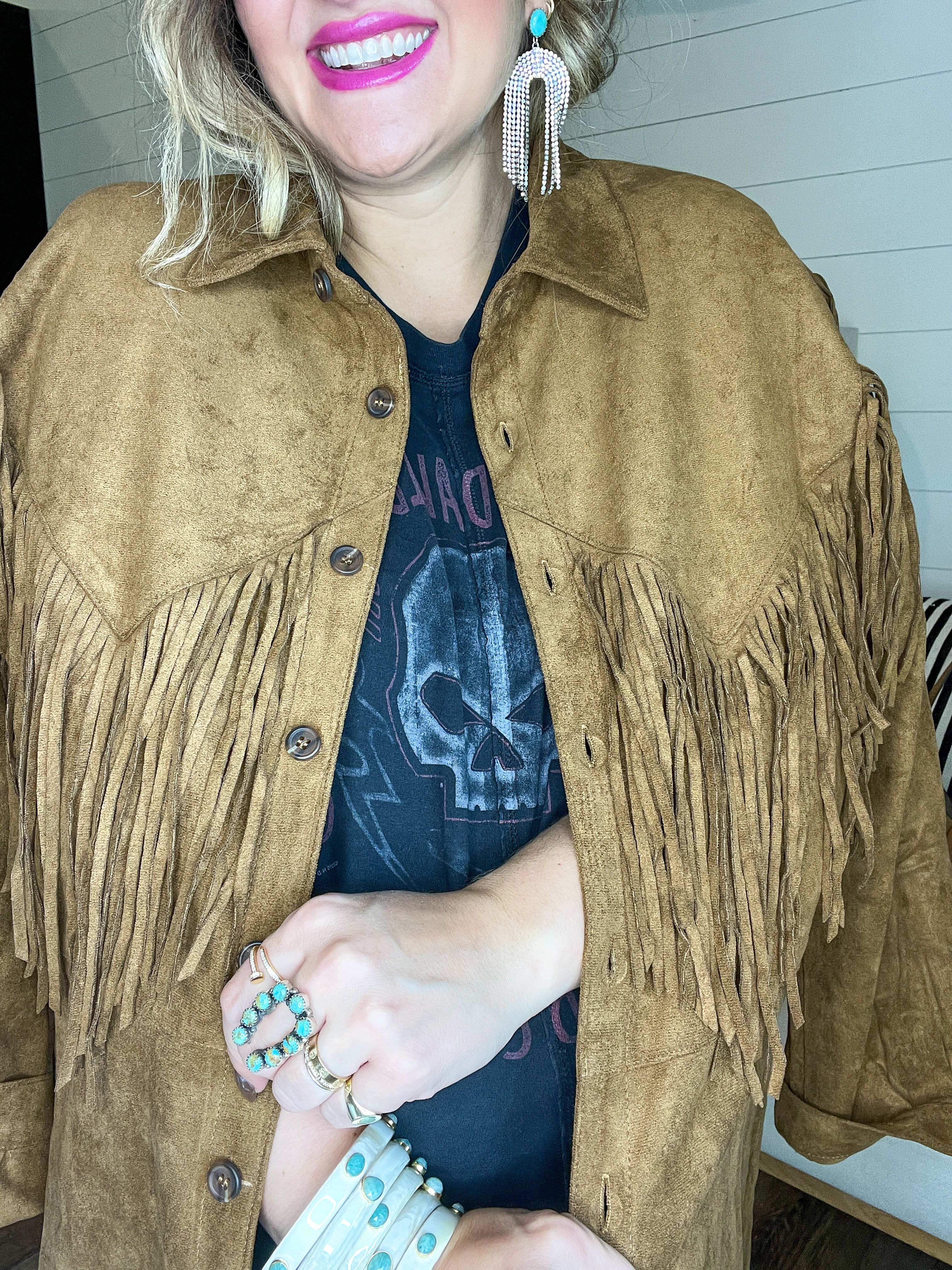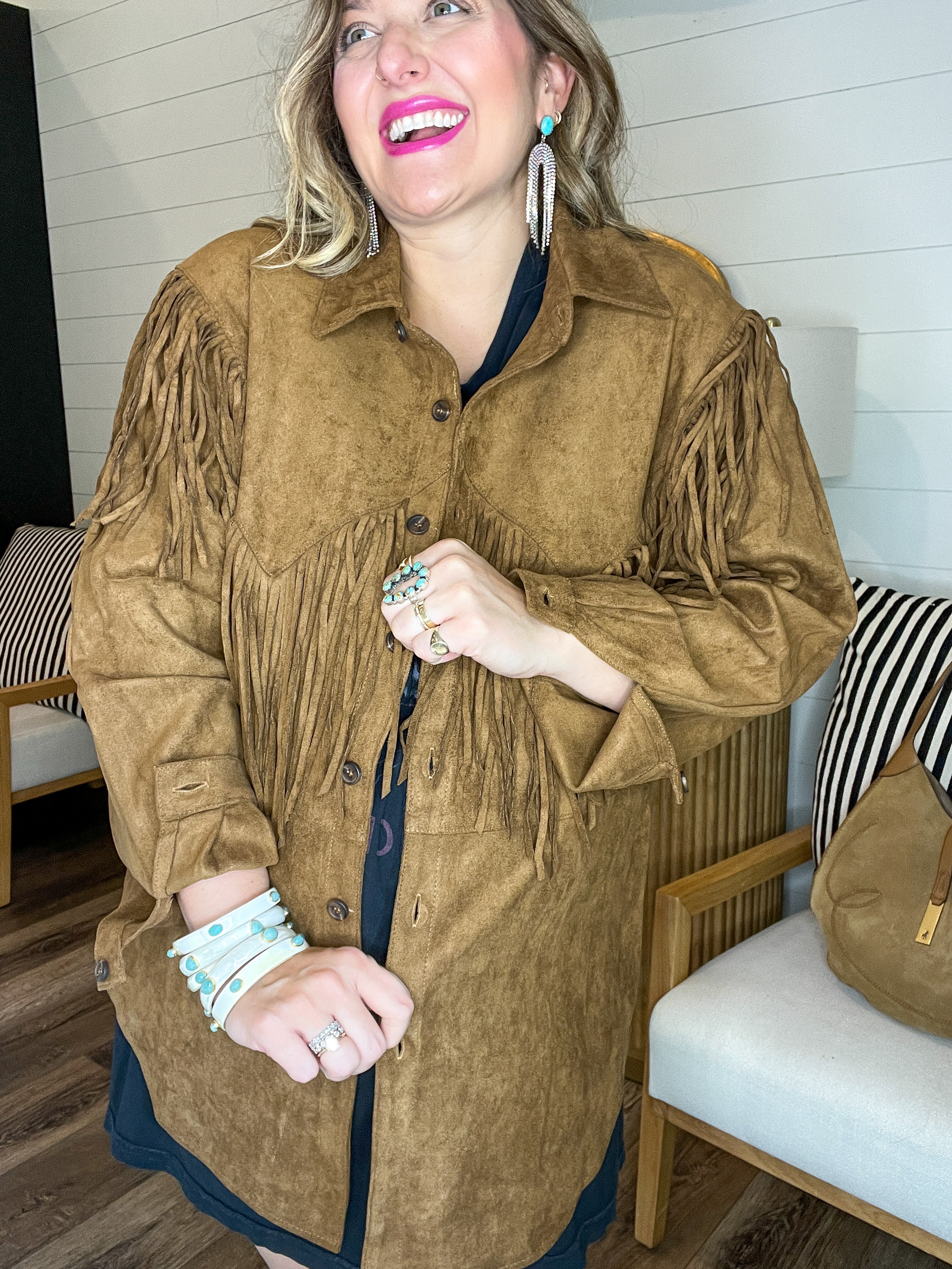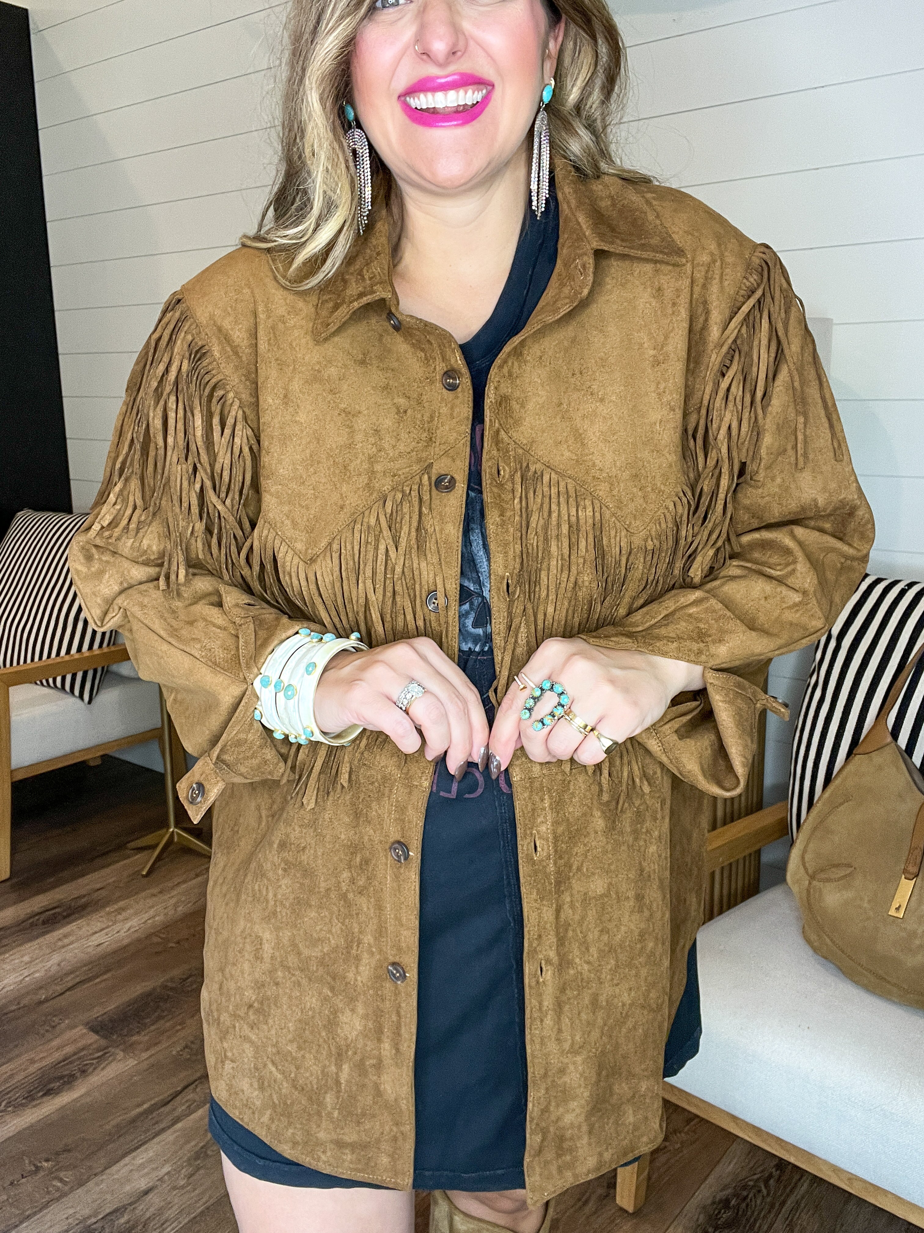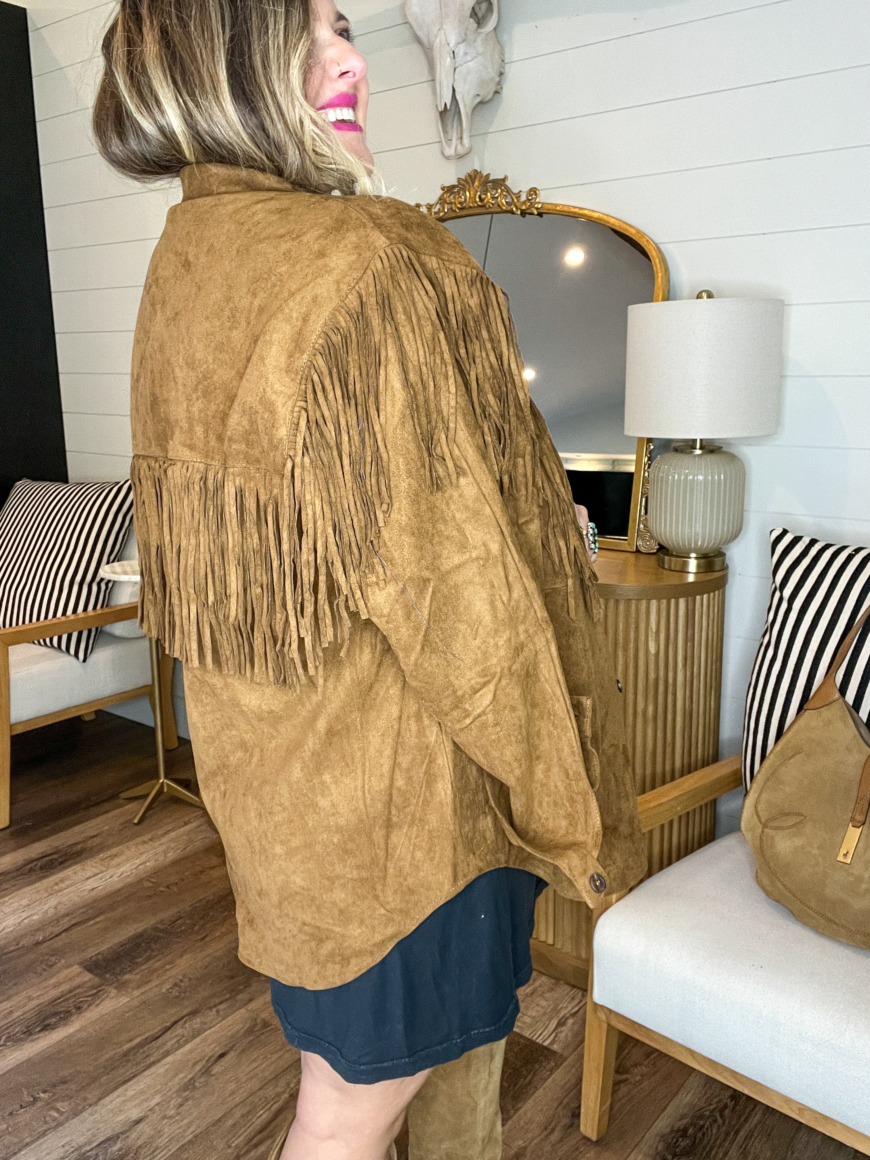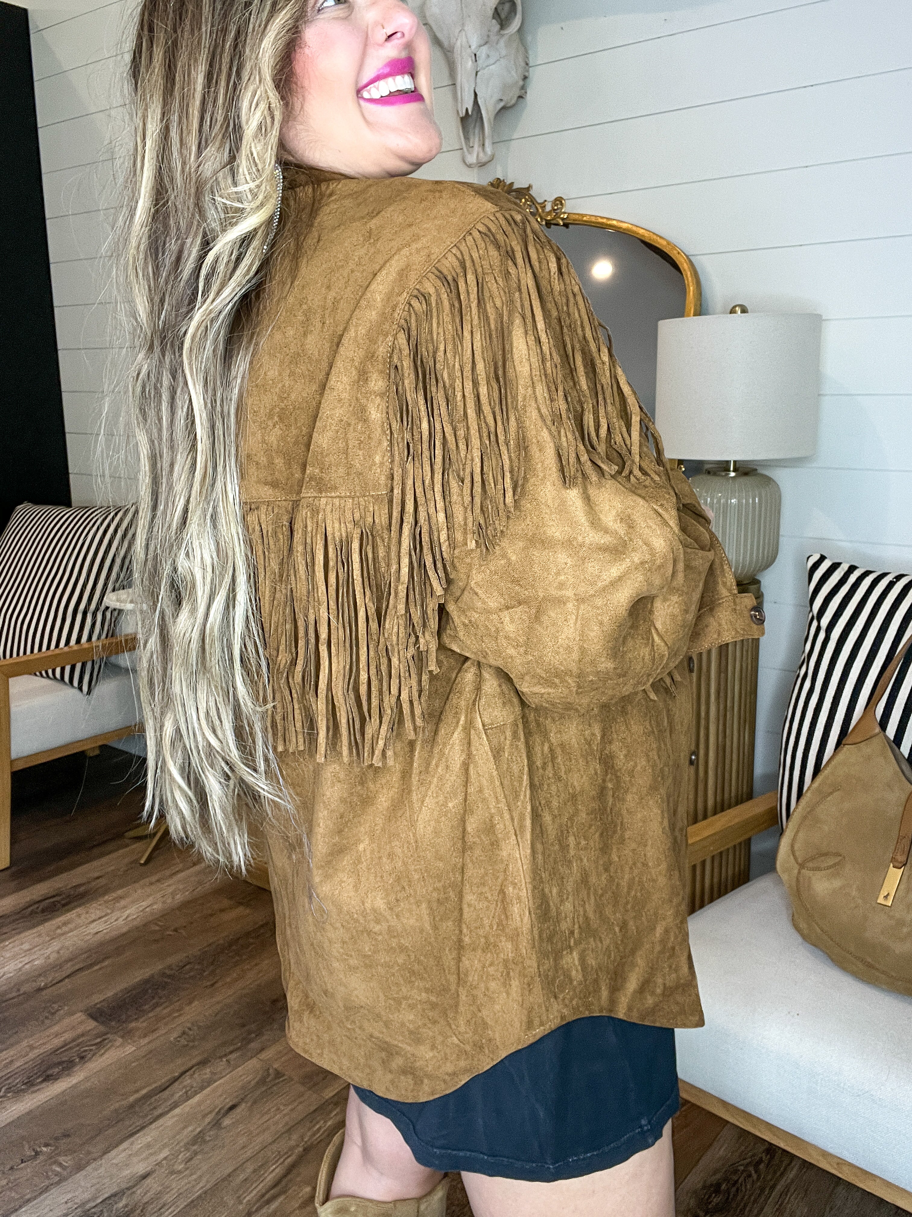 Cue the steel guitar- this fringe moment is ready for its rodeo debut + your weekend coffee run. The soft faux suede in warm camel gives vintage Western charm with a modern twist. Trust, she'll be the star of any outfit.