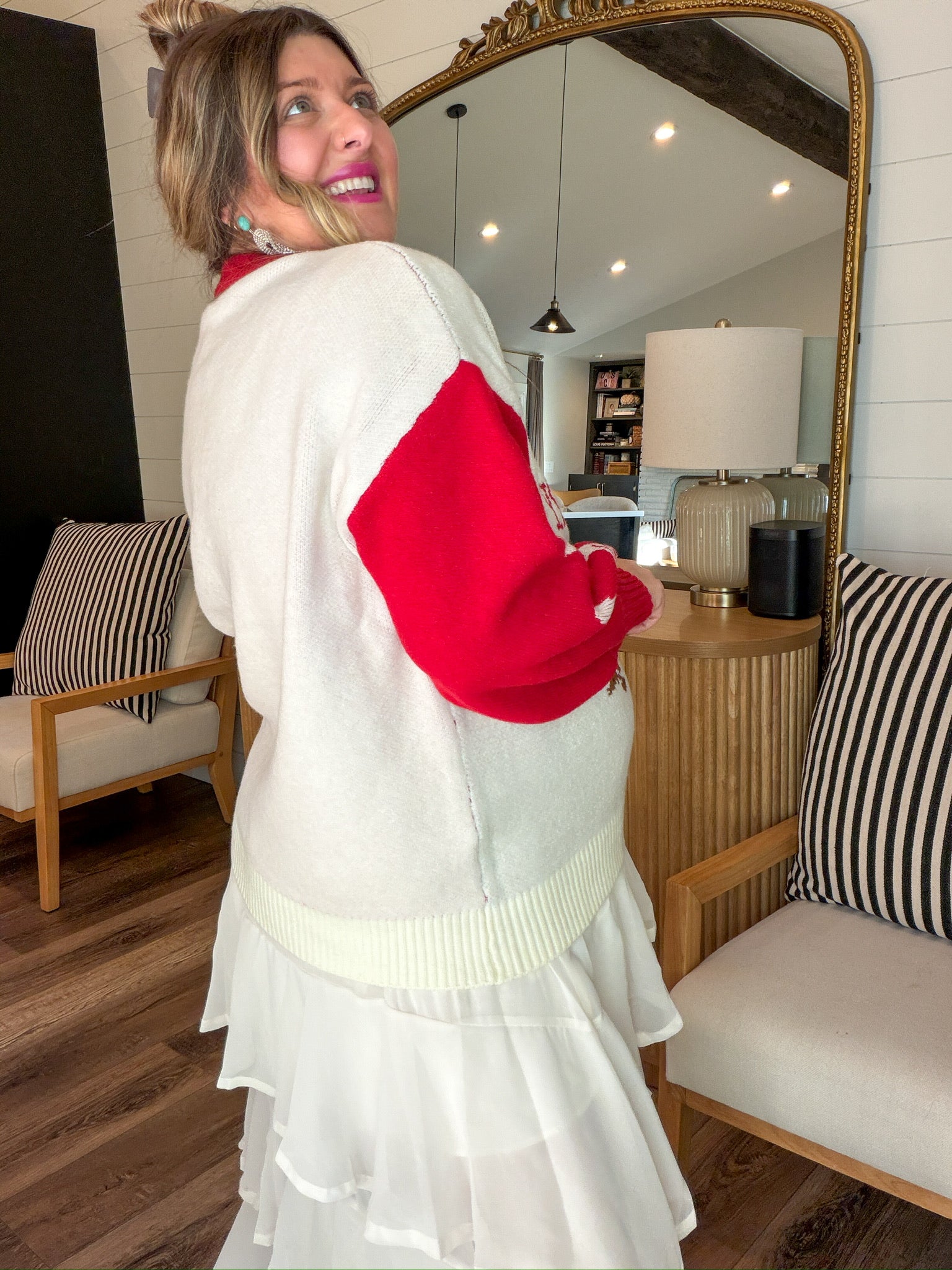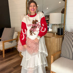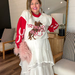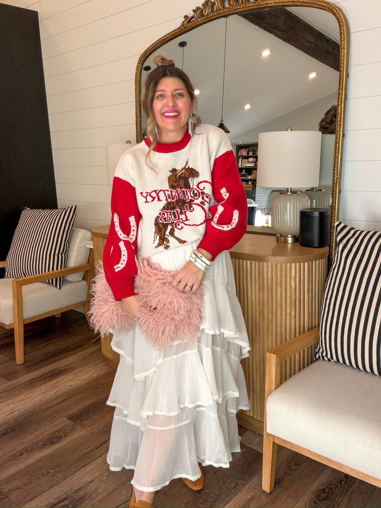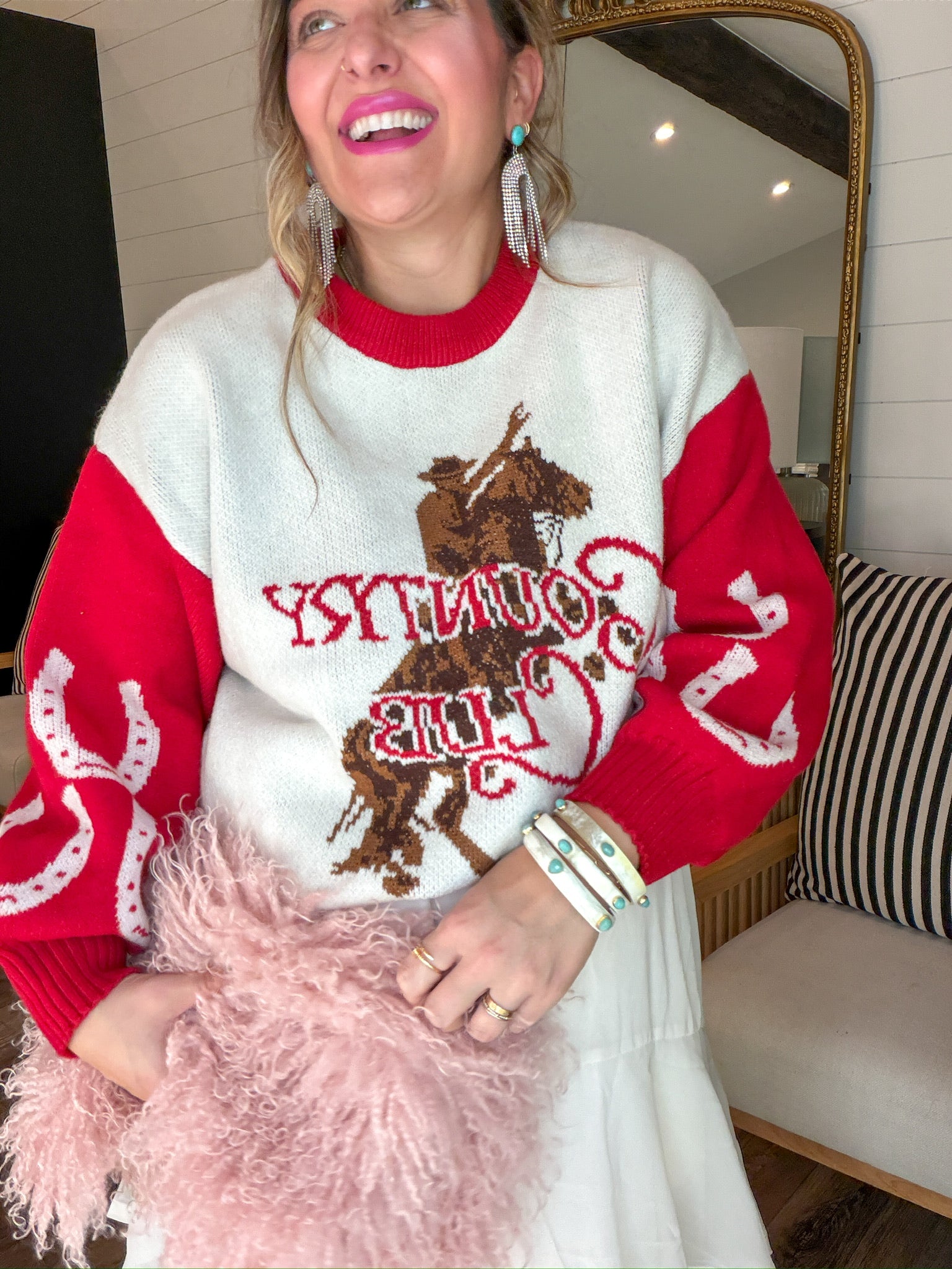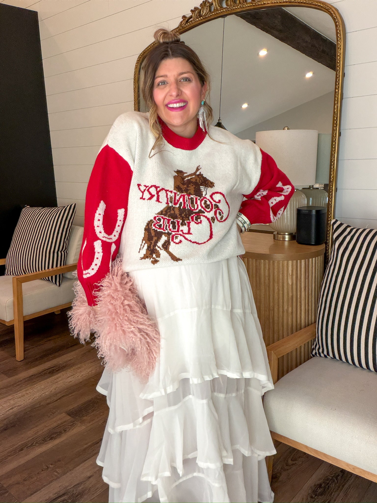 Saddle up, soft girl. This knit is where Western grit meets high-society sass. Featuring a bronc-riding graphic, bold red accents, and rope-trim sleeves that say “yes I can two-step AND order charcuterie,” this is your elevated cowgirl moment.