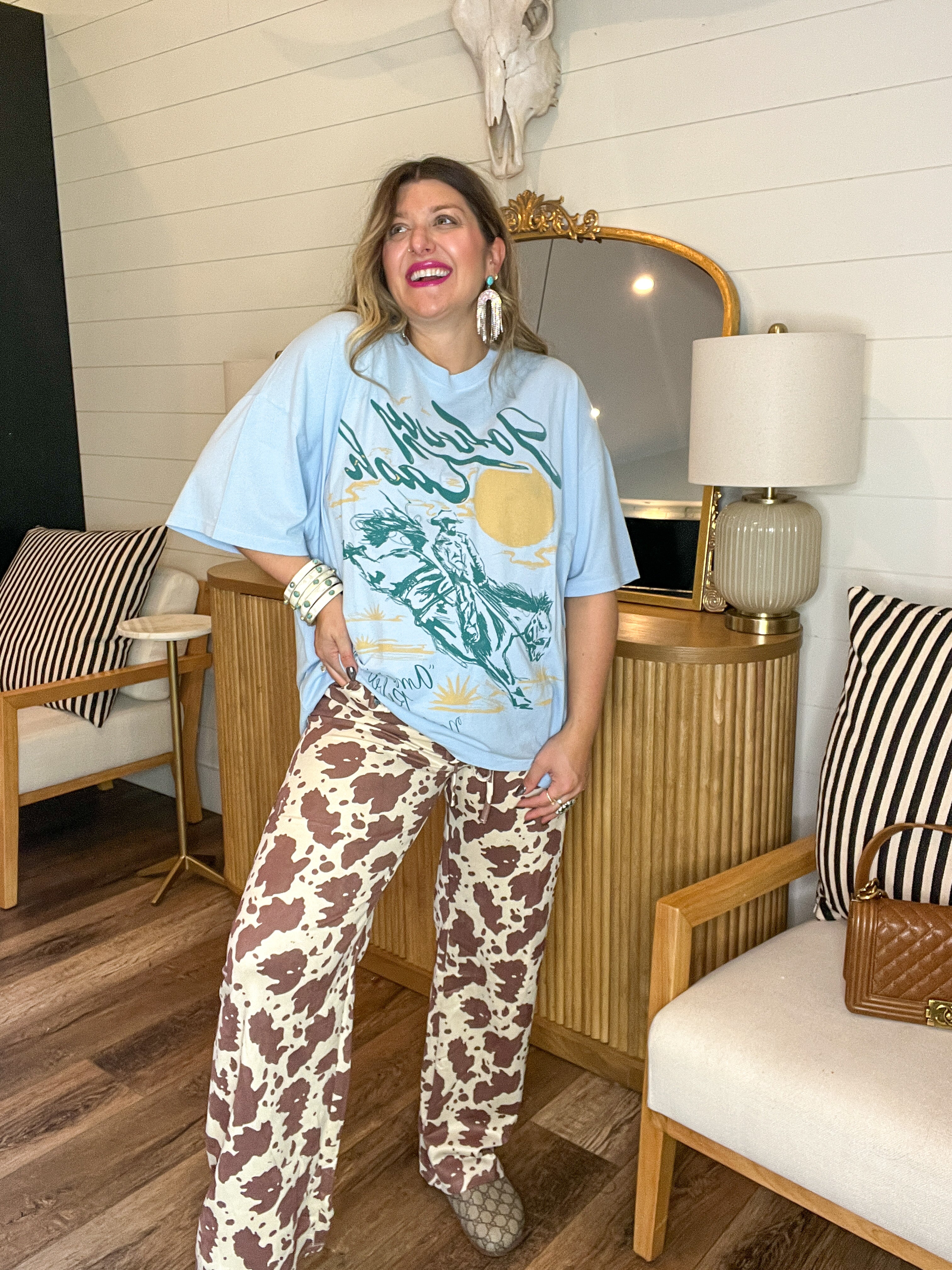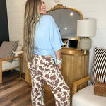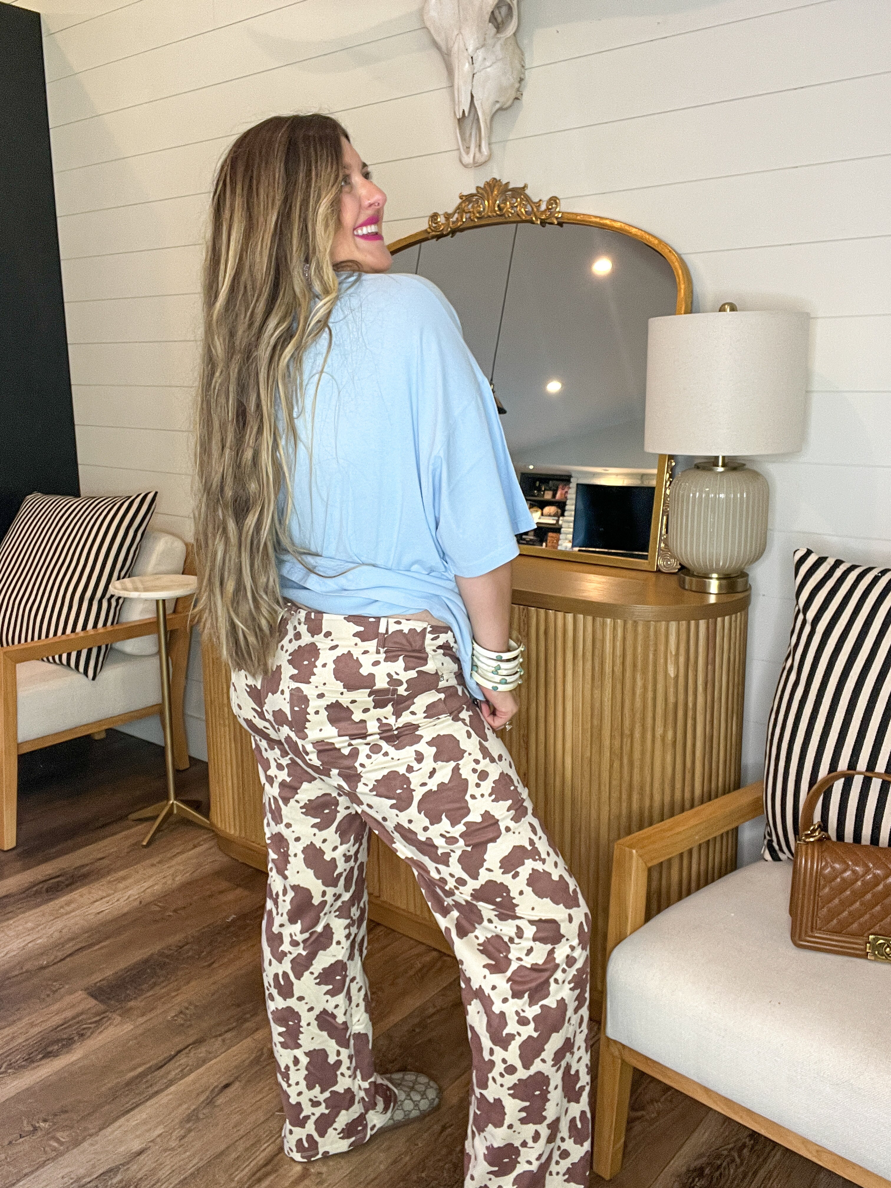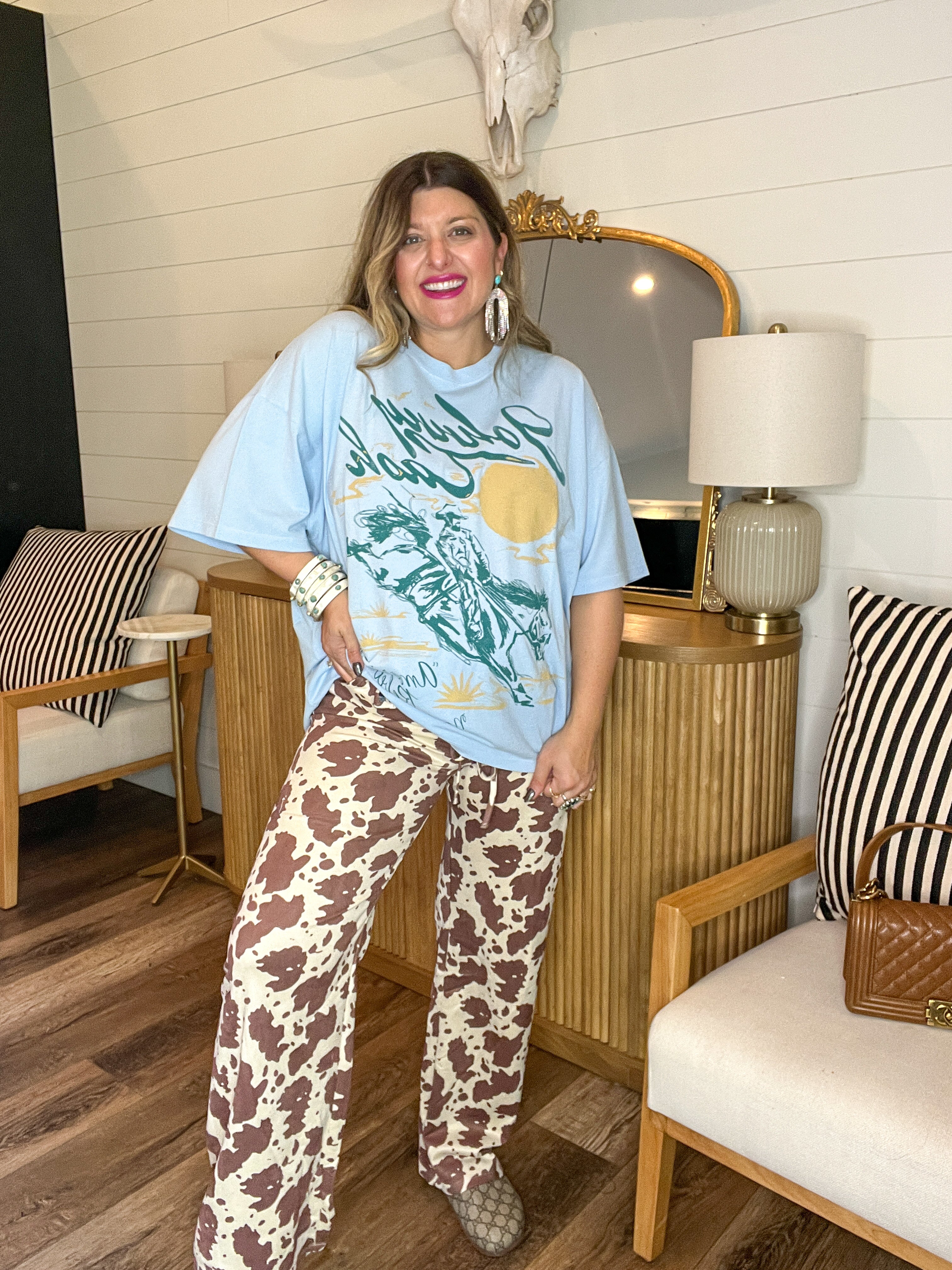 Giddy up in comfort—these laidback statement pants are the definition of cozy cowgirl energy. With a bold chocolate-and-cream cowprint and that silky-soft feel, they’re made for late-night line dances or lazy mornings on the porch. The drawstring waist keeps things flexible, and the wide-leg fit is all about breezy movement and relaxed cool.