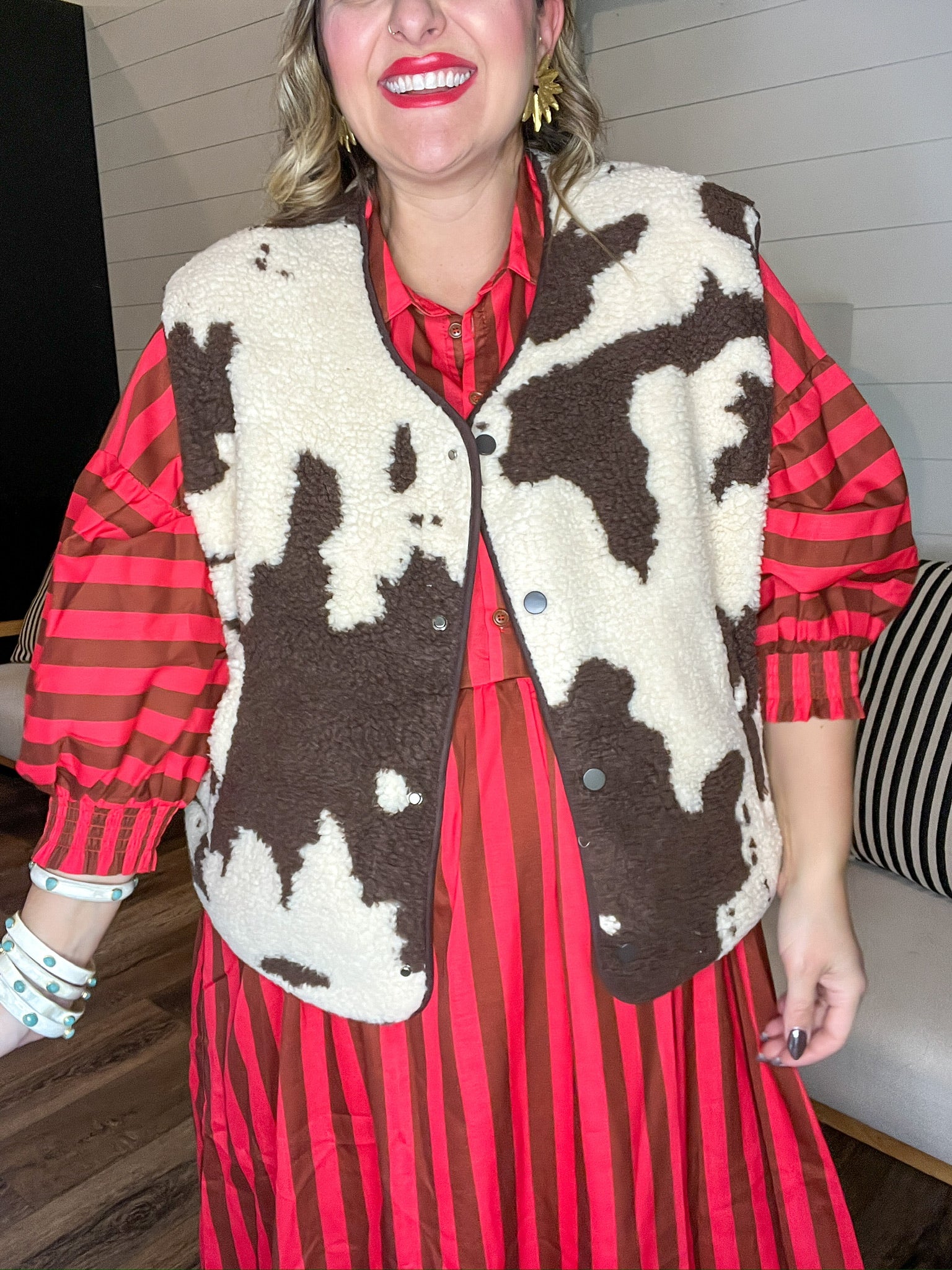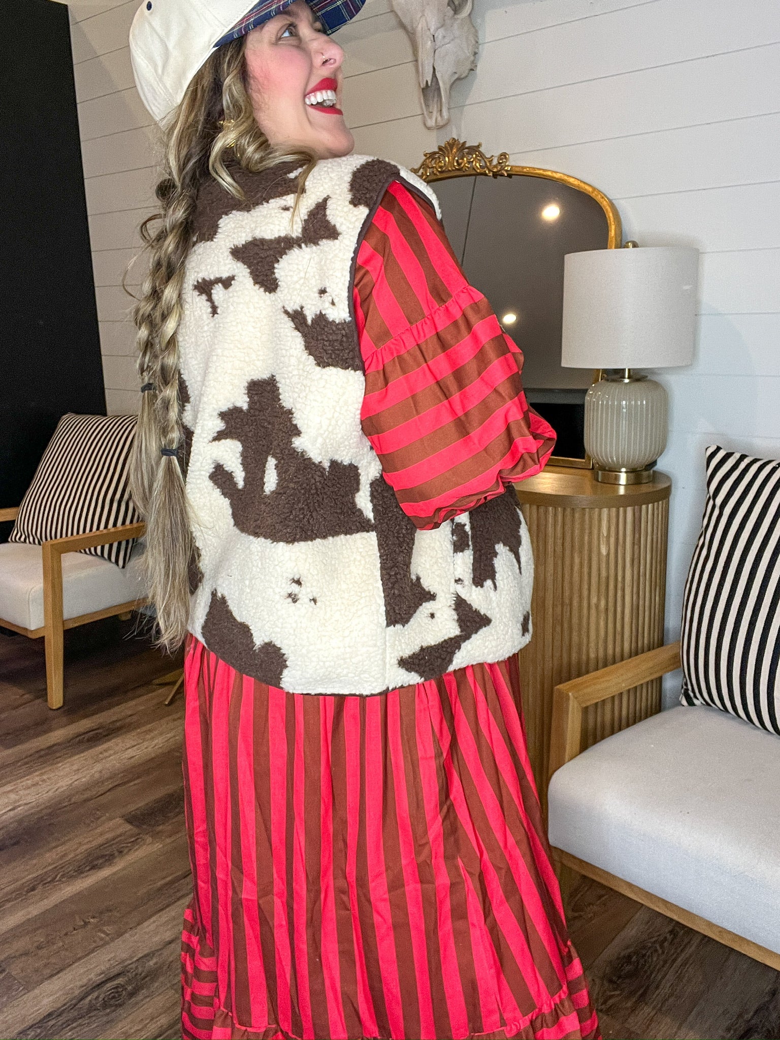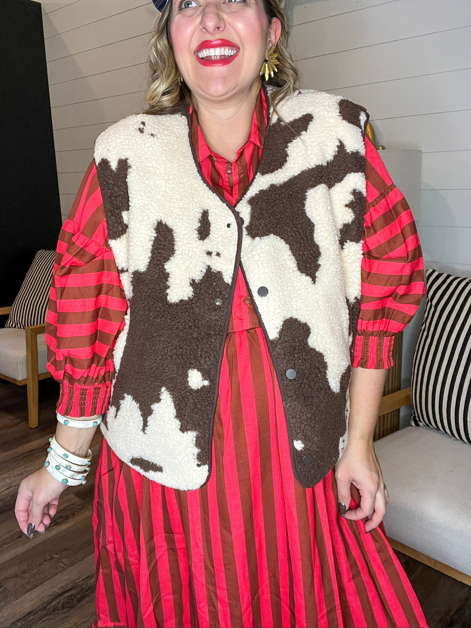 She’s got a little Yellowstone, a little Copenhagen street style, and a whole lot of “I’m not like other outerwear.” The Cowhide Couture Vest blends rugged charm with soft sherpa coziness in a print that’ll have the whole room moo-ved. It’s the layering piece you didn’t know you needed but suddenly can’t live without.