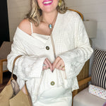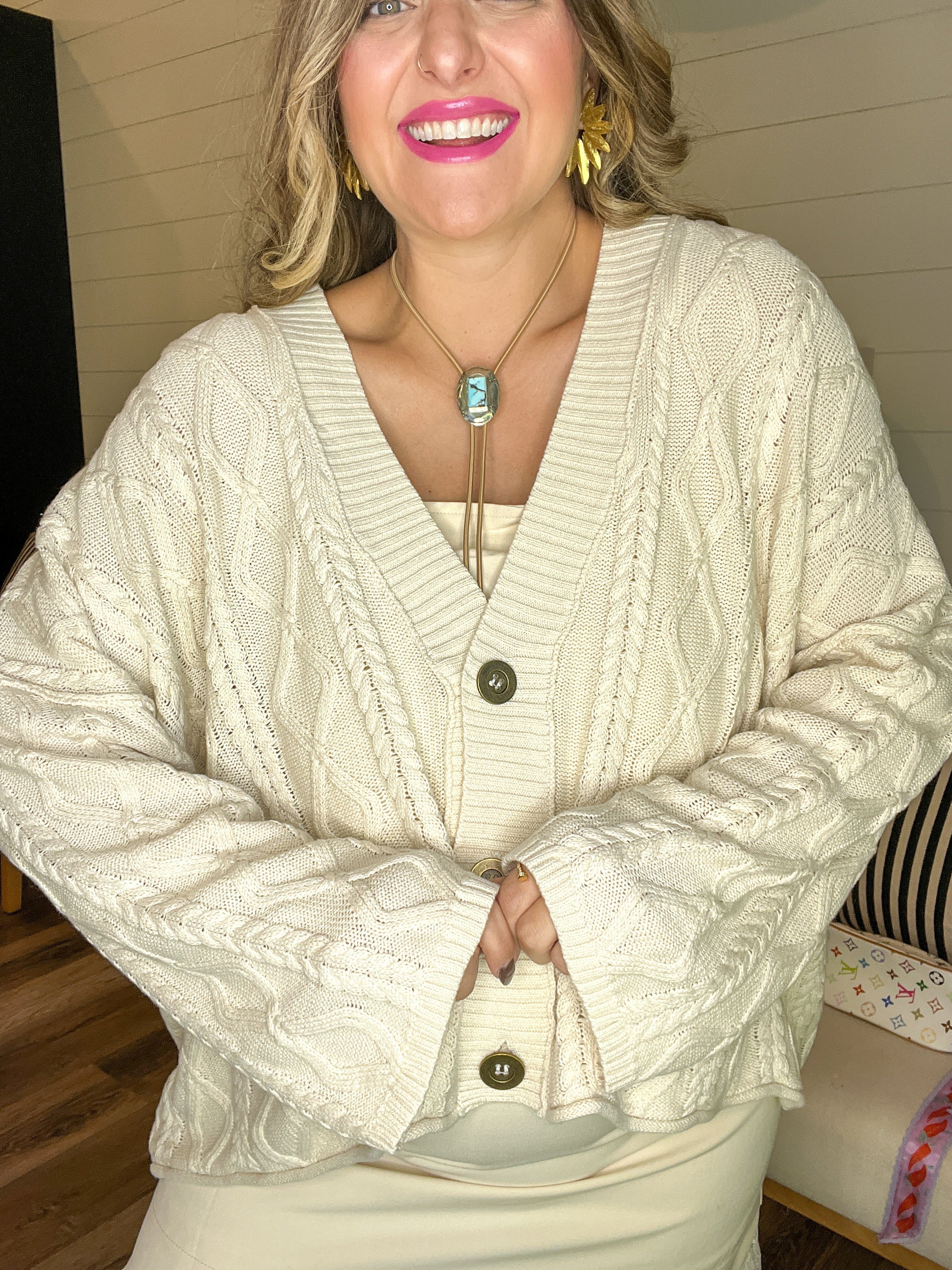 Meet your new cozy classic. The Creamery Cardigan is the definition of timeless- chunky cable knit, soft cotton feel, + a button-up front that makes it endlessly layerable. It's the piece you'll reach for whether you're curling up at home or pulling together an effortlessly chic outfit on the go.