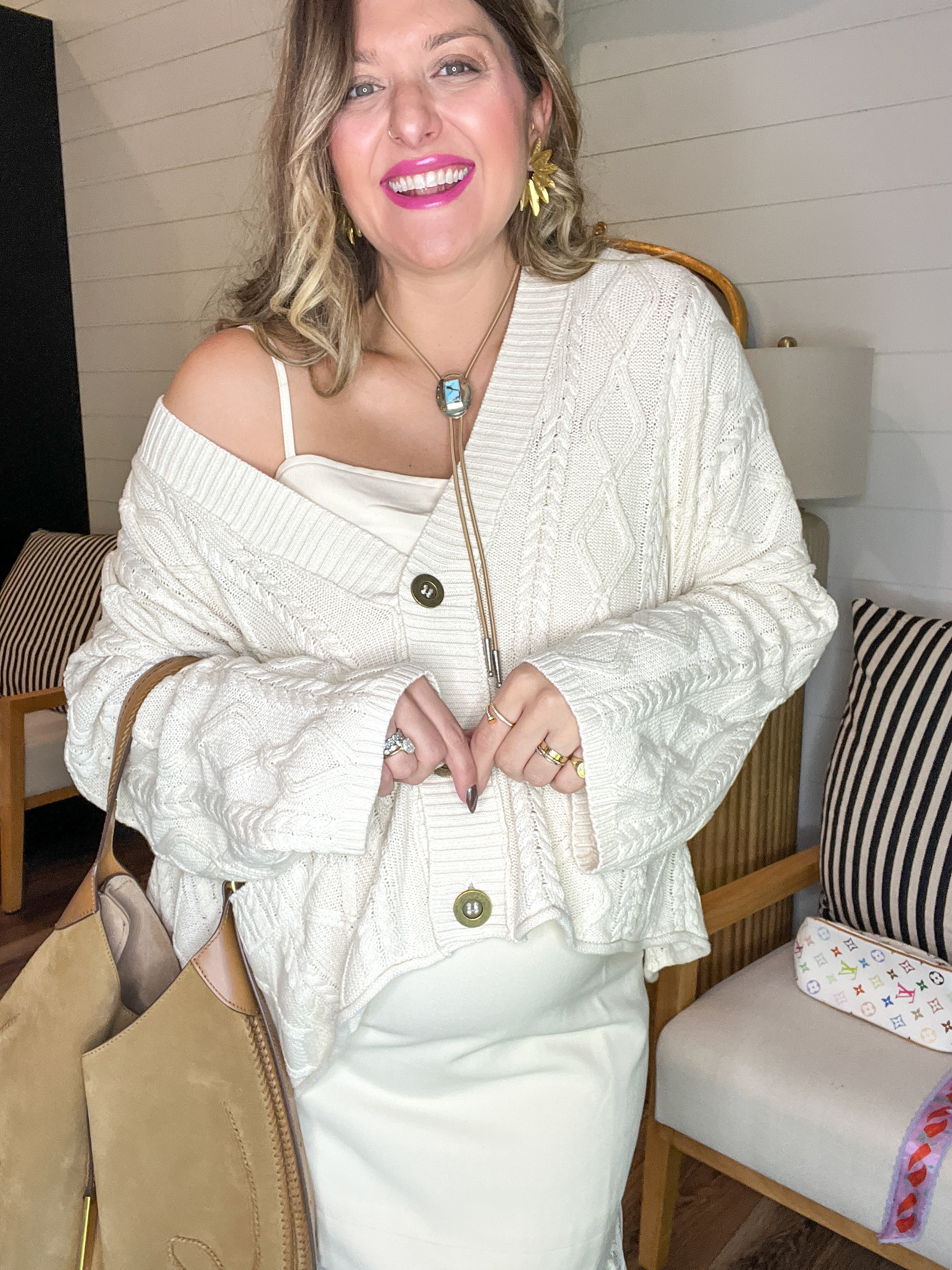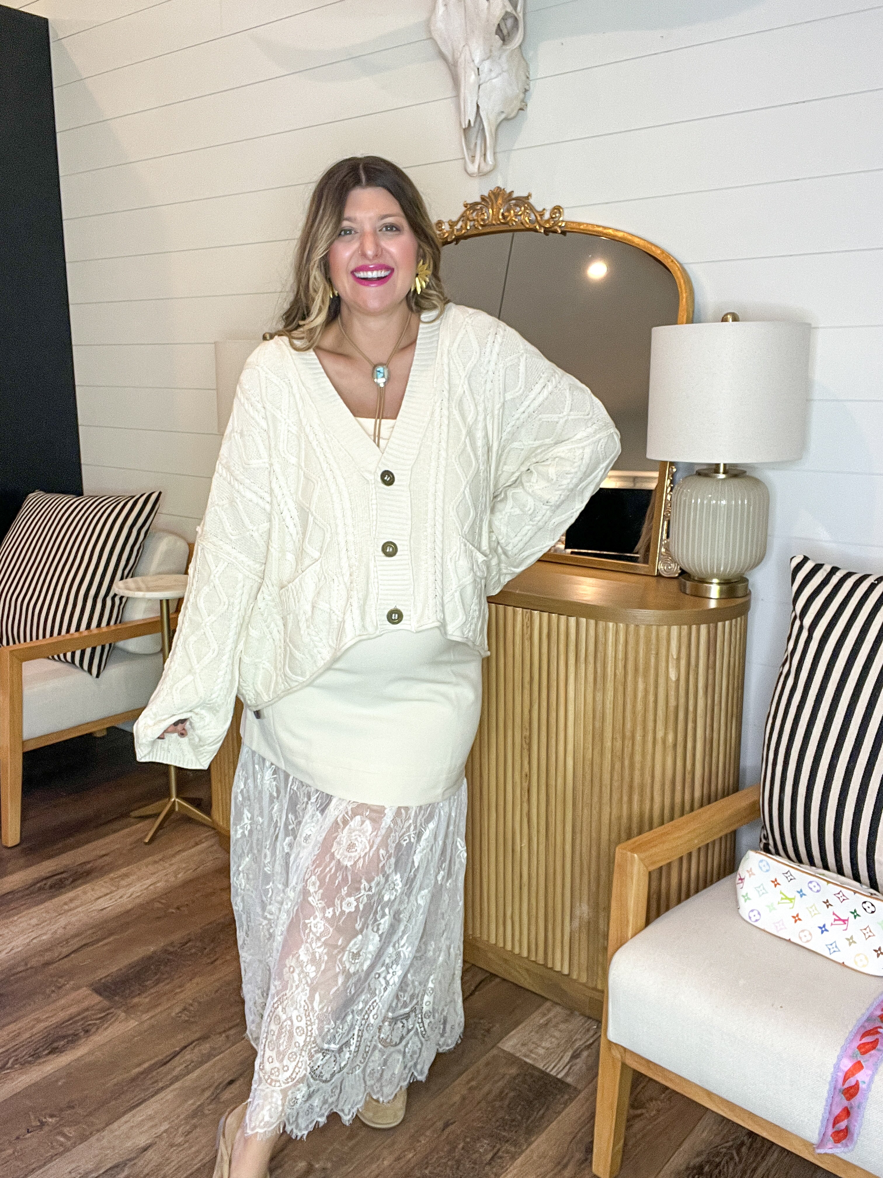 - Cream cable knit pattern that feels vintage + fresh all at once