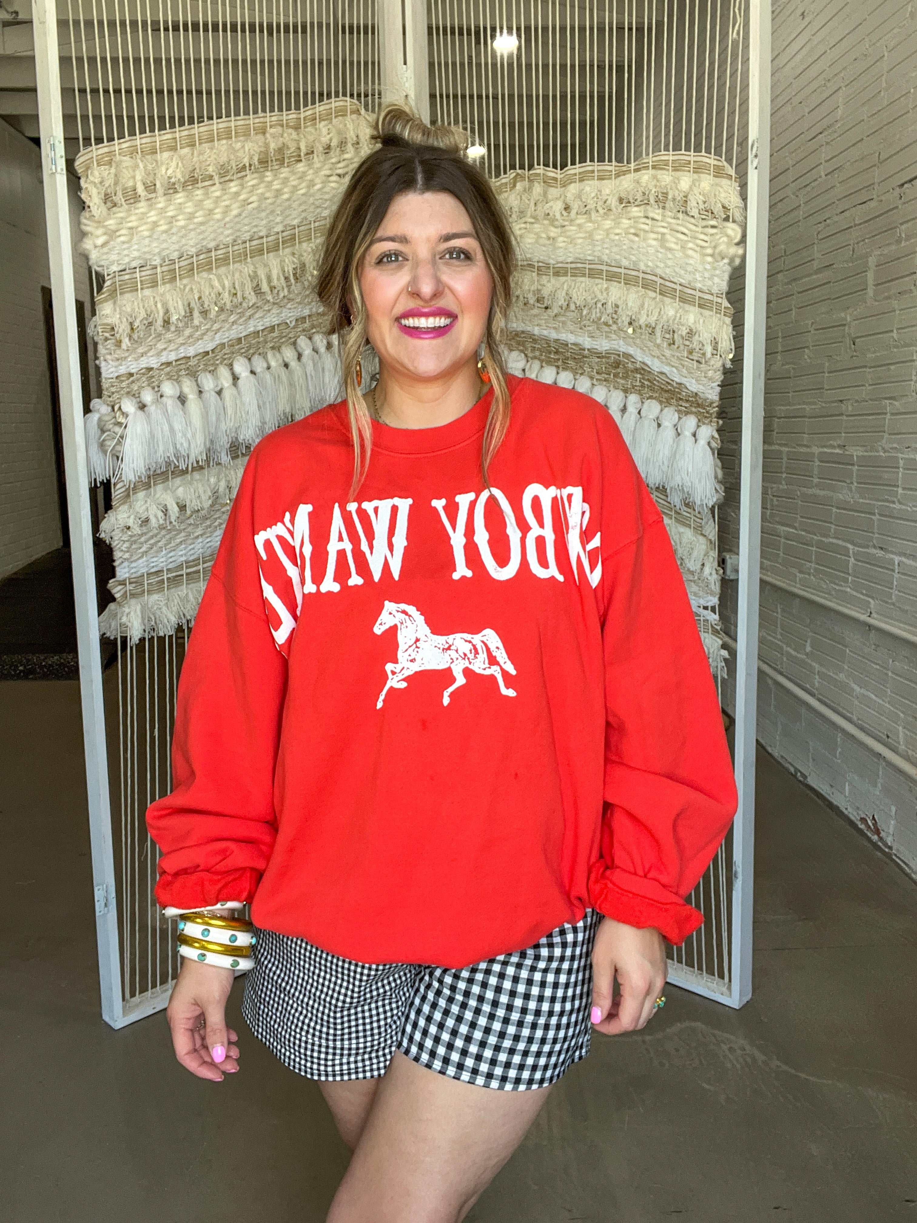Cowboy Wanted. Rope 'em in with this country fans' core crew featuring puff ink text that extends over the seams and a running horse graphic. Lasso not included. The BF Sweatshirt is an oversized fit and length, crafted in our 16 oz heavy fleece to durably hold its shape. Accented with a crew neckline, dropped shoulders and slouchy sleeves.
