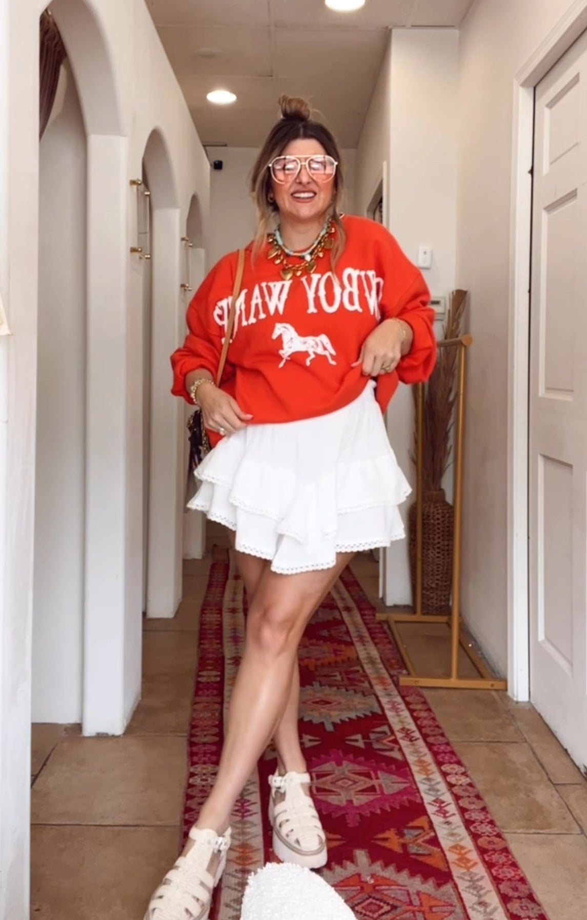 - Layer over a tiered mini skirt + boots for a rodeo-ready moment