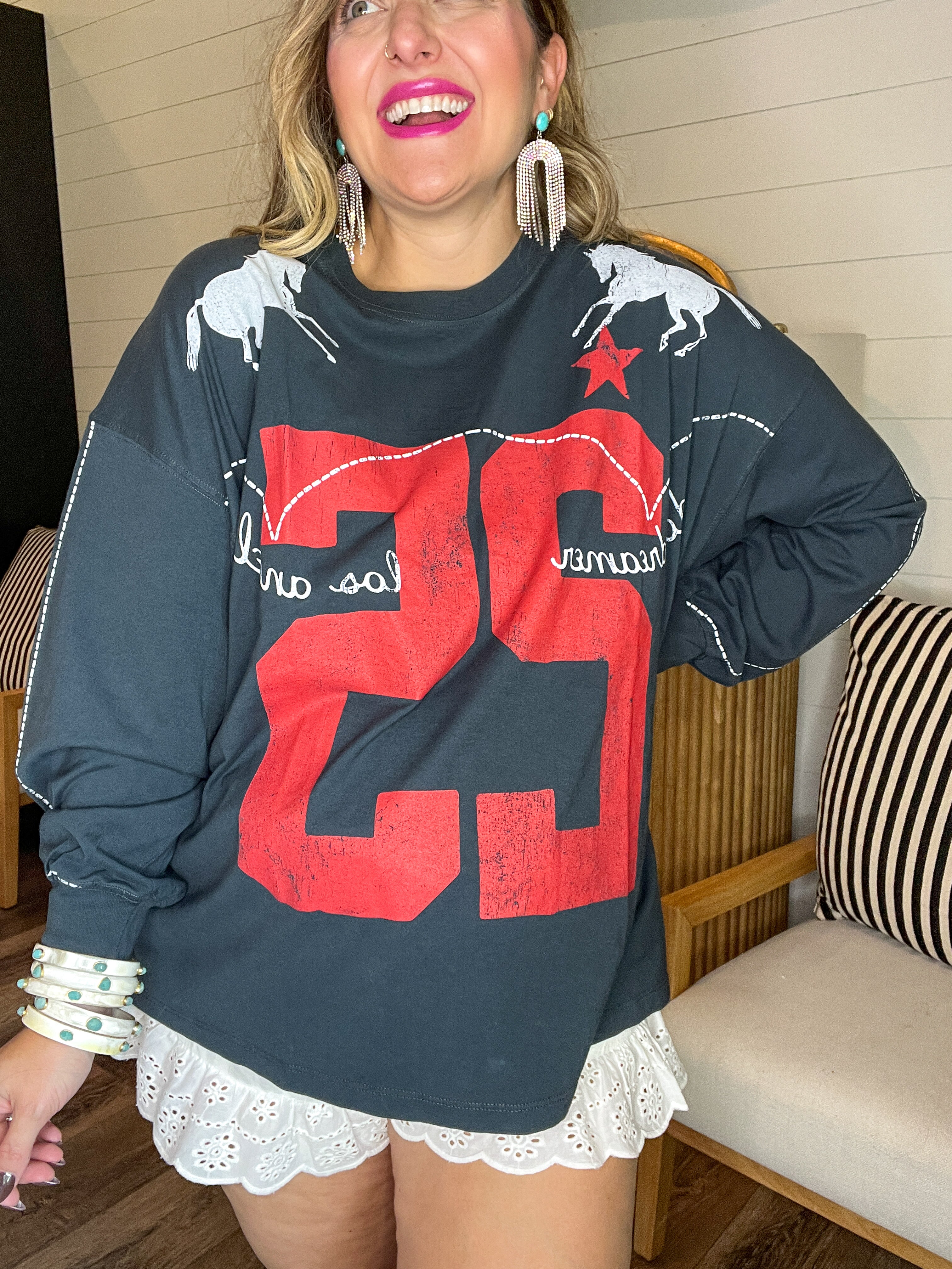 An addition for your country lineup, western motifs hit this oversized long sleeve designed with block numbers and a mention of Daydreamer Los Angeles.