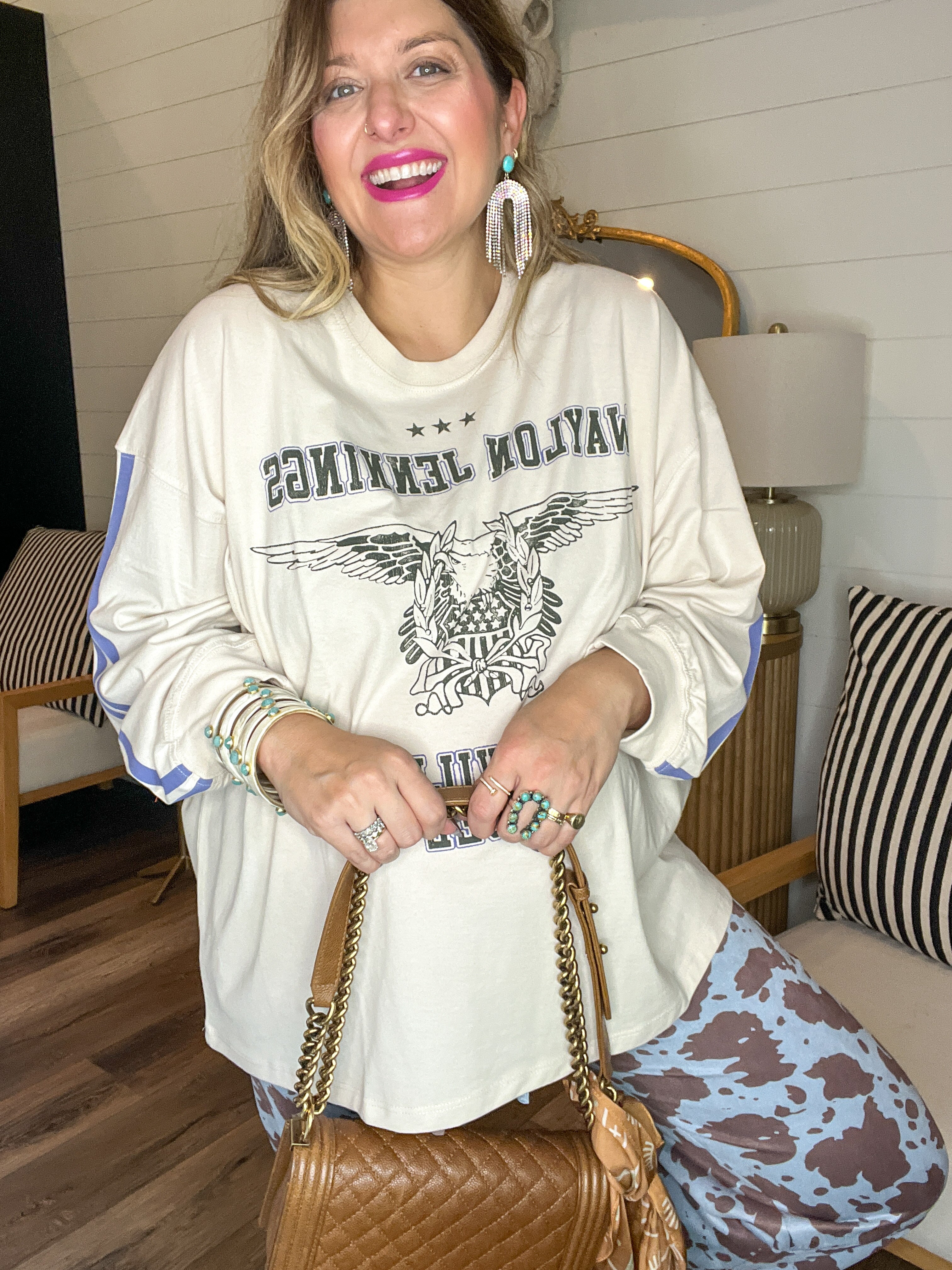 The originator of the Outlaw movement, Waylon Jennings, hits this OS Long Sleeve that gives a nod to the gritty star’s rebellious country sound. Stamped with the icon’s name, an eagle emblem and a shoutout to his hometown. Designed with double sleeve stripes and star accents for a collegiate influence.