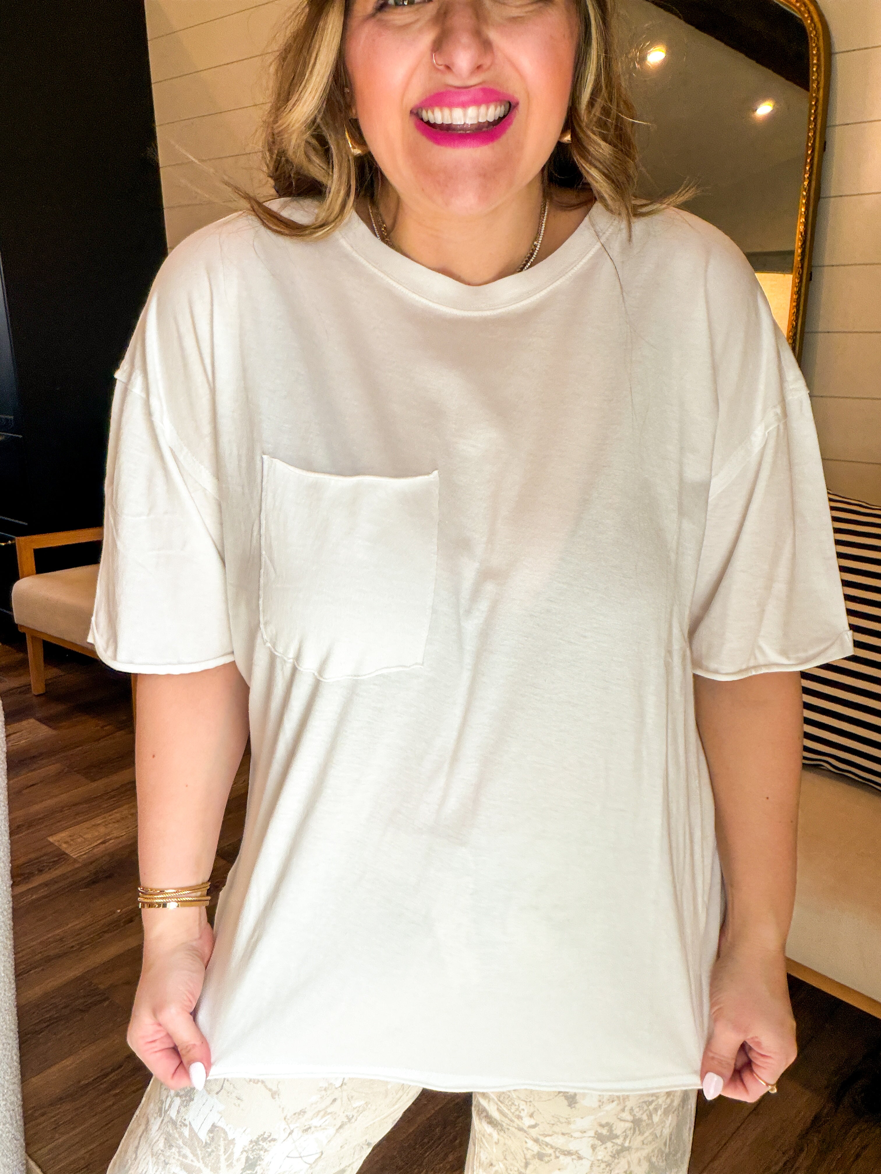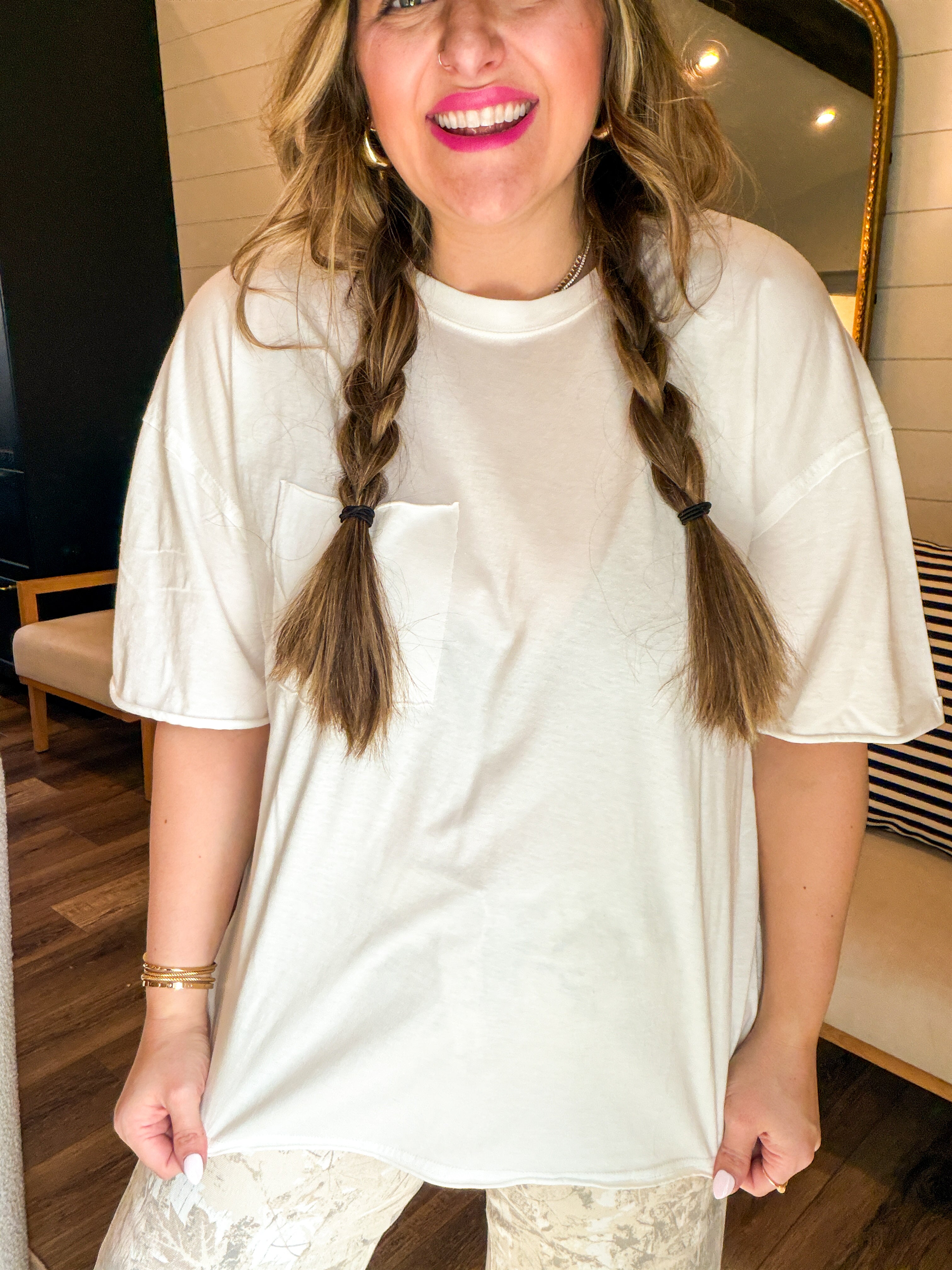 Embrace effortless style with the Daydreaming Boxy Tee in white! This ultra-cozy tee features a chic chest pocket and a versatile boxy cut, making it perfect for running errands or hitting the gym. Dress it up or down to suit your mood and enjoy all-day comfort! Don't miss out on this wardrobe essential!