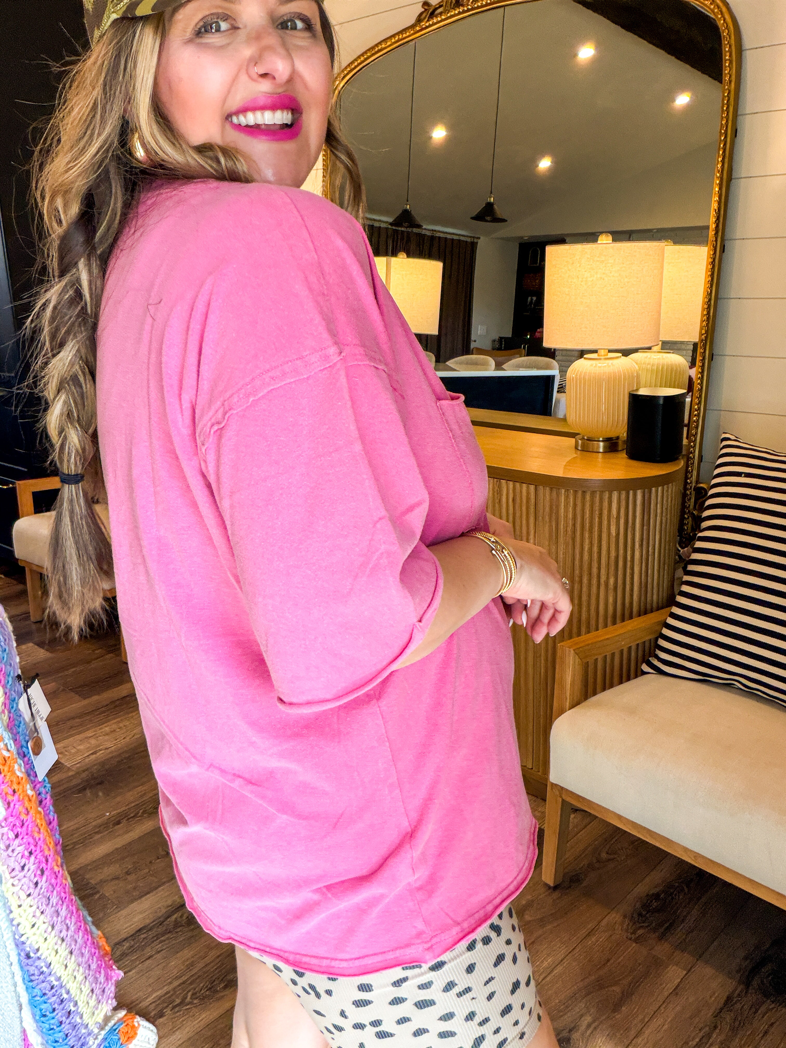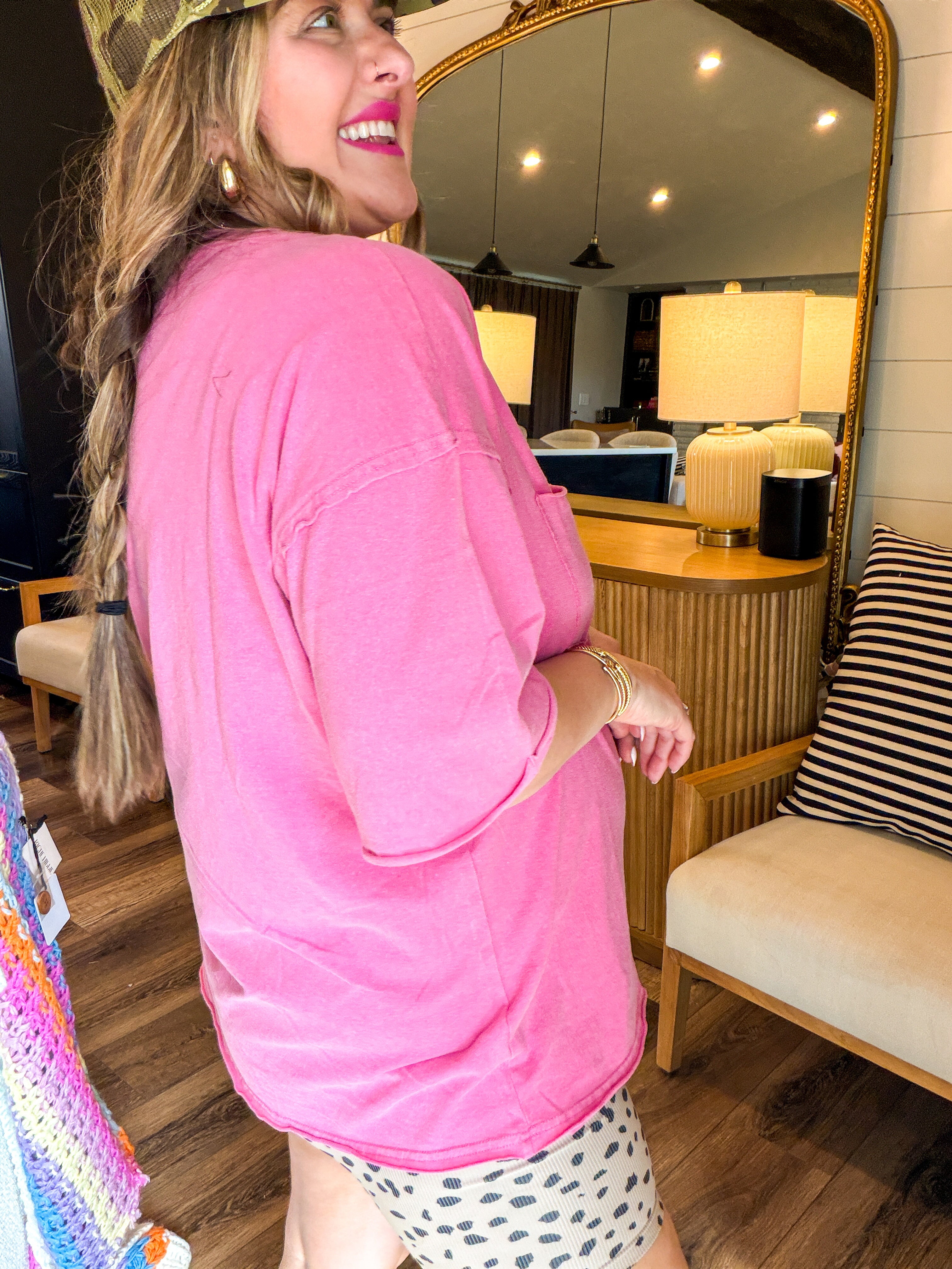 Embrace effortless style with the Daydreaming Boxy Tee in Pink! This ultra-cozy tee features a chic chest pocket and a versatile boxy cut, making it perfect for running errands or hitting the gym. Dress it up or down to suit your mood and enjoy all-day comfort! Don't miss out on this wardrobe essential!