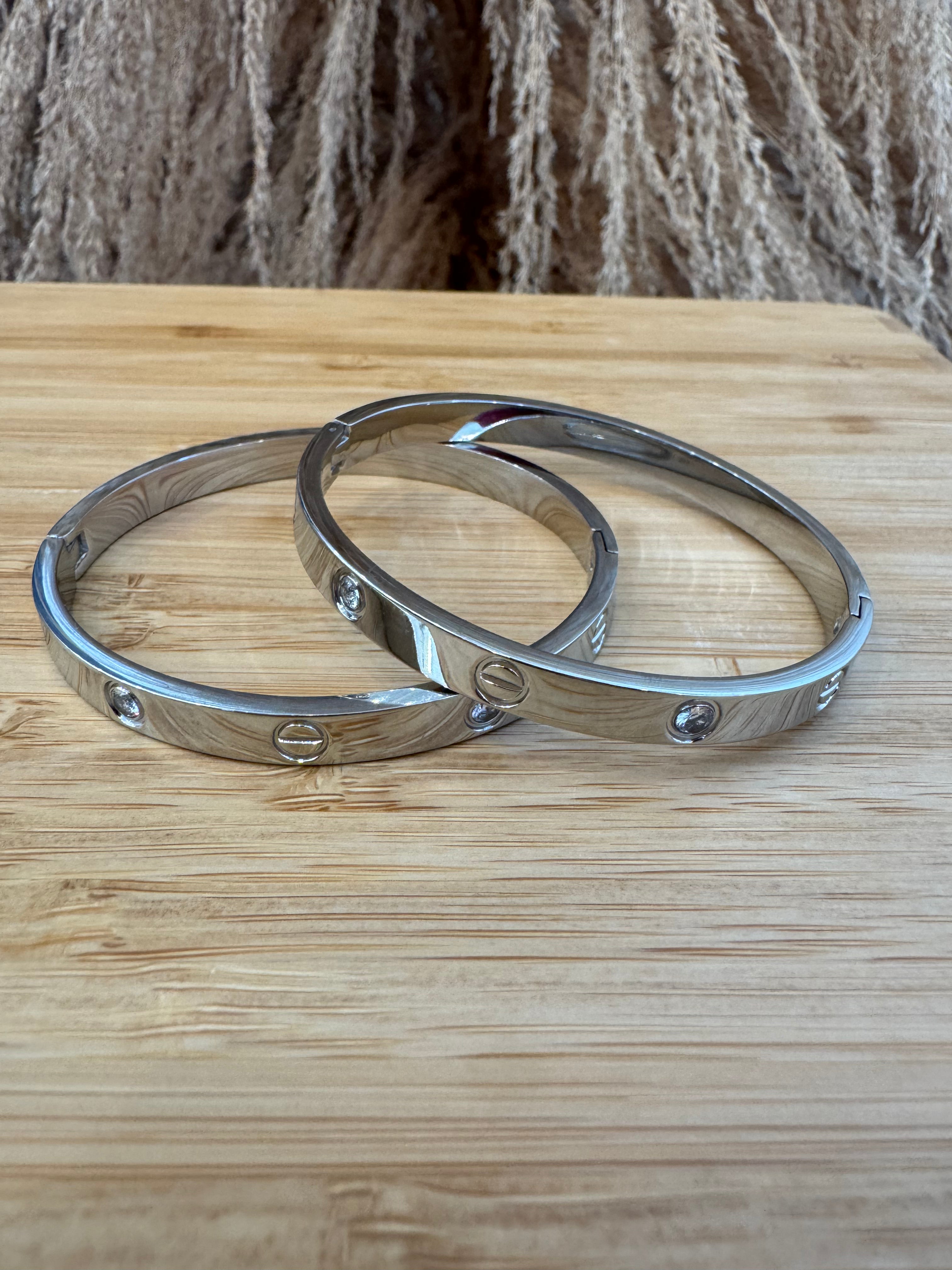 Stainless steel. Get the luxury look diamond bangles with this unique style. Opens with a hinge style and magnetically closes. These have stones half way around the bracelets.