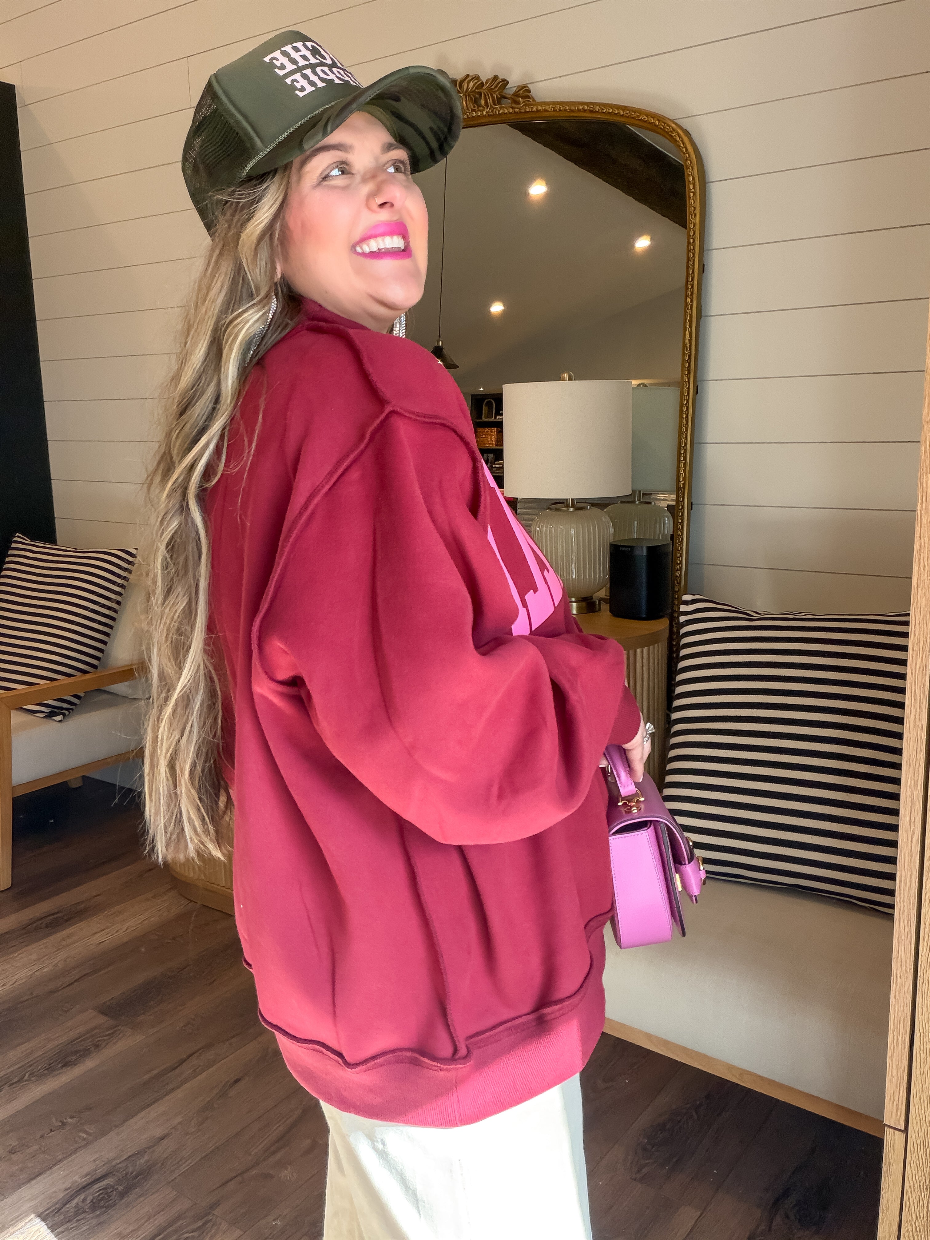 A closet chameleon, this dilly dally beauty is here to prove that minimal can still serve major energy. The cozy mock neck gives it that quiet luxury silhouette, while the raw hem edges on the flip side add just enough off-duty edge. Whether you dress it up or down, it’s giving “effortlessly put together” no matter what side you wear.