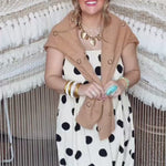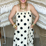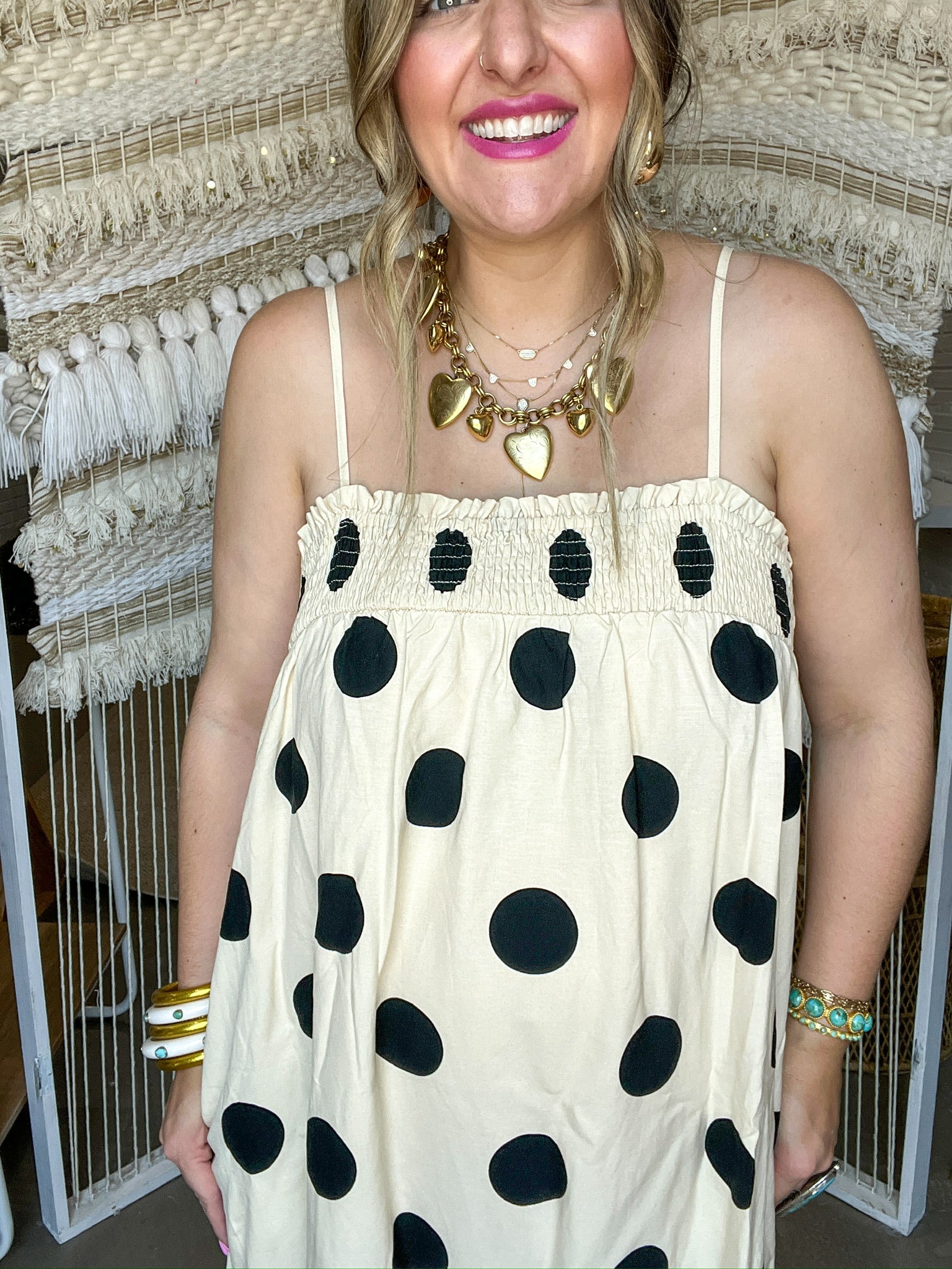 A dress with main character energy and a touch of retro charm. The Dolly Polka Dot Maxi is made to turn heads with its bold black dots, smocked top, and flowy wide-leg silhouette that gives just enough drama. Whether you’re headed to brunch or booking it to Broadway, this one’s a show-stealer.