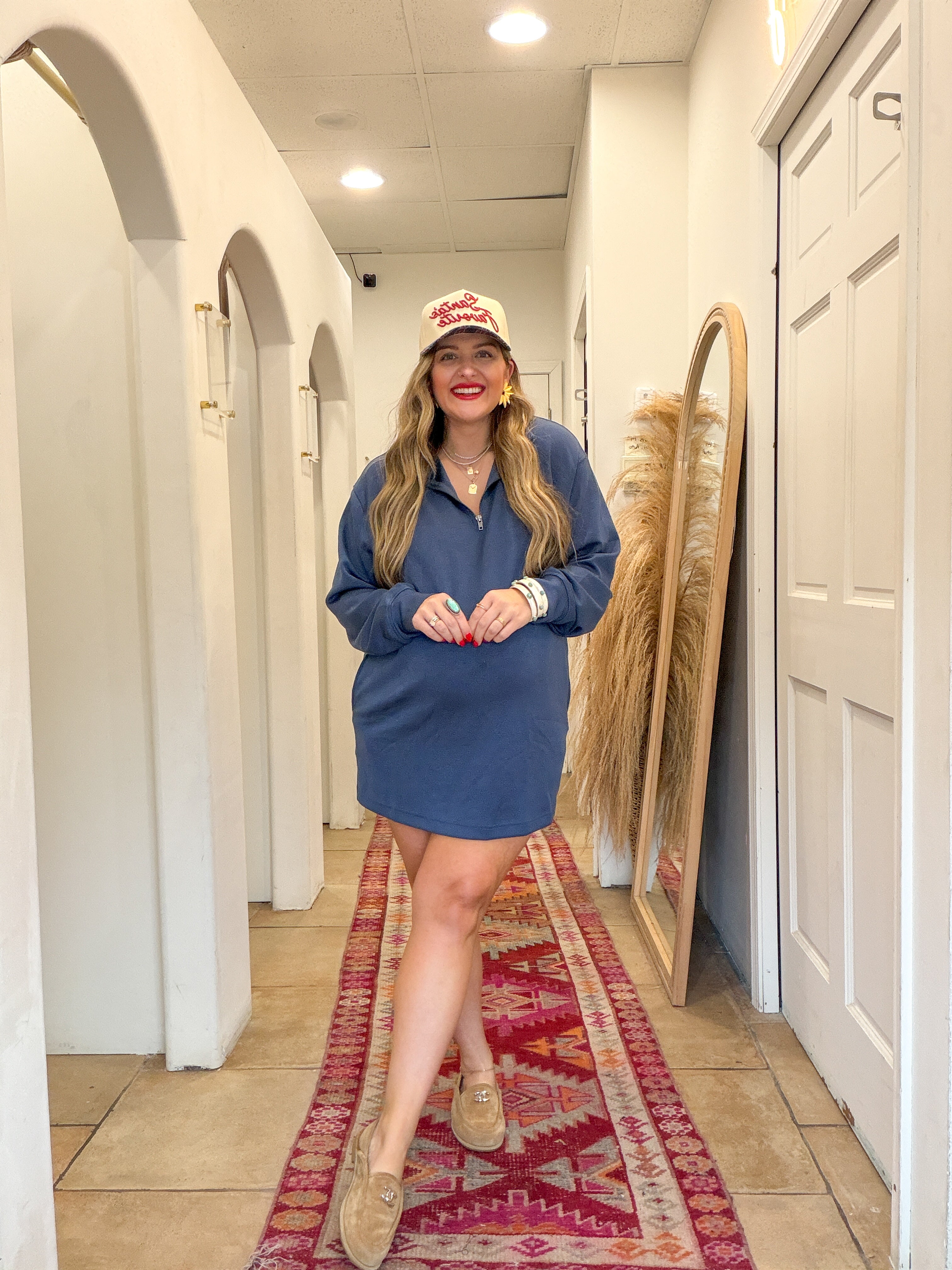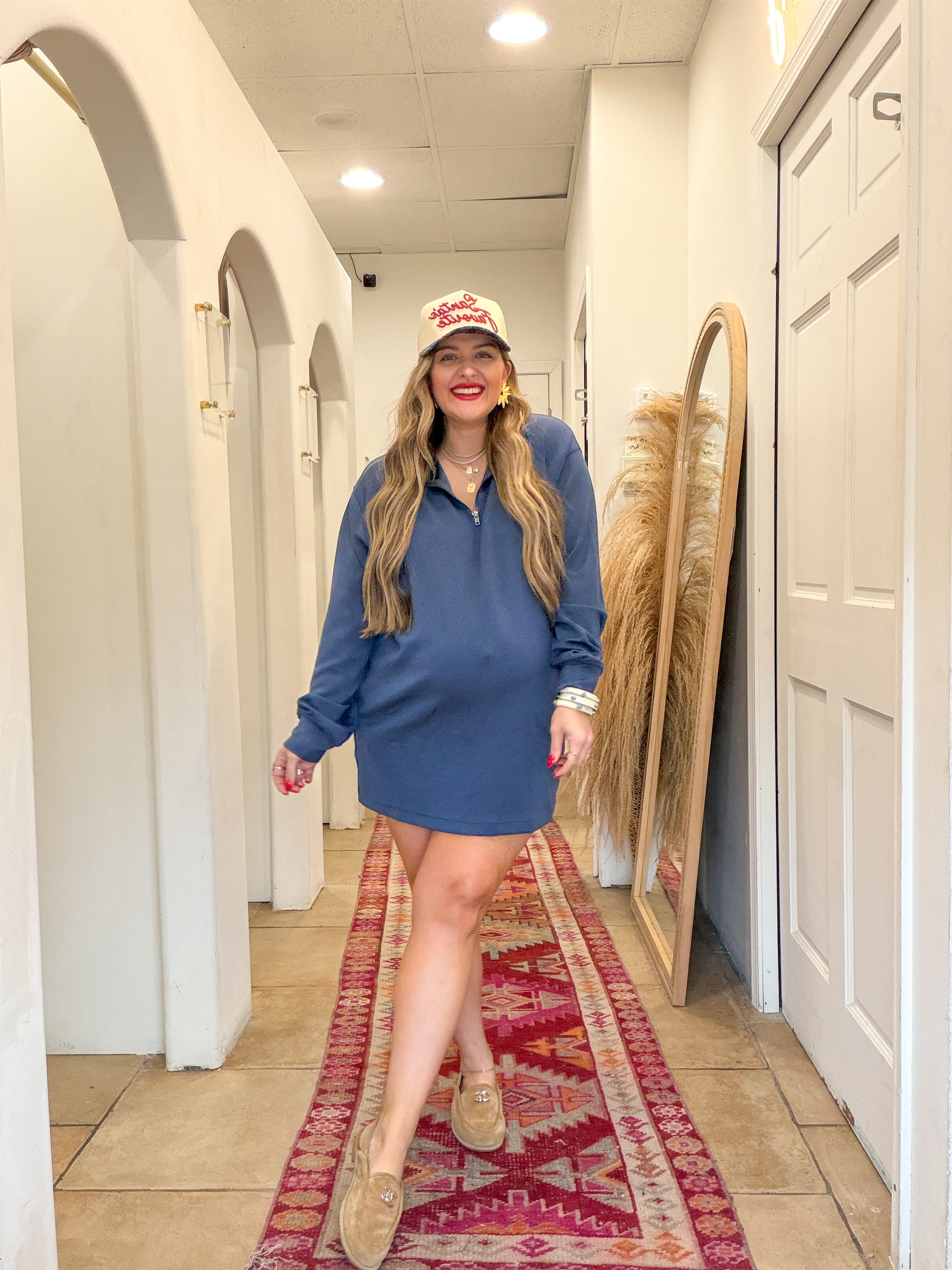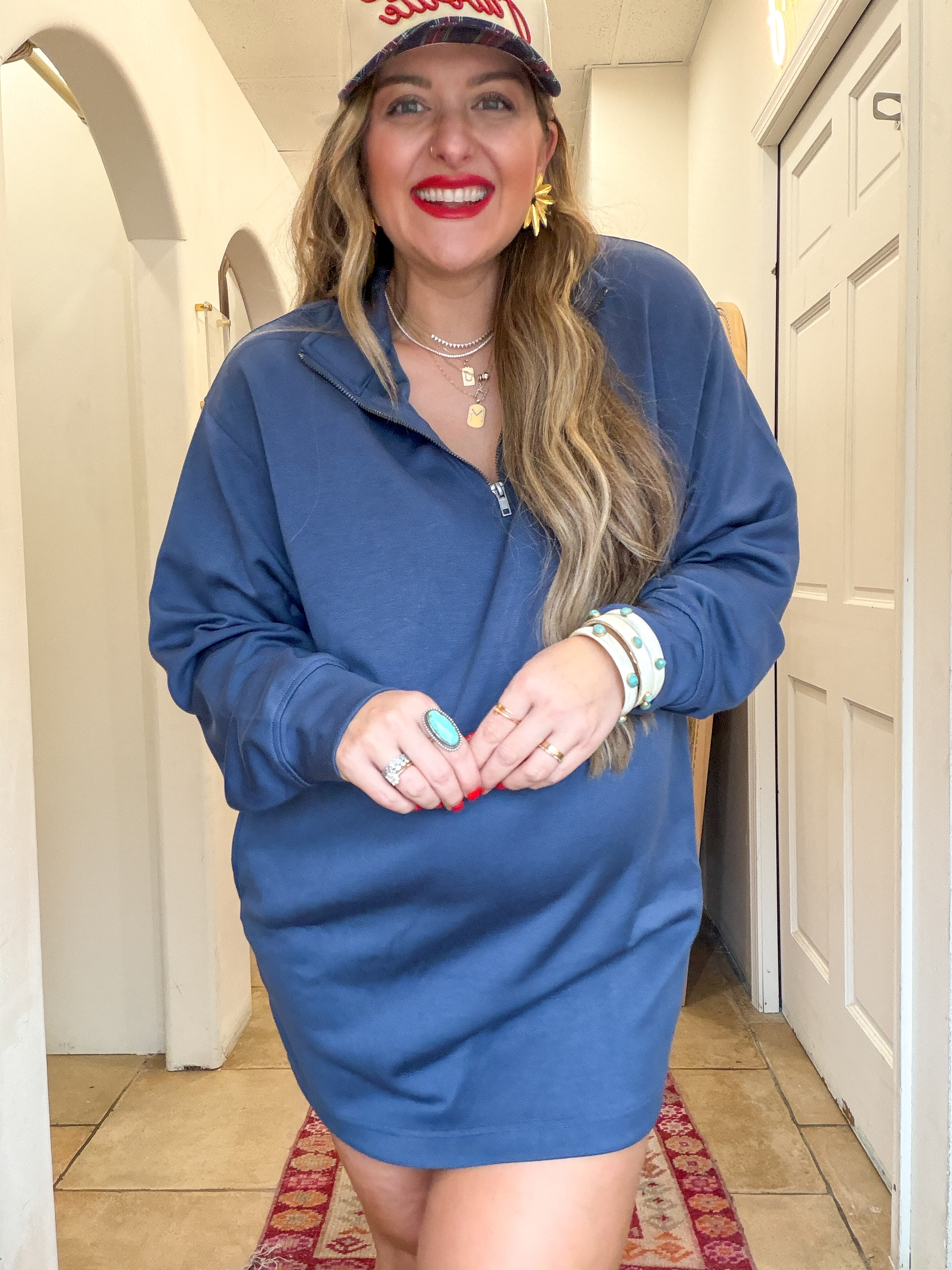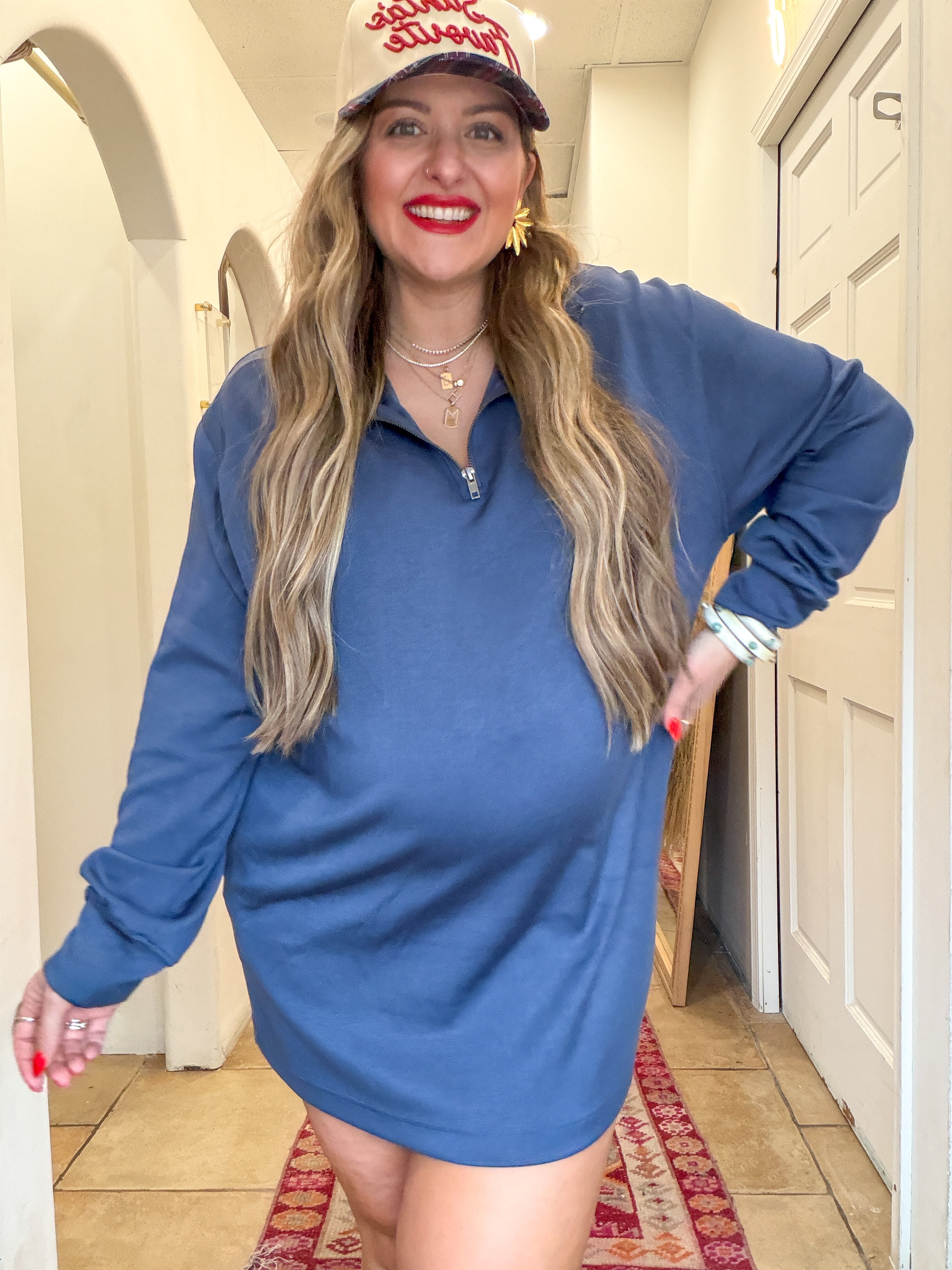 Meet your new winter MVP — this dusty navy half-zip mini is the perfect hybrid of sporty, sleek, and secretly so soft. Whether you’re headed to class, brunching with the girls, or pretending your errands are actually a Main Character montage, this dress shows up and shows off.