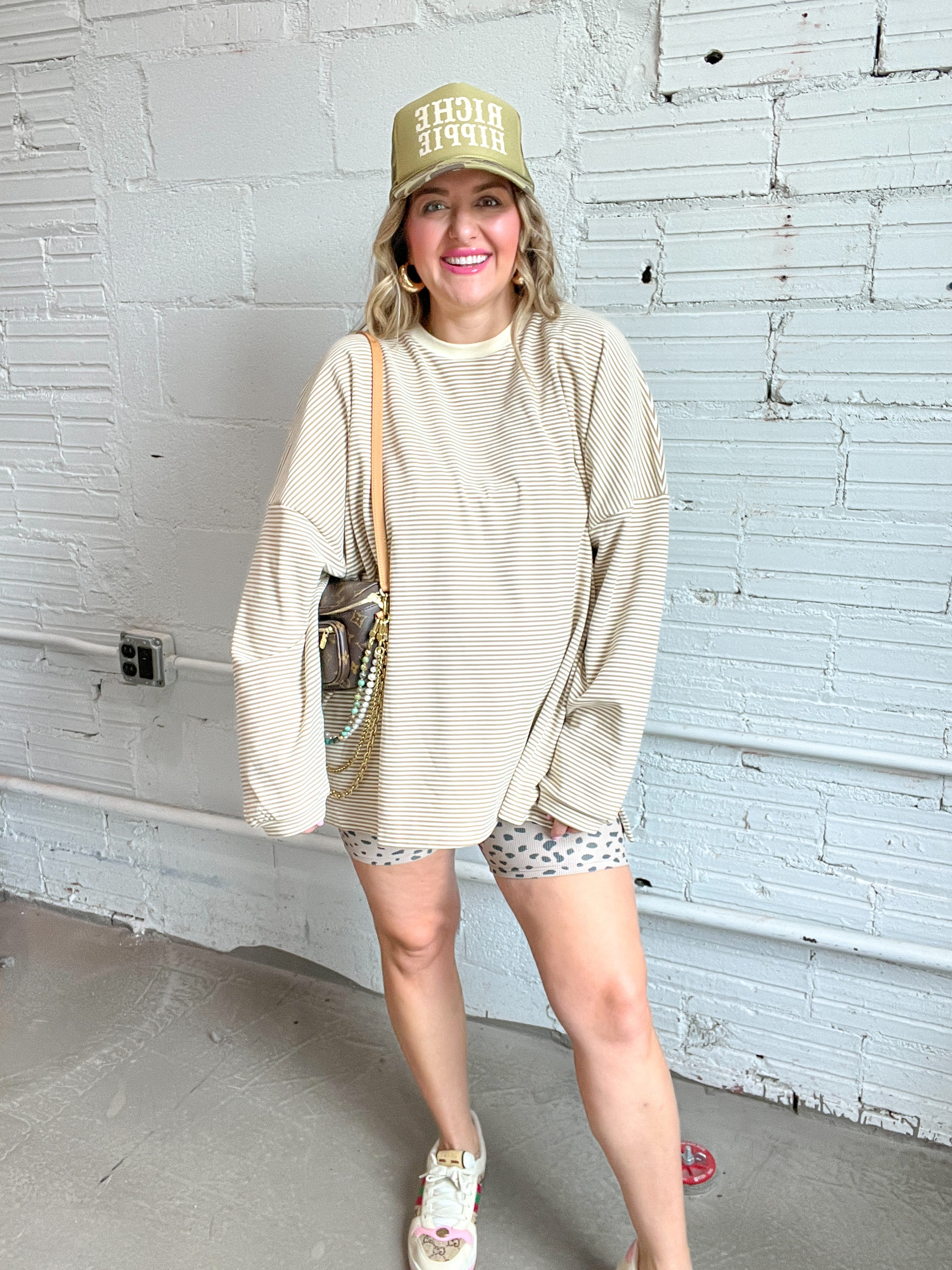 The neutral you didn’t know you needed. With its ultra-soft fabric, classic beige stripes, and relaxed silhouette, this top brings quiet luxury to everyday style. Designed for comfort but made to turn heads, this piece is a wear-on-repeat staple whether you’re chilling at home or out and about.