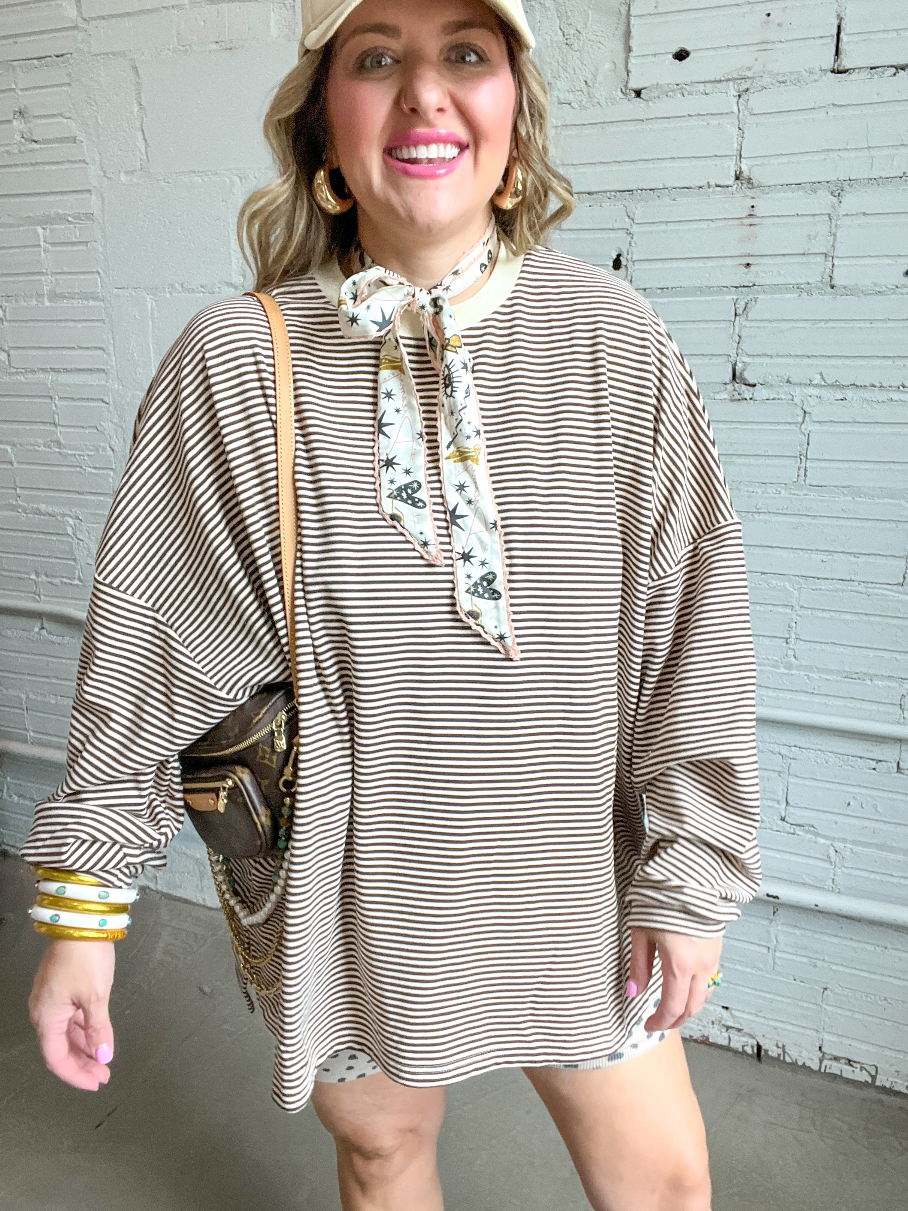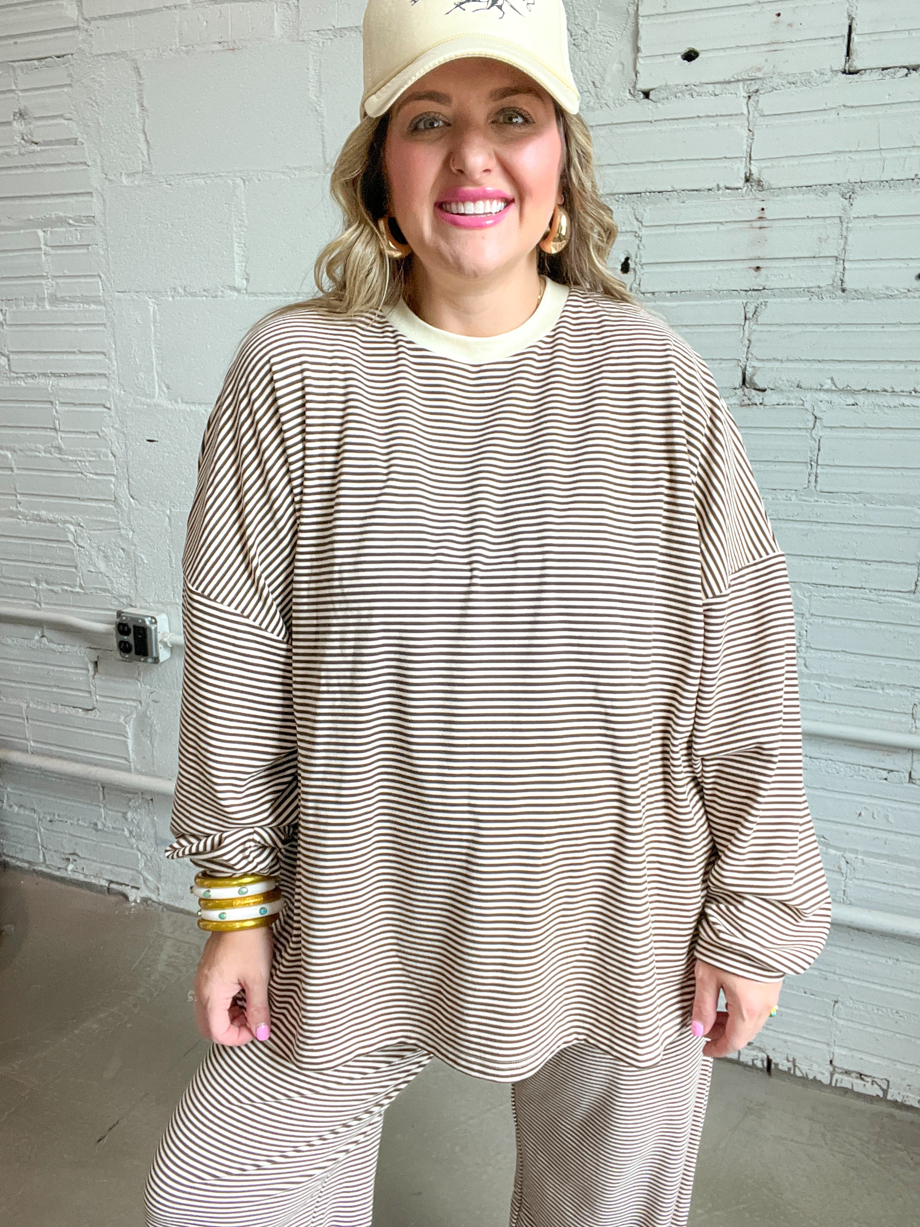 Everyday comfort with a cool-girl twist. This oversized striped top is made for lounging, layering, and living in. Rich espresso stripes meet buttery stretch fabric in this essential neutral that plays well with everything in your closet.