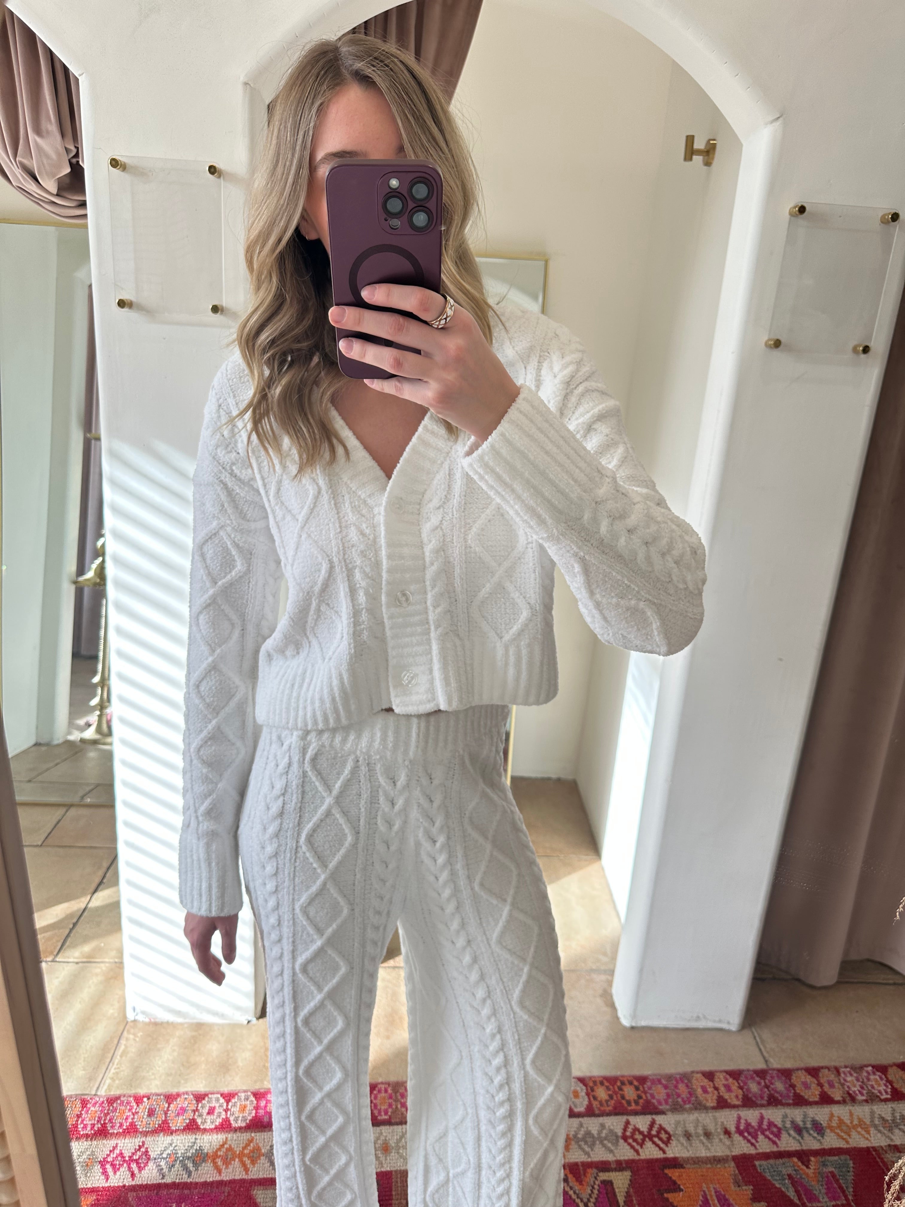 Button it up with the matching Gemma Cable Pant for a full lounge-luxury moment, or throw it over a tee and jeans when you’re doing casual but intentional. This is the kind of piece that quietly becomes your entire personality all winter long. 🤍