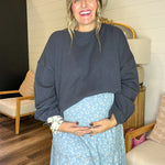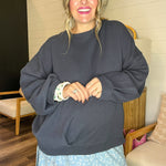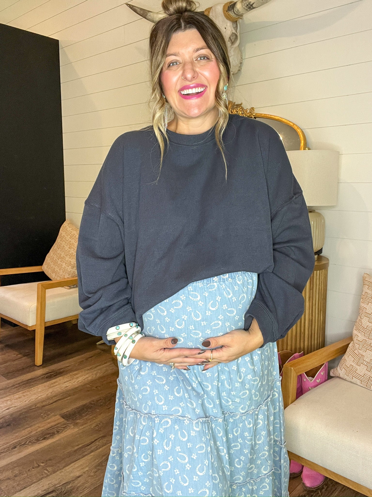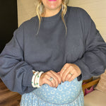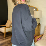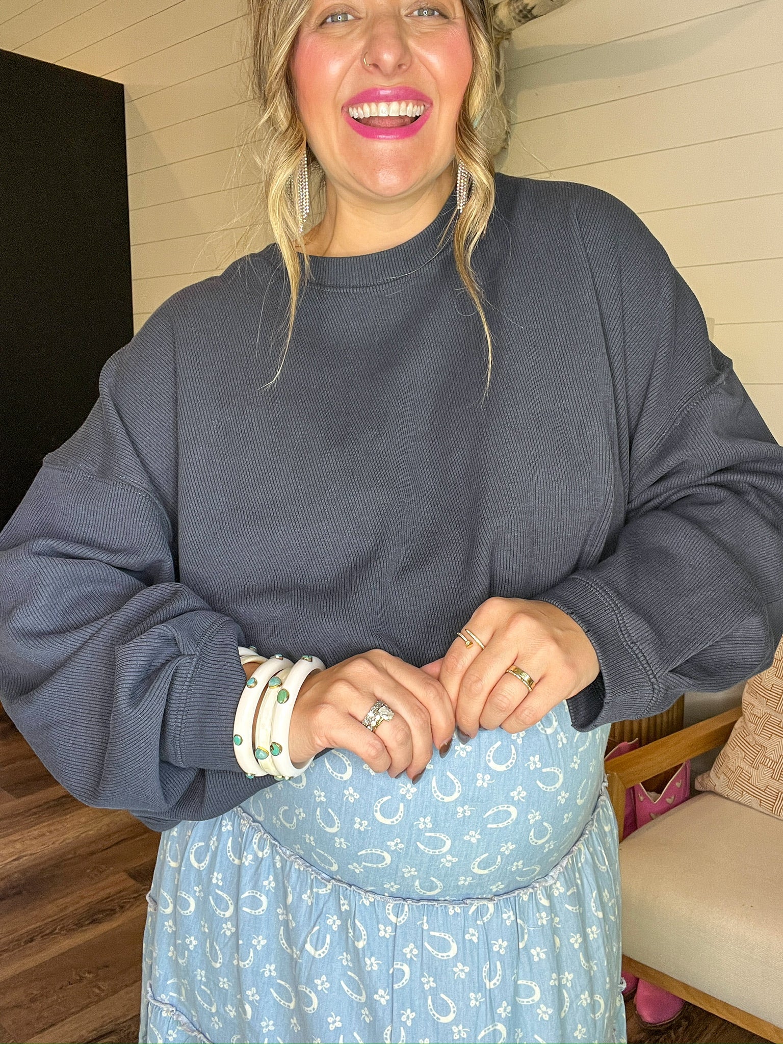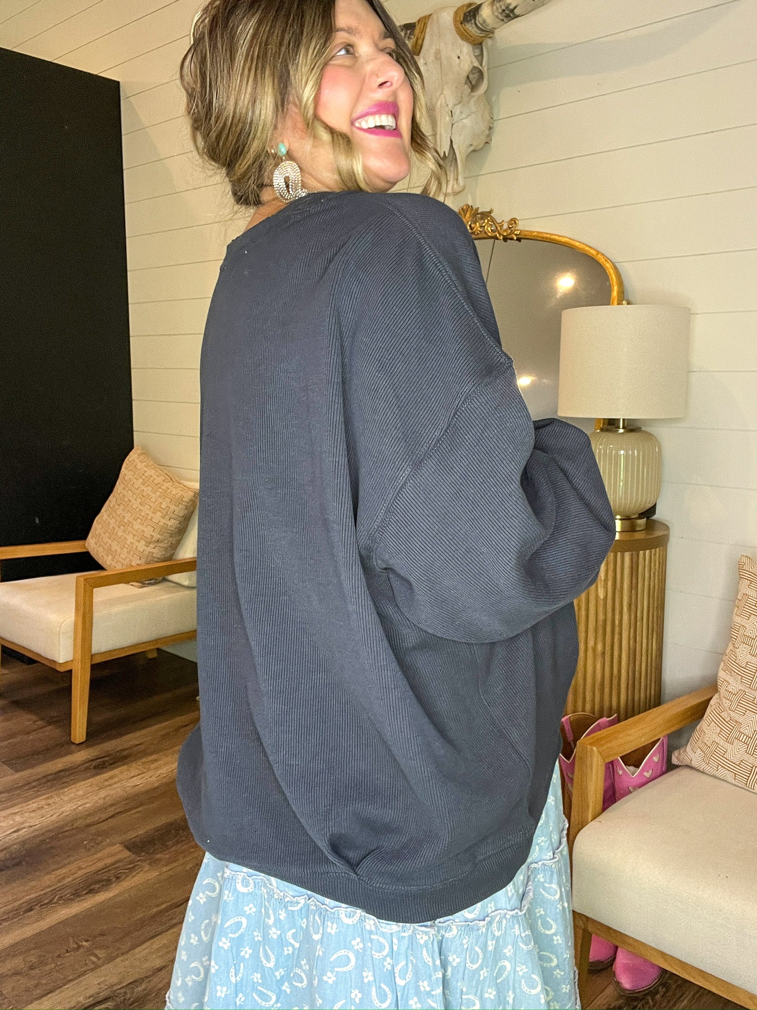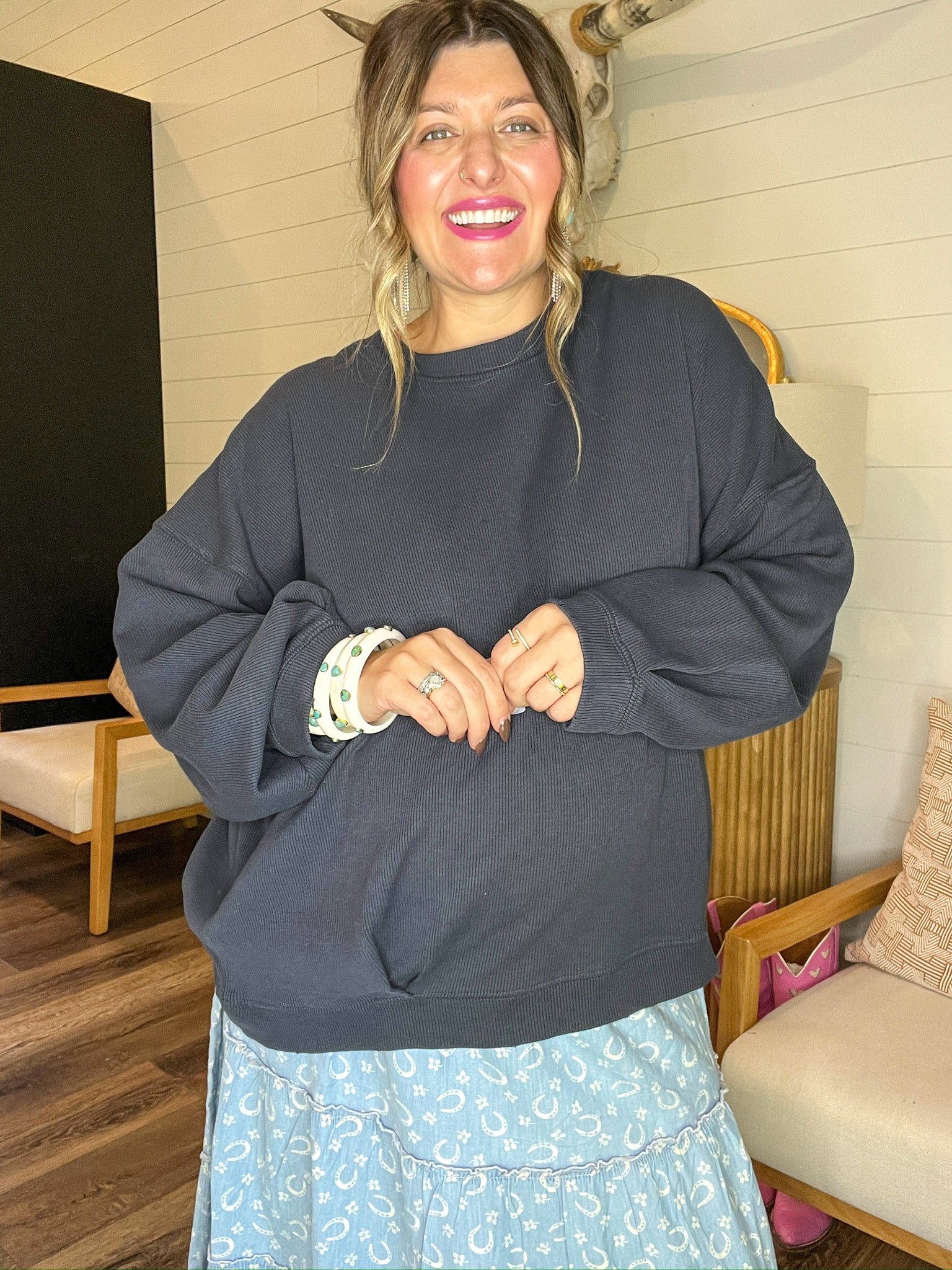 A true closet MVP- this sweatshirt is soft, lived-in, and made to be on repeat. With its ribbed texture, relaxed fit, and just the right amount of edge from the subtle distressing at the hem and cuffs, it's one of those "throw on and go" pieces you'll wonder how you lived without.
