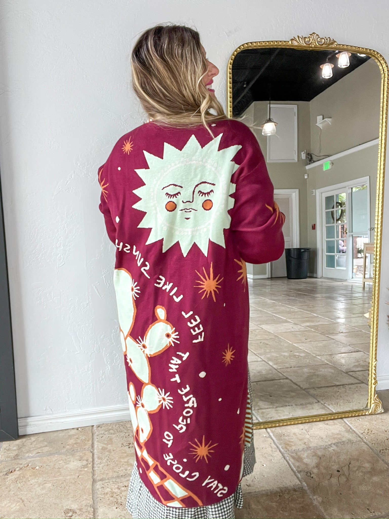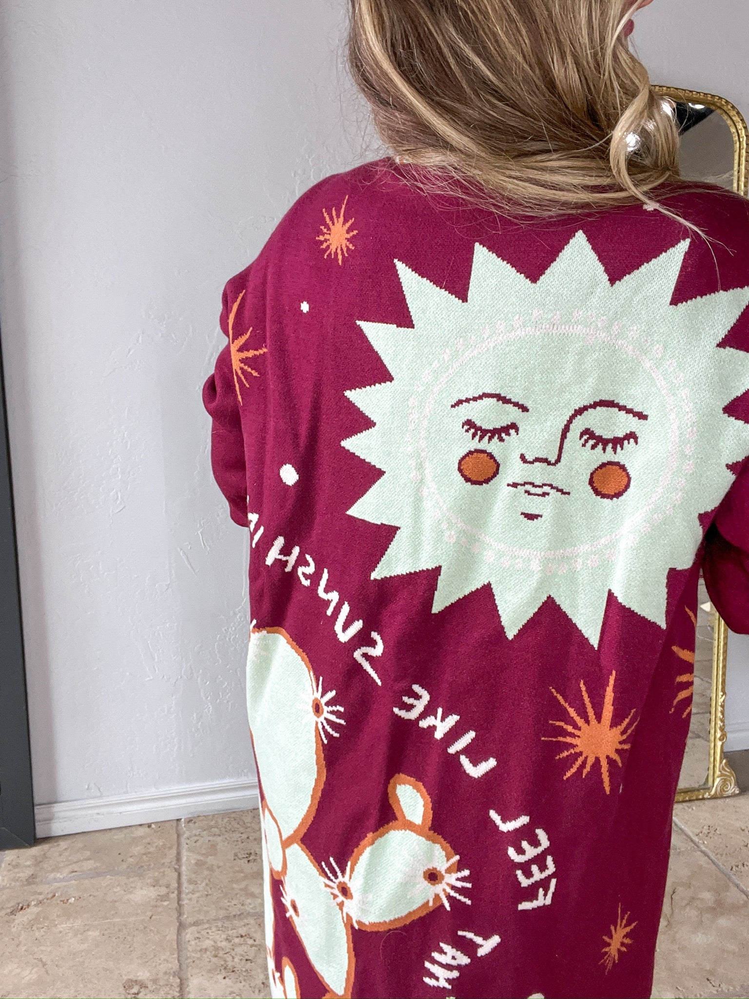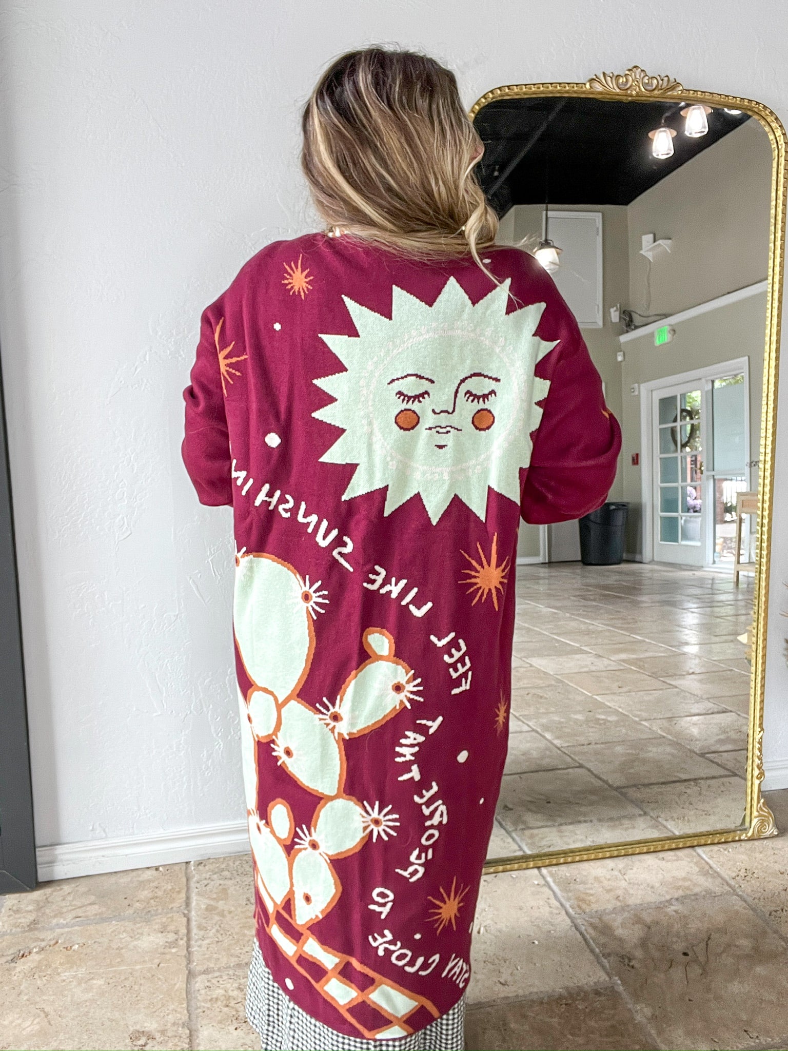 For the days when your aura is extra golden—this radiant maroon knit cardigan is here to brighten your look and your mood. Designed by Allie Falcon, it features dreamy sun and cactus artwork, pastel detailing, and an inspiring reminder to “stay close to people that feel like sunshine.” Instant joy in a cardigan.