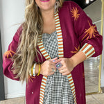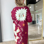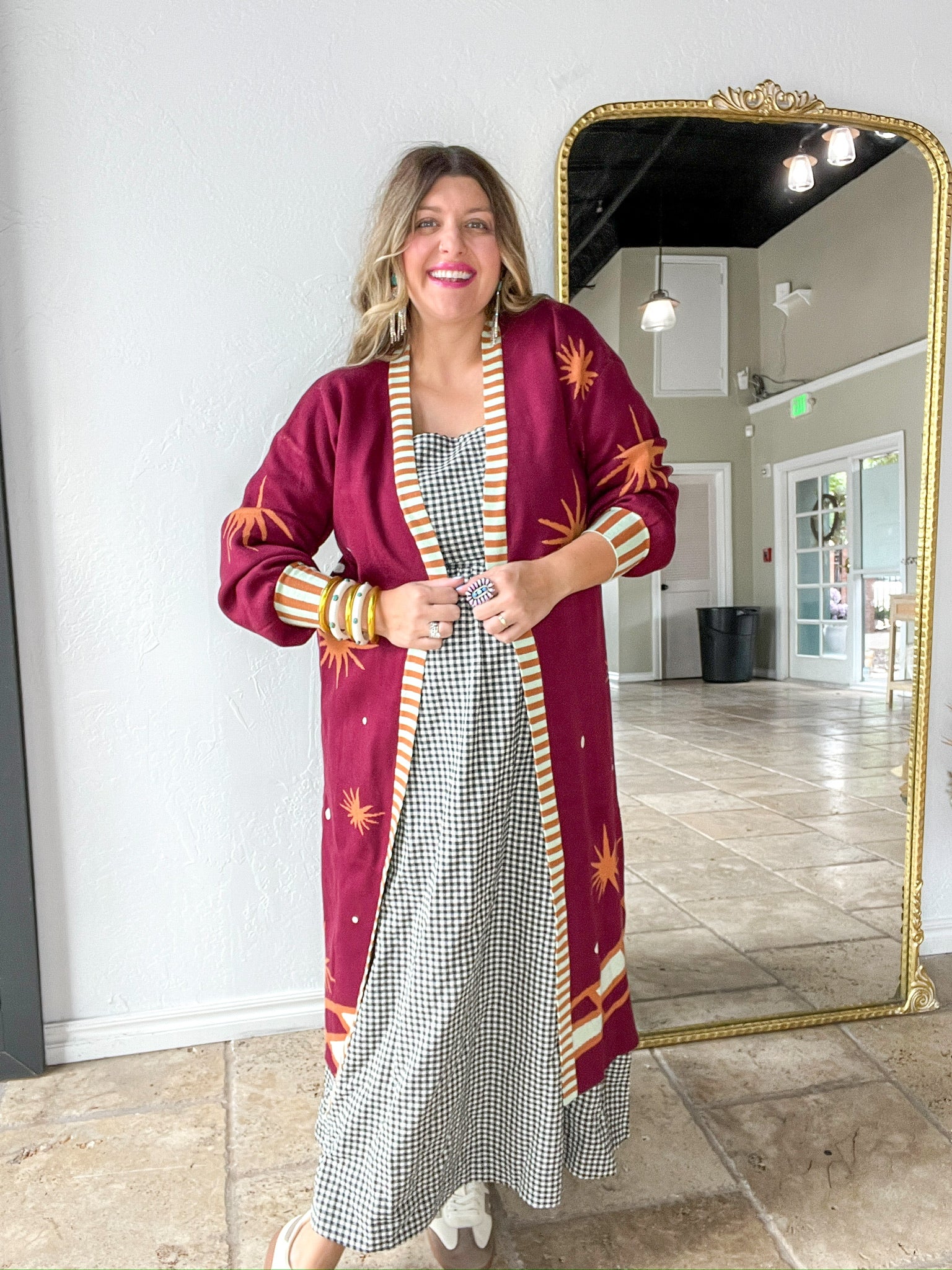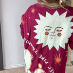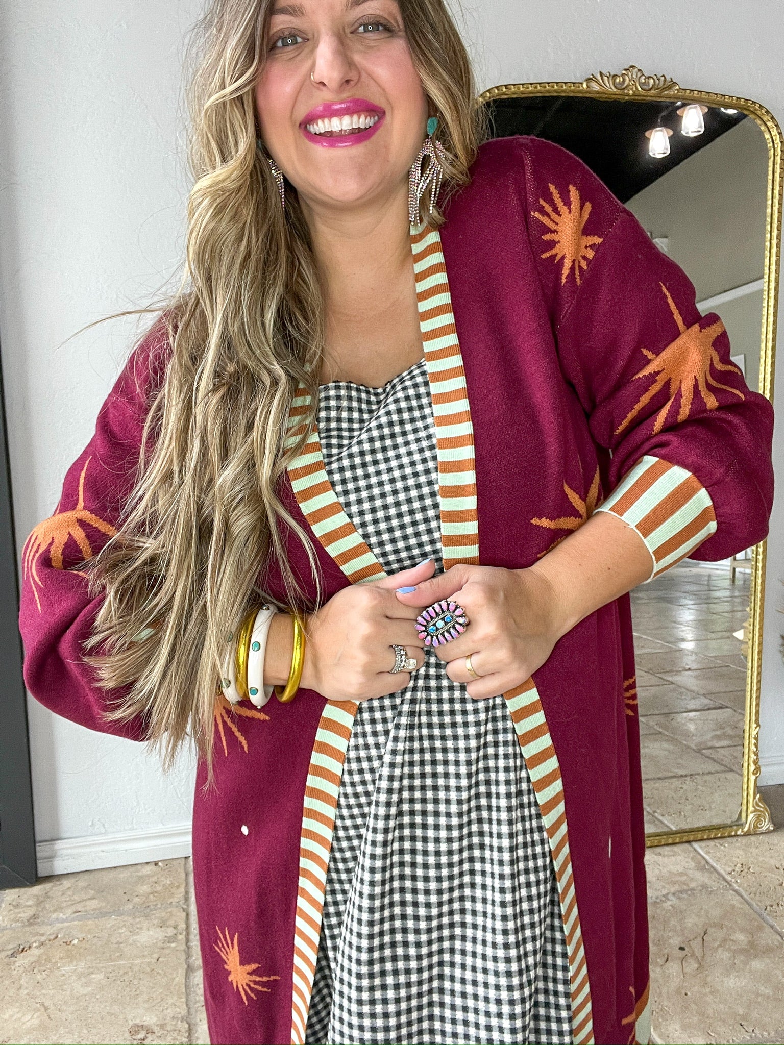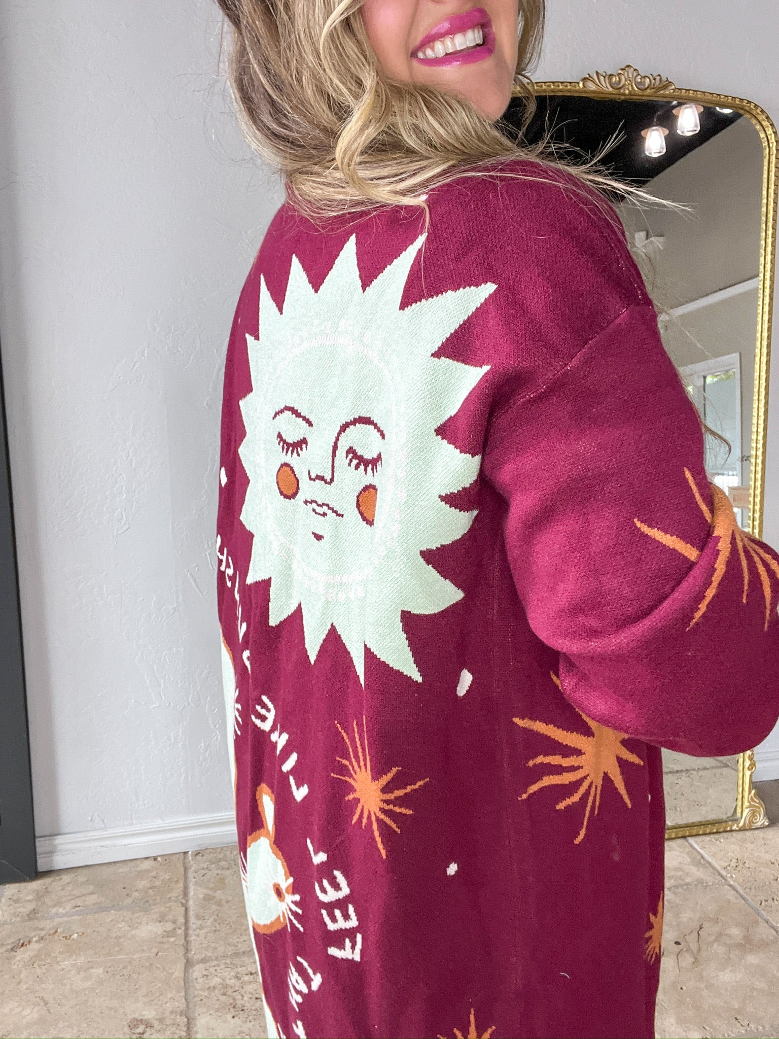 For the days when your aura is extra golden—this radiant maroon knit cardigan is here to brighten your look and your mood. Designed by Allie Falcon, it features dreamy sun and cactus artwork, pastel detailing, and an inspiring reminder to “stay close to people that feel like sunshine.” Instant joy in a cardigan.