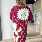 • Oversized sun face, blooming cactus, and sweet affirmations across the back