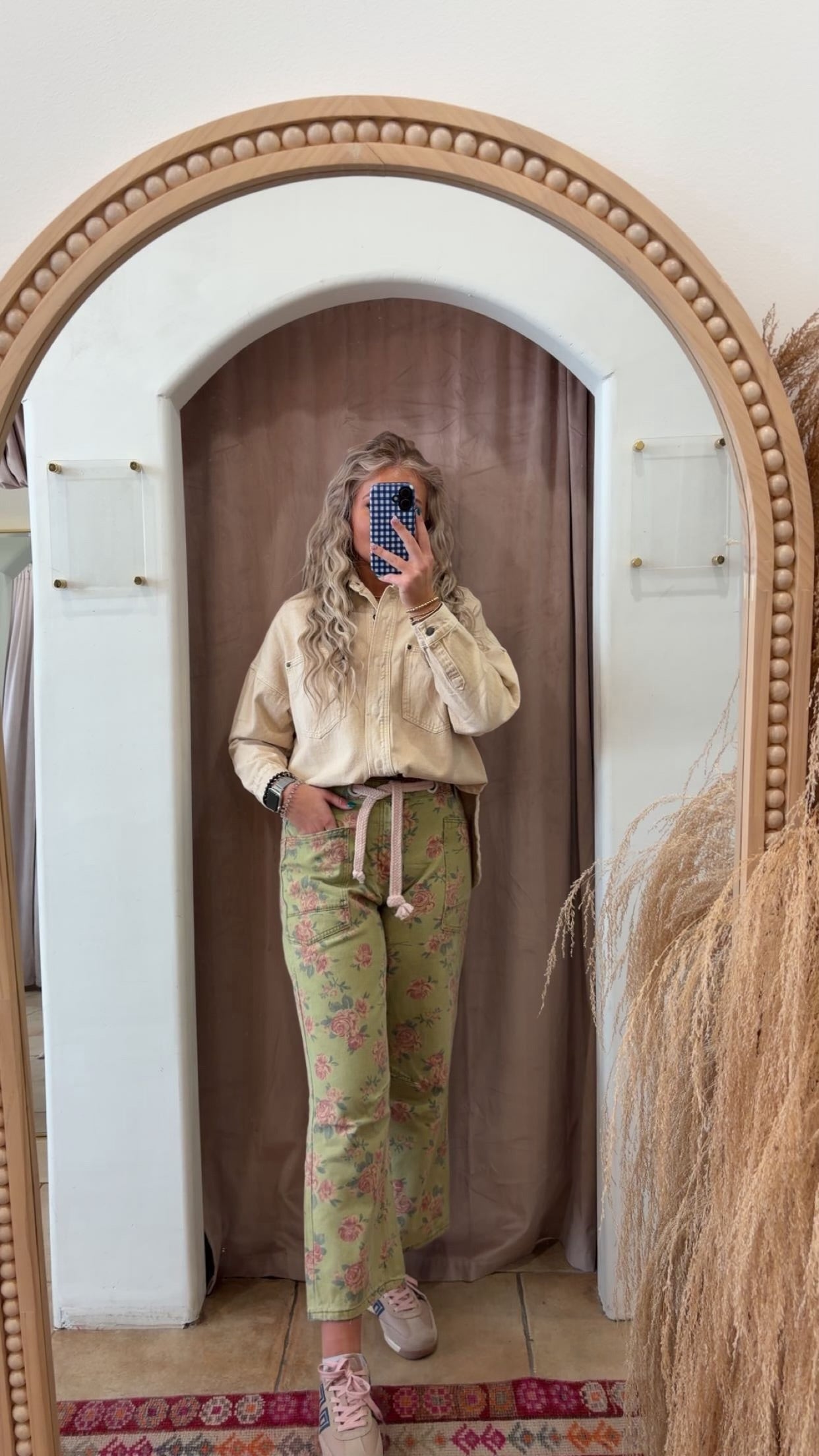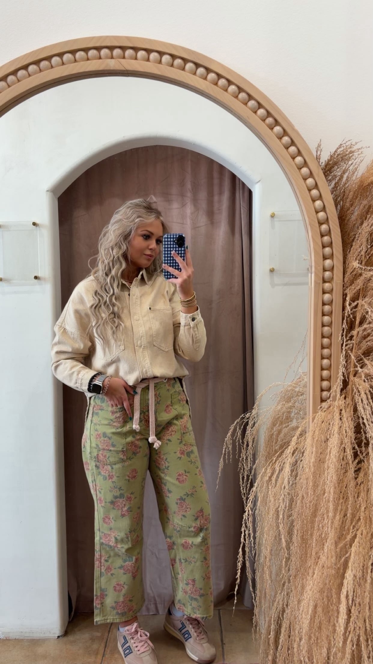 These floral braided patch pants are serving cottage-core meets streetwear in the best way possible. The soft sage-green wash + vintage rose print gives big thrifted-treasure energy, while the braided rope belt detail pulls it straight into cool girl territory. They’re playful, eclectic, and honestly just… fun. Like “I dress with personality” fun.
