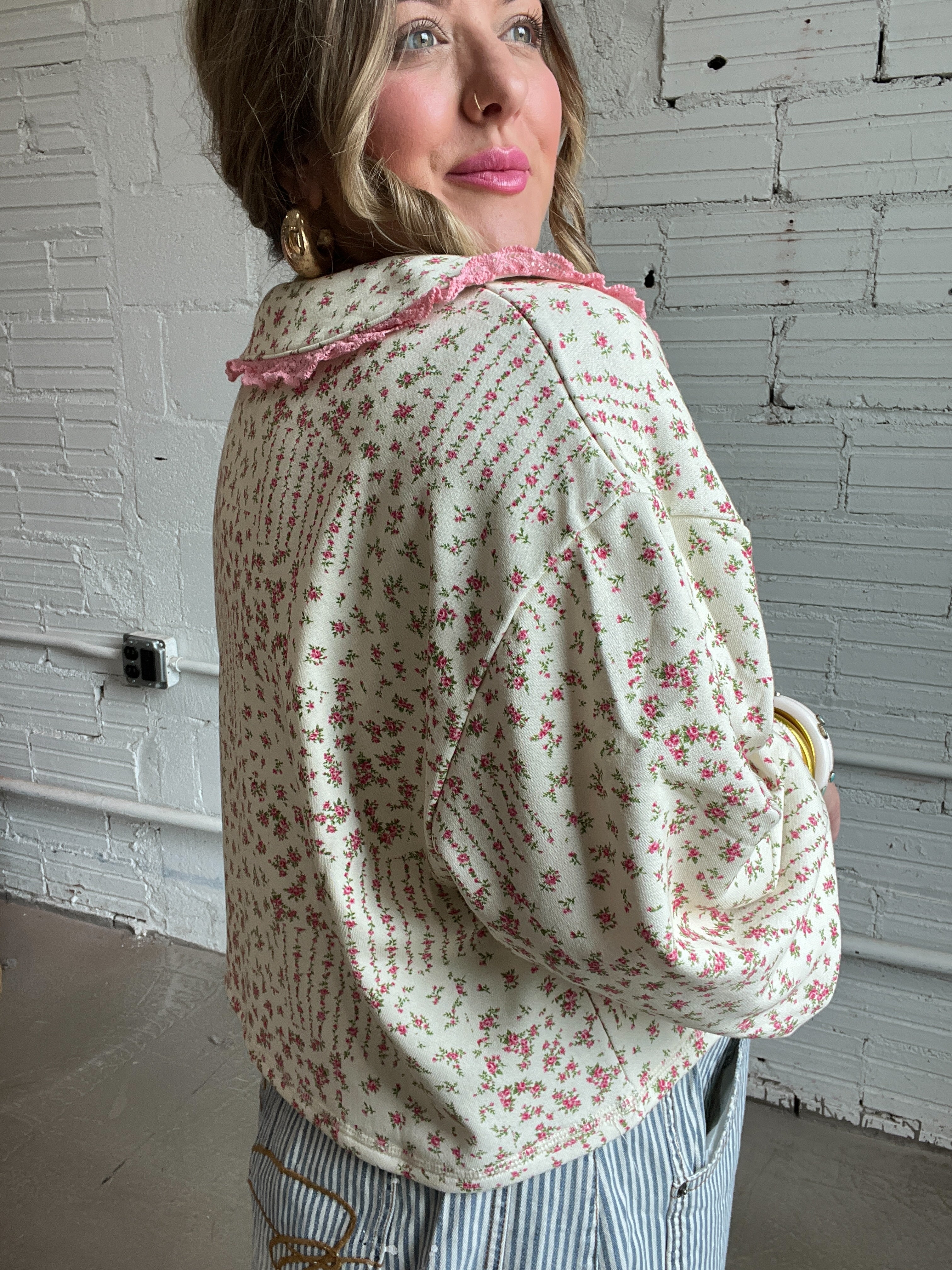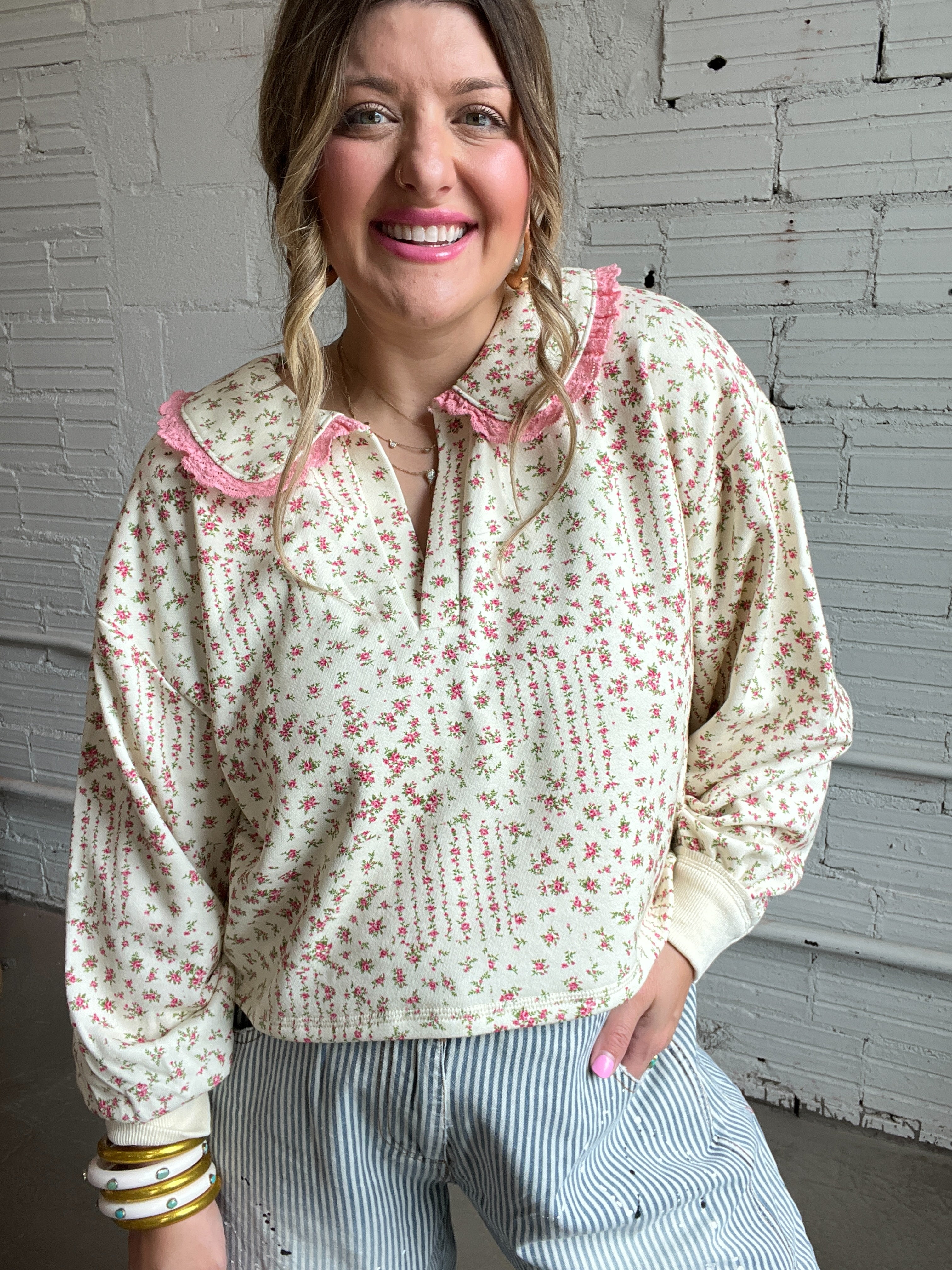 Signed, sealed, and delivered. The Love Letter Pullover looks like it came straight out of your favorite vintage romance. A delicate floral print dances across soft ivory fleece, finished with dainty pink crochet trim at the collar that gives us major storybook vibes. It’s cozy meets coquette, and we’re obsessed.