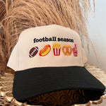 • Embroidered text + mini icon lineup: football, hotdog, fries, popcorn, pretzel, foam finger