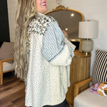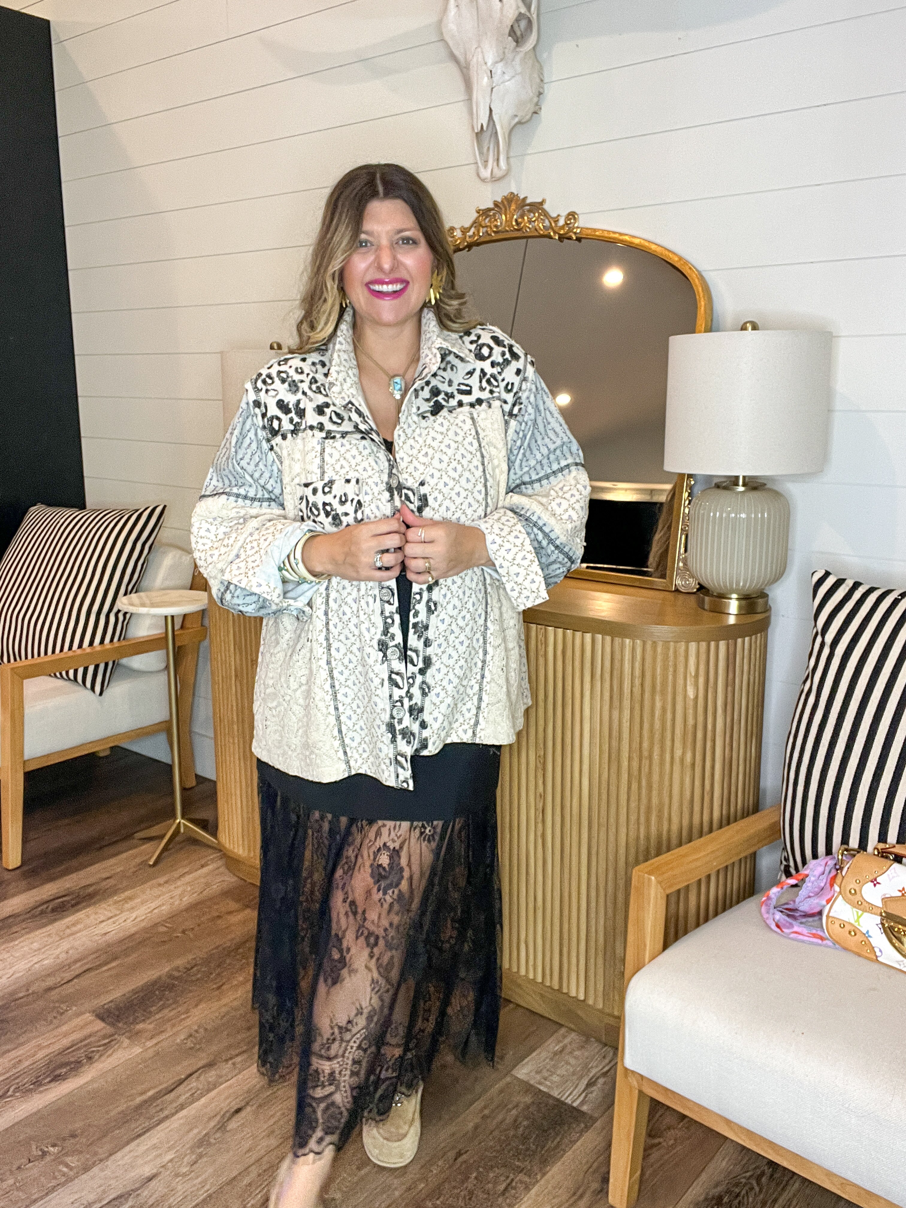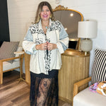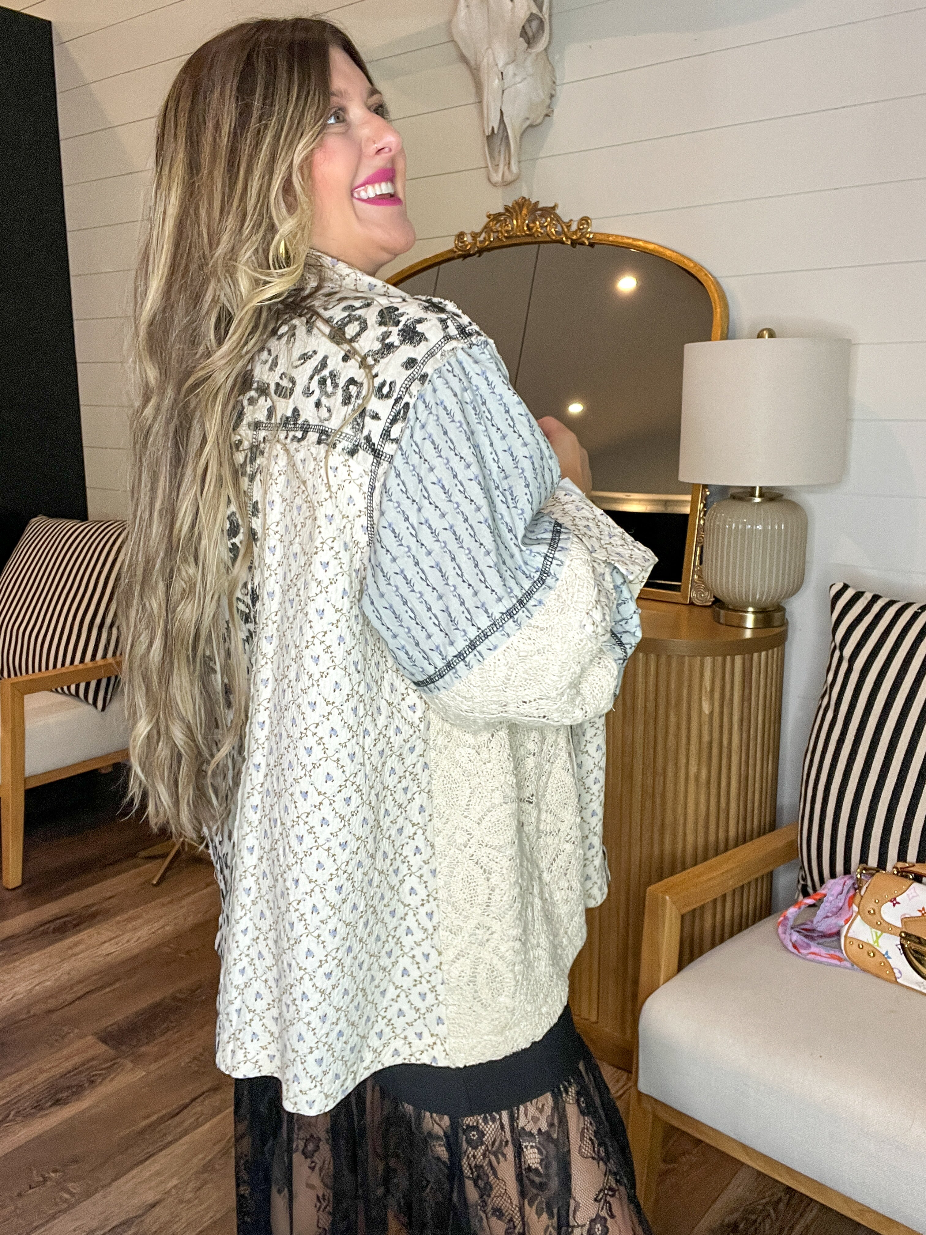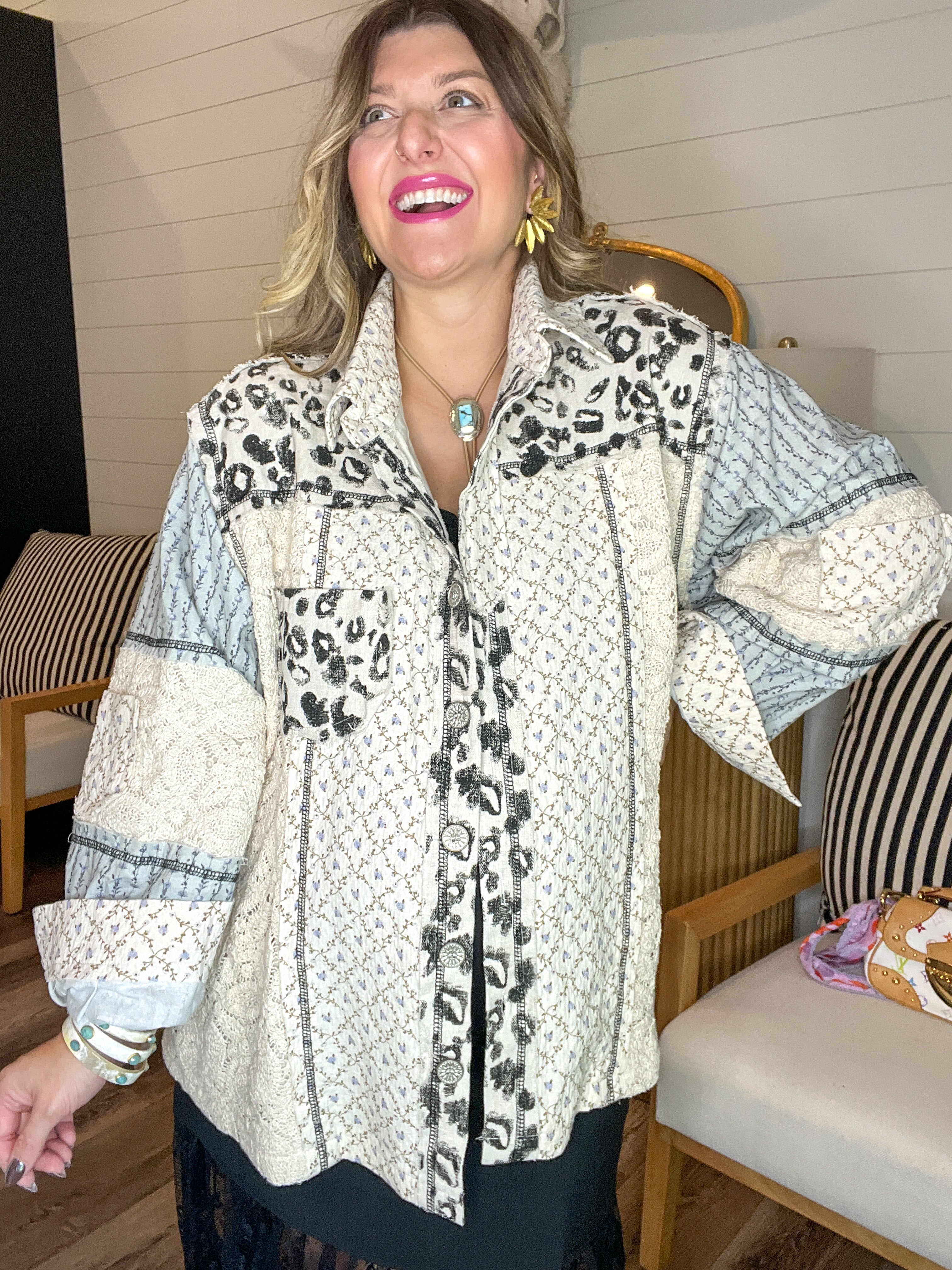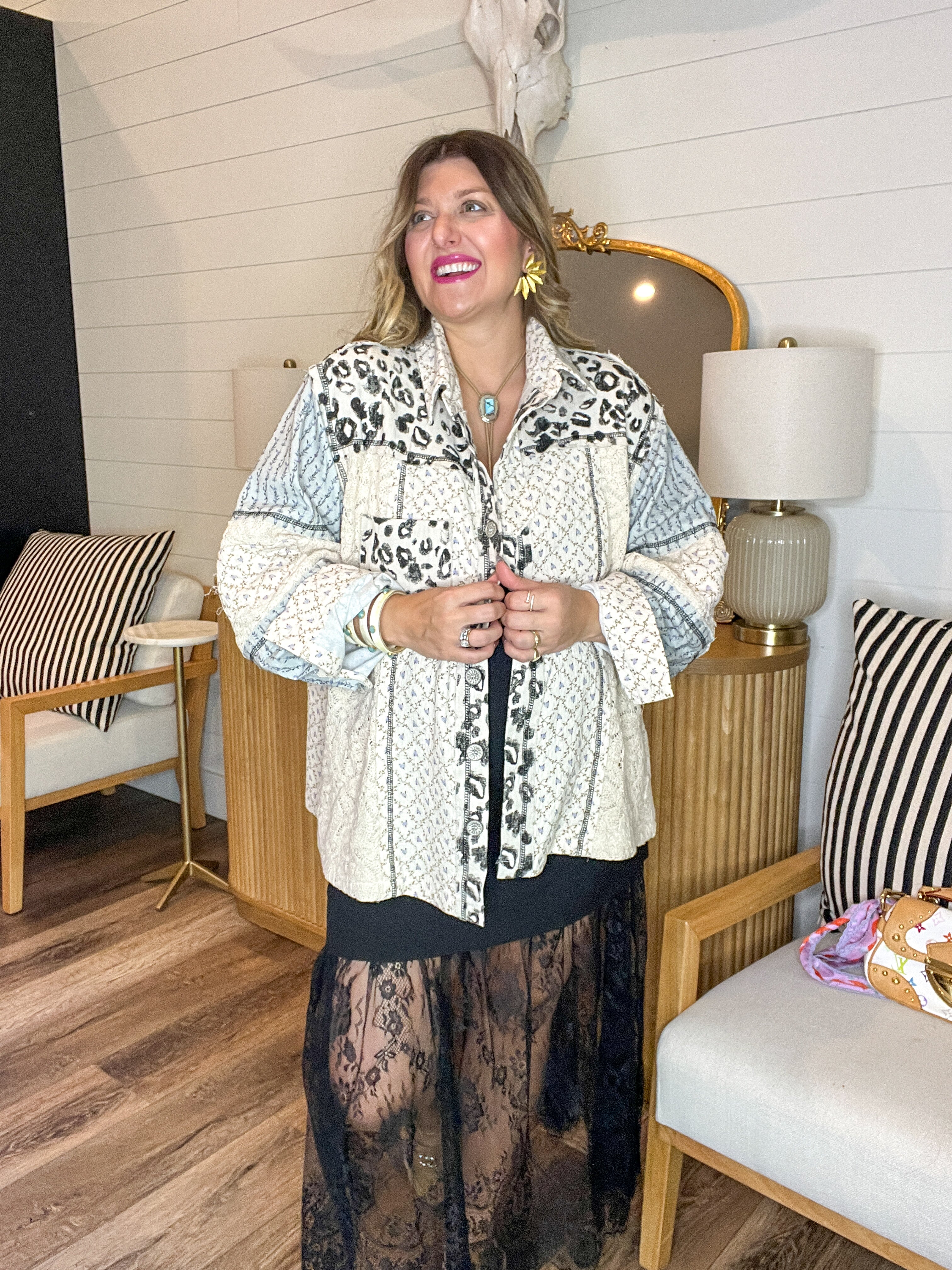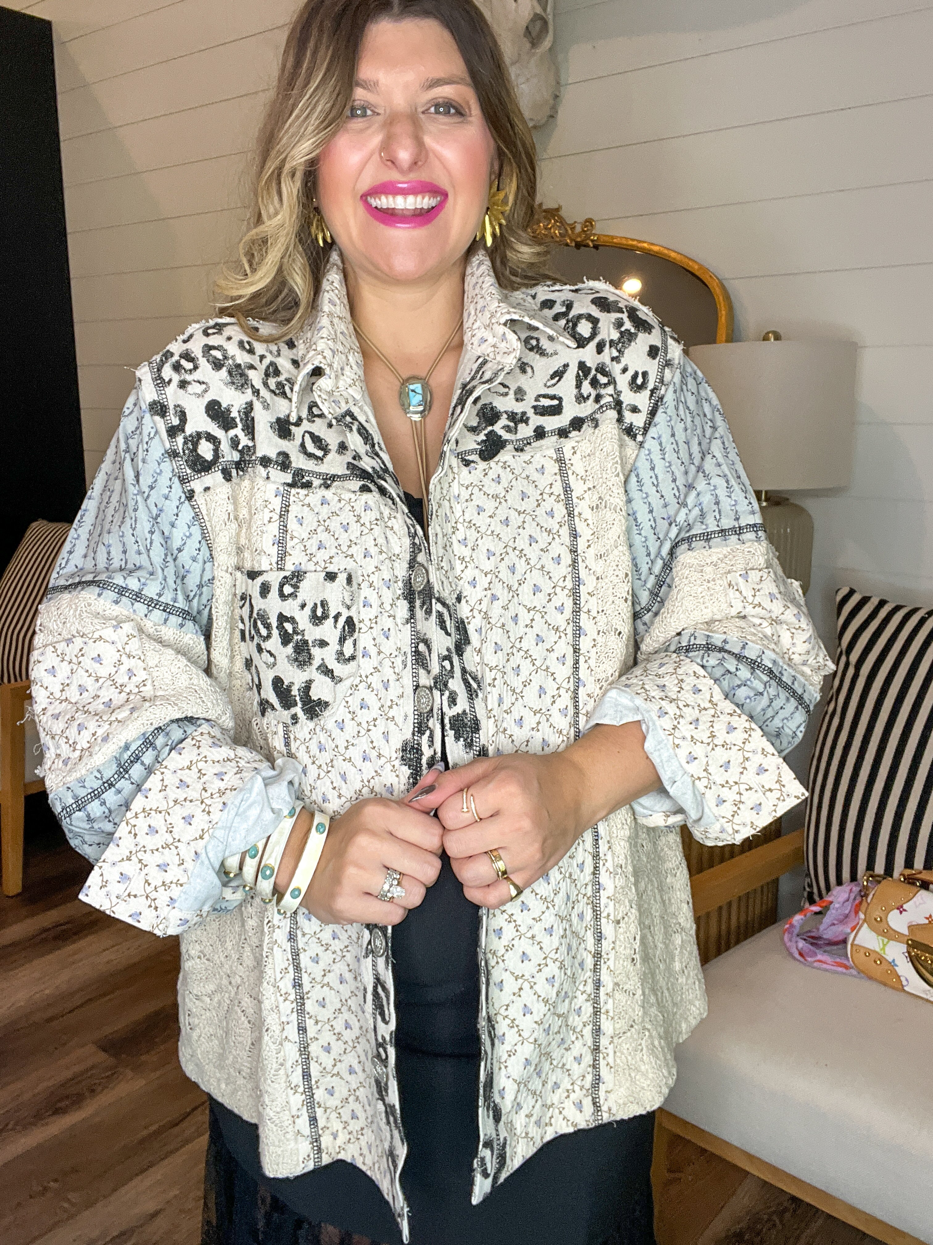 If a cozy quilt, your favorite button-up, and a little wild streak had a baby—this shirt would be it. With panels of tiny florals, light-wash stripes, lacey texture, and a bold leopard pop, it’s the shirt that doesn’t ask you to pick a vibe… it just says yes to all of them. Perfectly slouchy, perfectly you.
