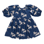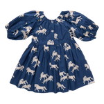 Horsing Around! A pack of white stallions pose on a midnight blue ground in our fun loving Girls Katya Dress. Crafted in our exciting Wild Horses Print, this classic silhouette features ruched details at the puffed sleeve and chest, a vintage-inspired teal scallop accent along the sleeve, pleated skirt, and a comfortable scoop neck. You'll find Wild Horses throughout the Fall Collection making it easy to match back to Mom and Sister.