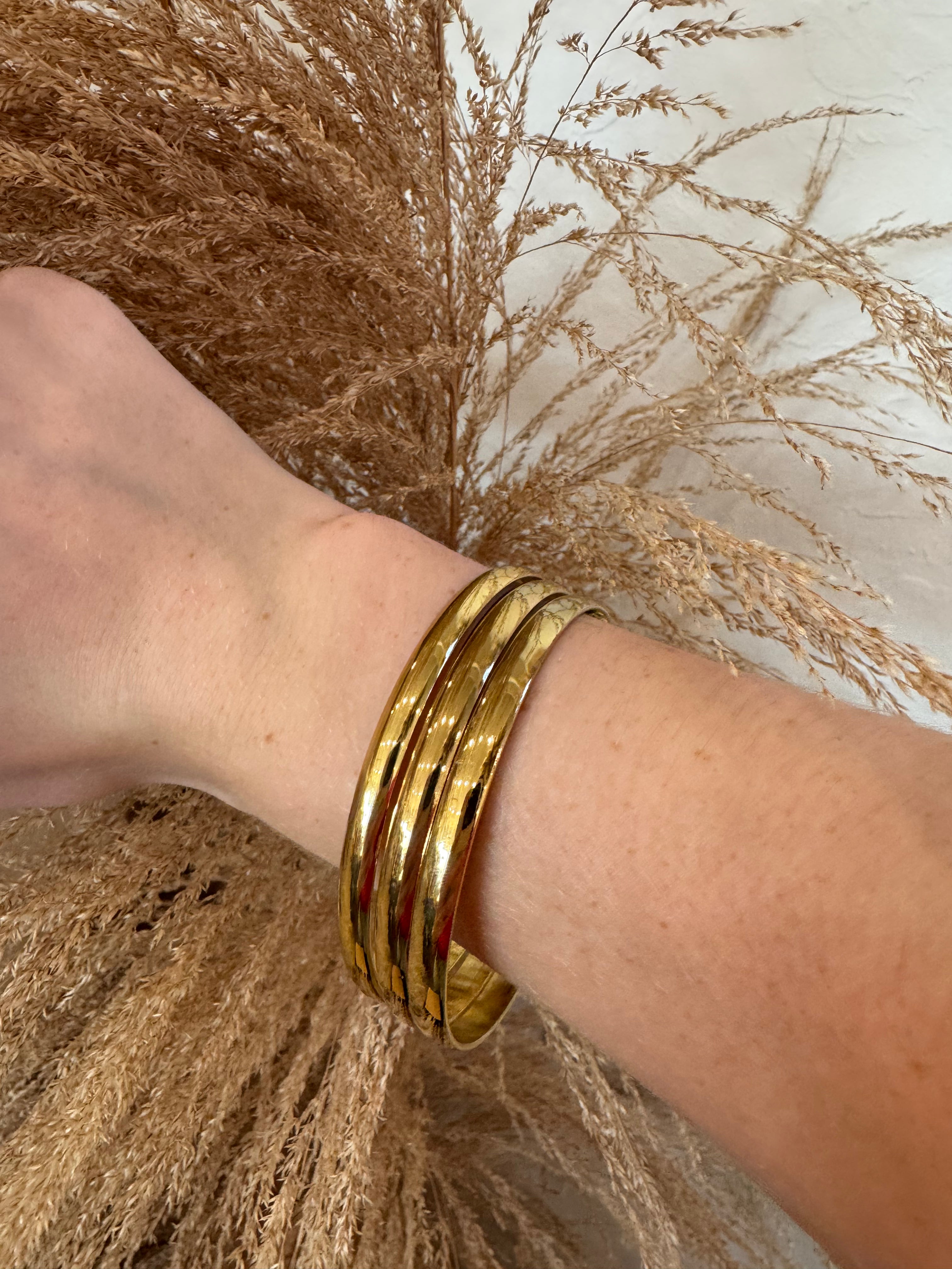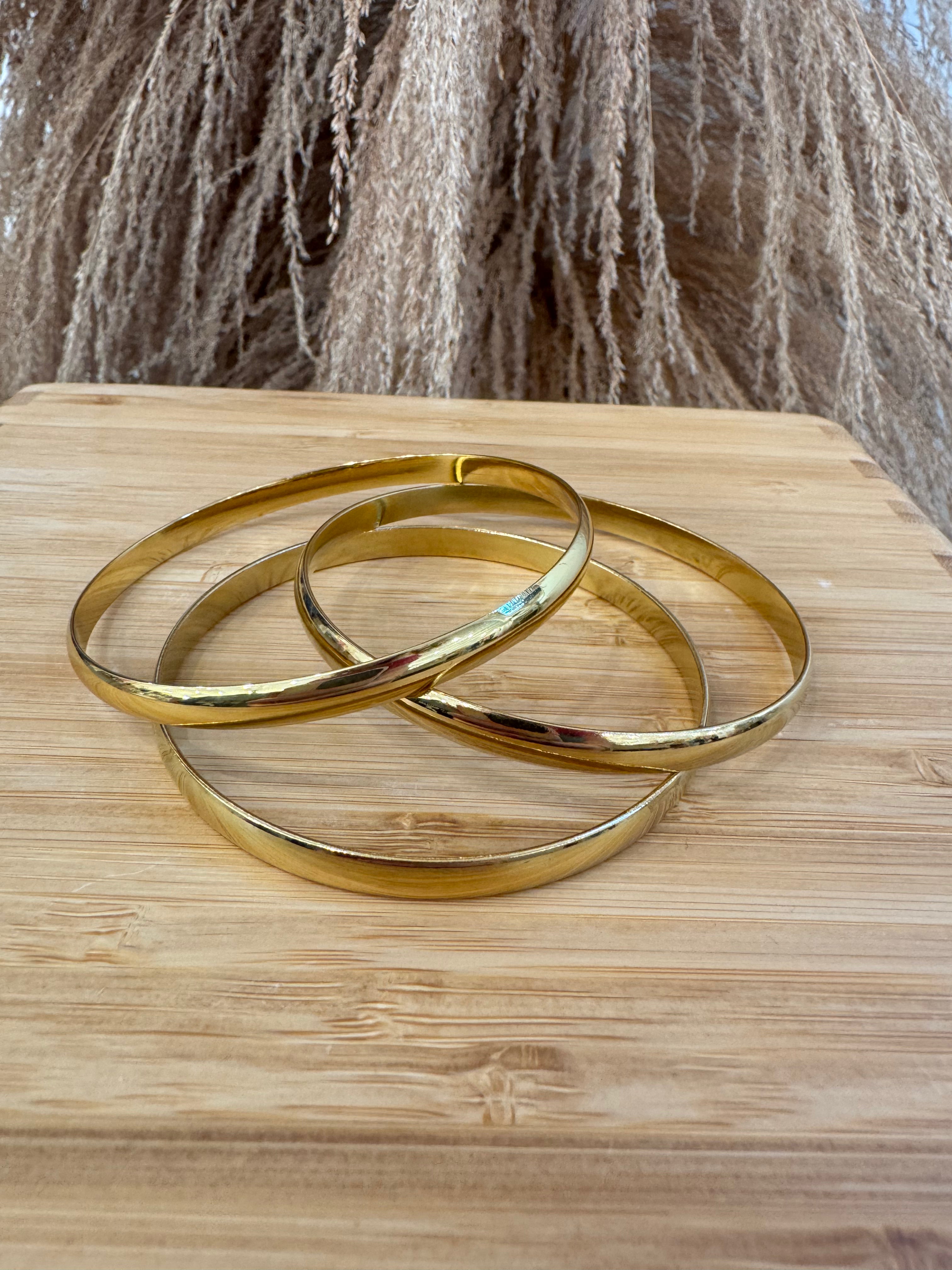 Stainless steel and 14kt gold plated. Get the luxury look of gold stacked bangles with this unique set. Set of 3 bangles come with this set.