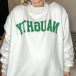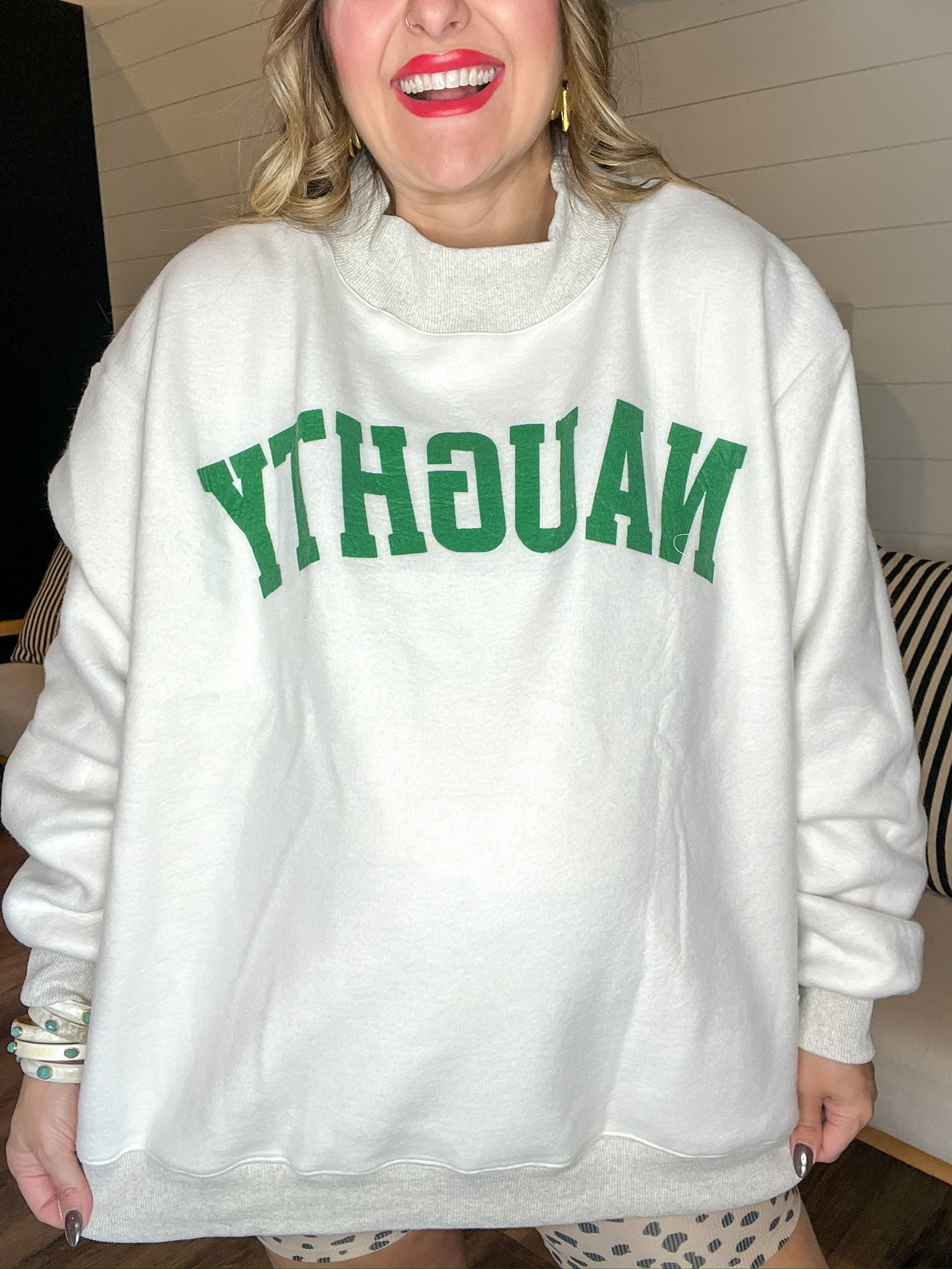 ‘Tis the season for dual personalities—and this cozy mock neck’s got both. On one side, you’re serving classic Grinch energy with bold green lettering on a soft heather gray base. Flip it inside out and boom: clean white with Naughty in the same cheeky green font. Whether you’re feeling festive or feisty, this sweatshirt flips to match your mood. Equal parts cozy, clever, and chaos-core.
