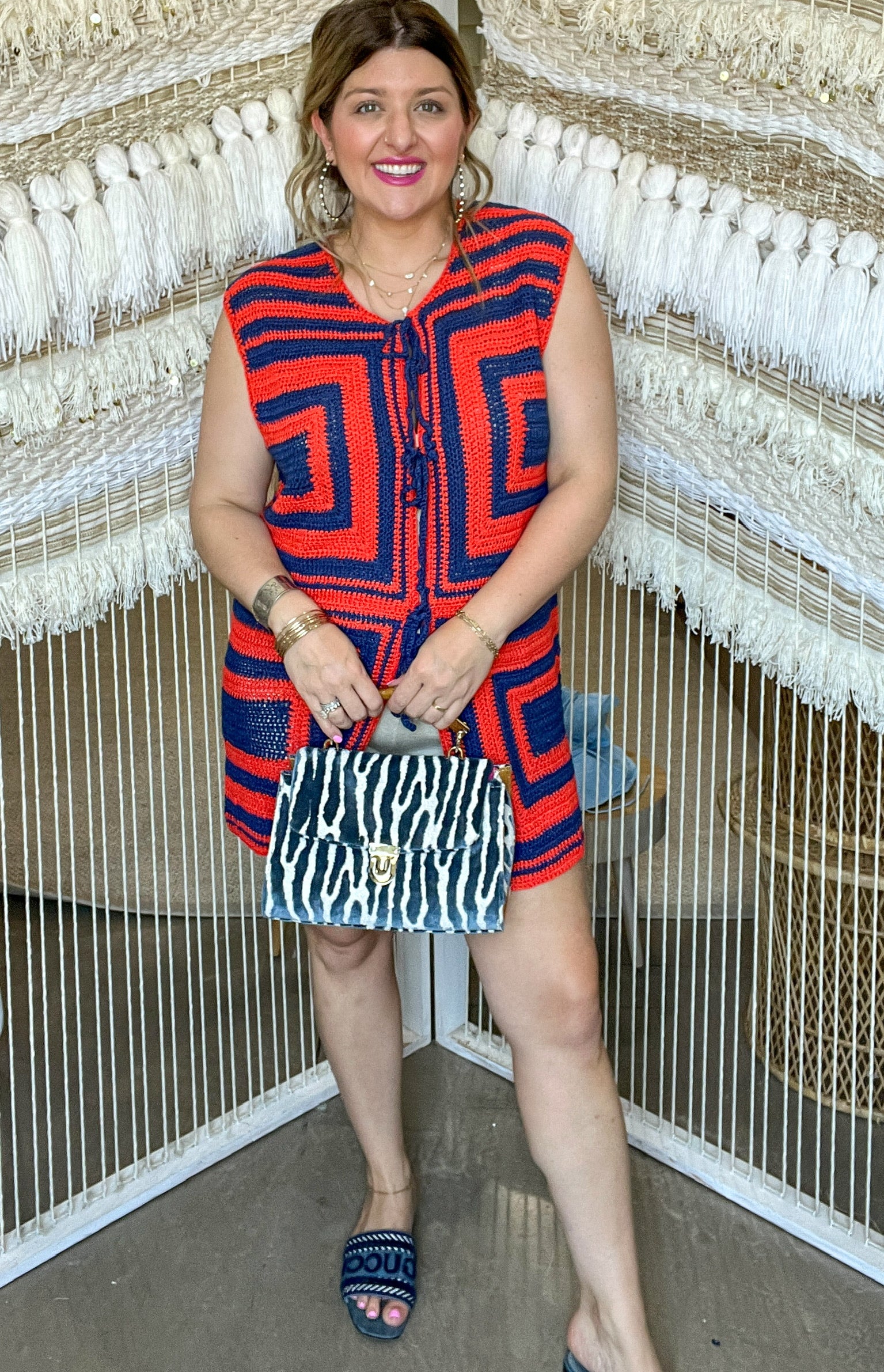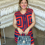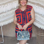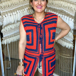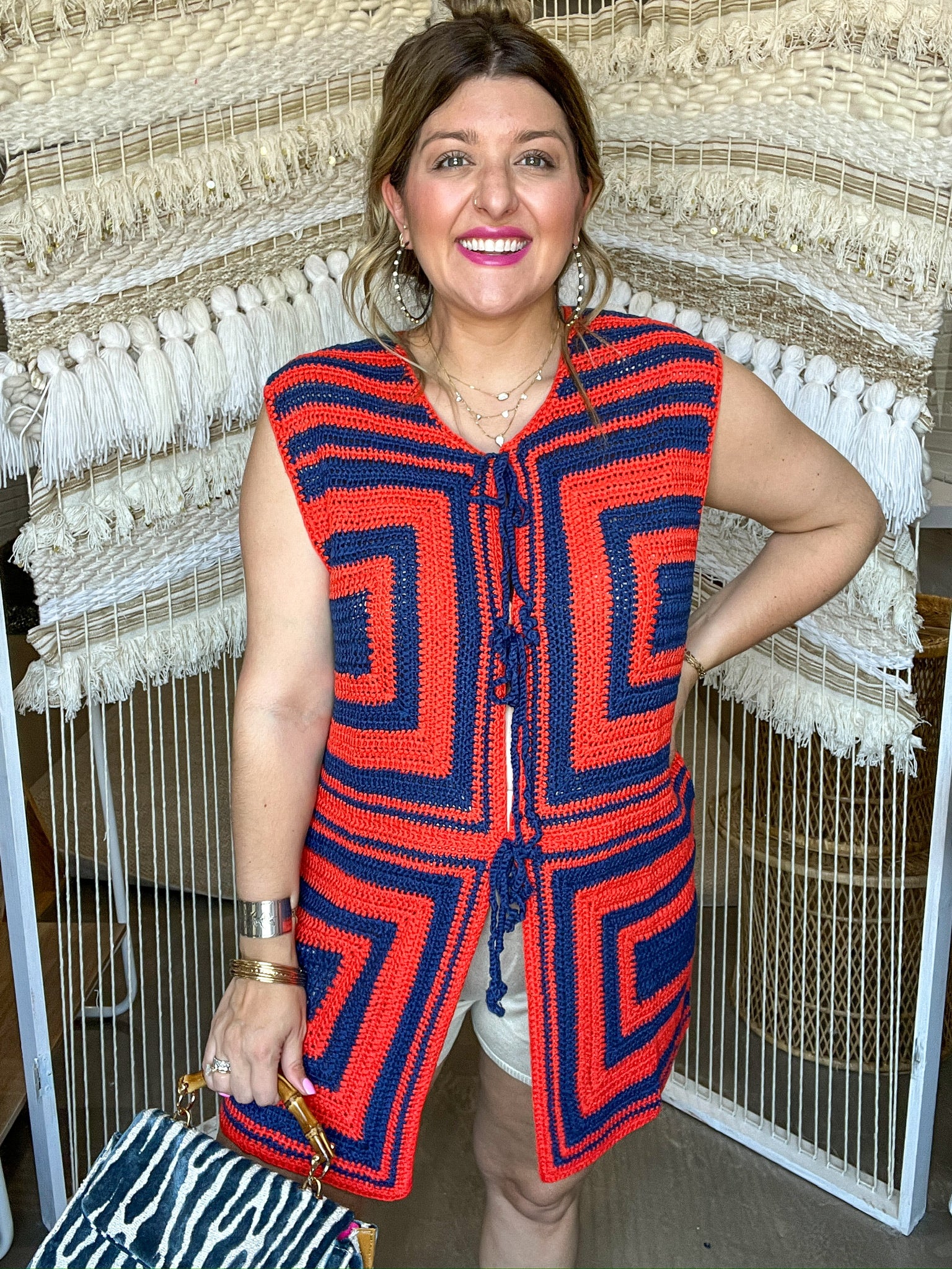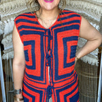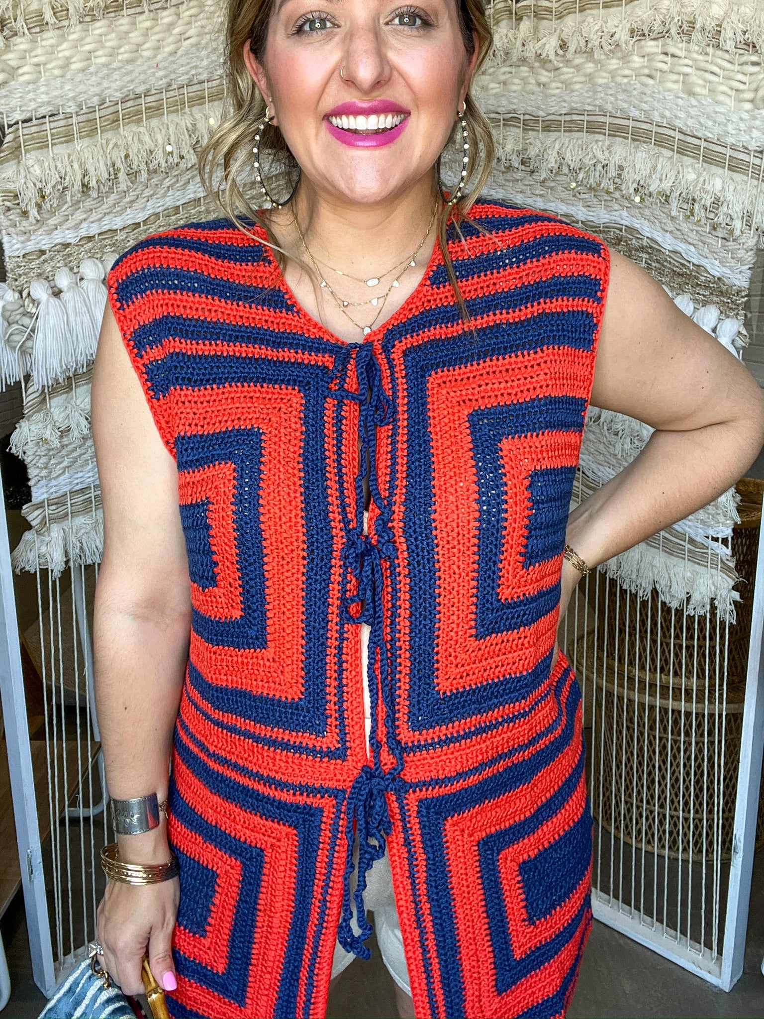 If 70s disco and Stillwater gameday had a baby, it would be this vest. The Groove Grid Knit Tank brings the energy with a bold, retro colorblock pattern in deep navy and fiery orange. Handmade crochet squares, front tie closures, and a lightweight knit make it the ultimate statement piece for layering all season long.