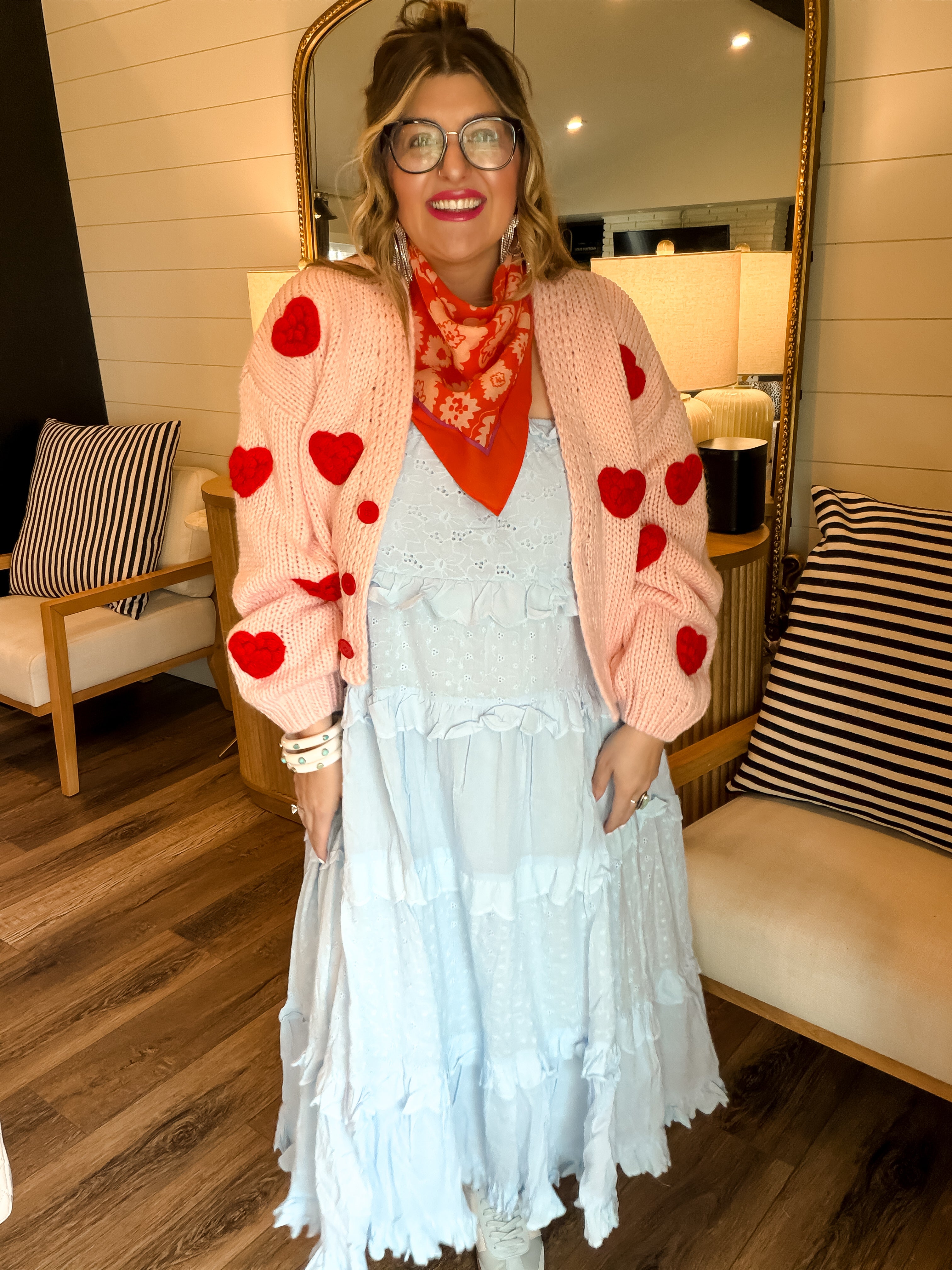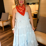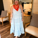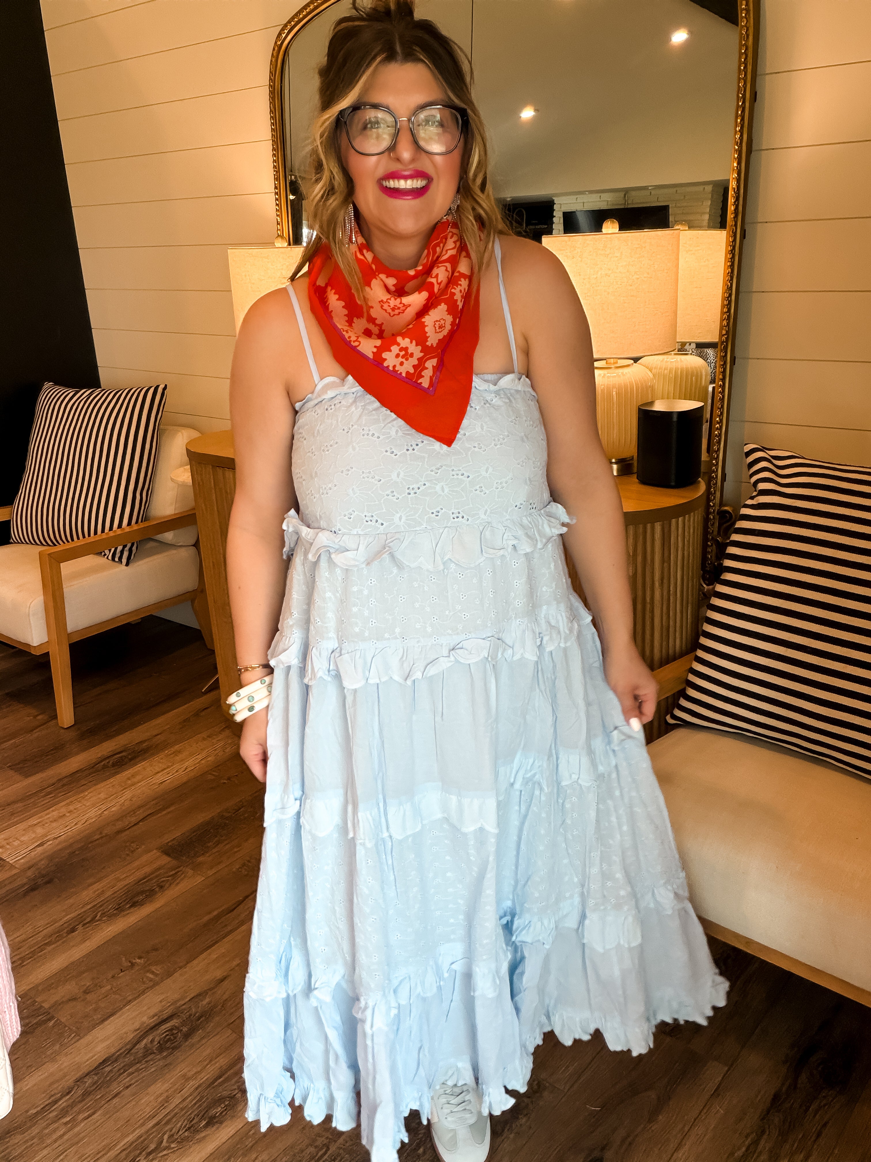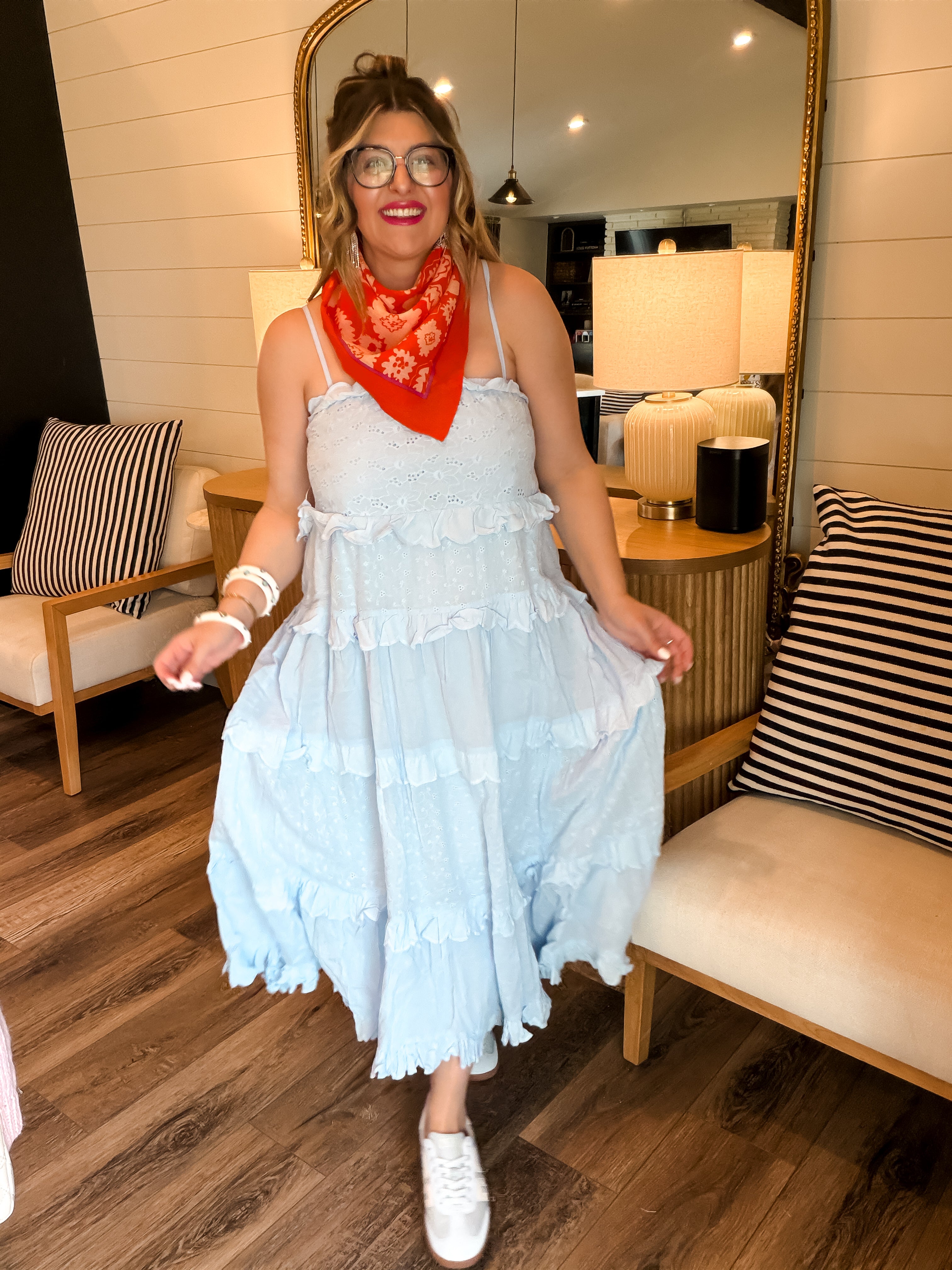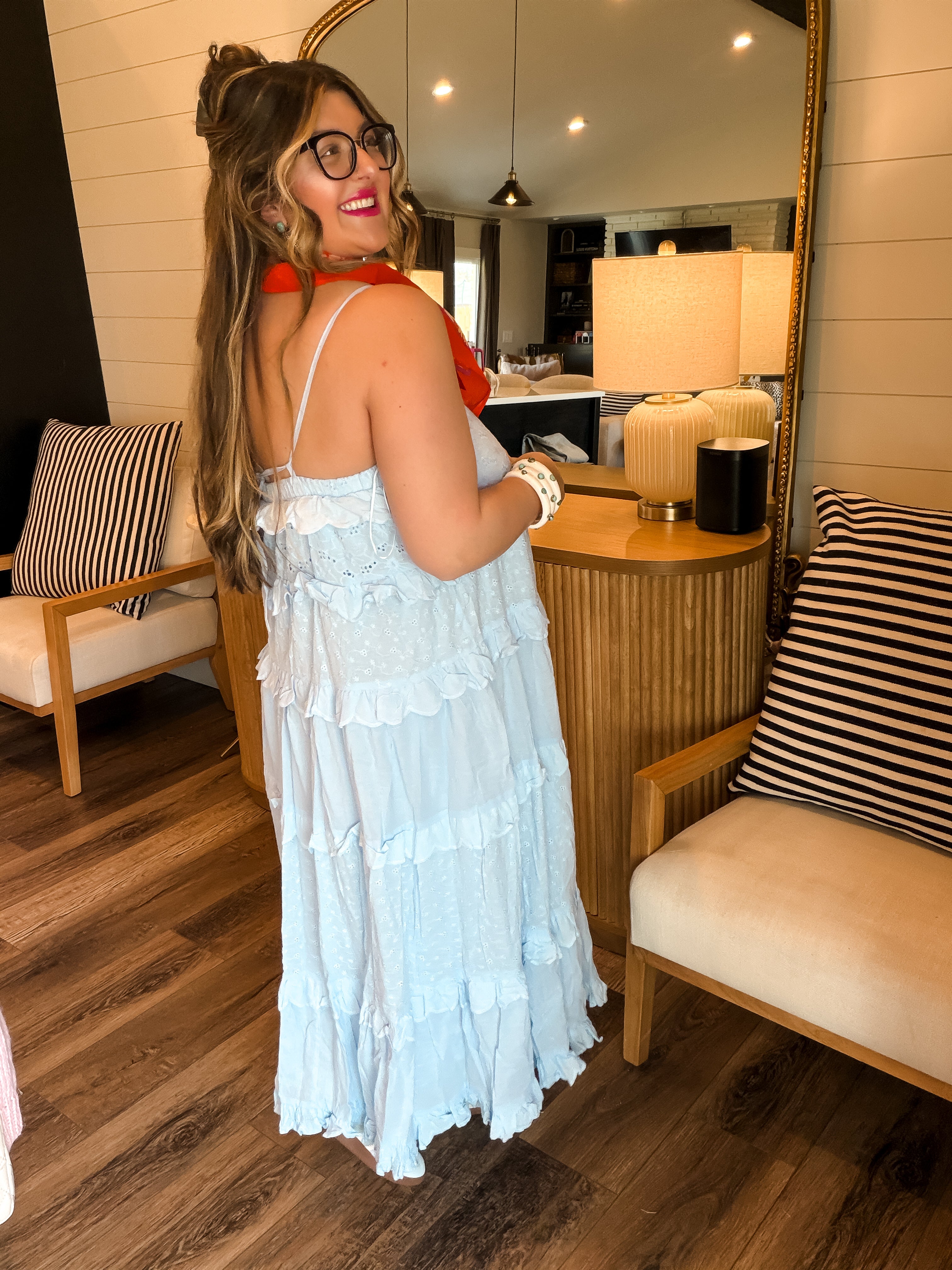 Soft, feminine, and effortlessly charming — the Guest of Maxi Dress in blue is the kind of piece you’ll reach for all season long. This dreamy light blue dress features delicate eyelet detailing, adjustable spaghetti straps, and tiered ruffle layers that create the prettiest flowy silhouette. The lightweight fabric keeps it breezy and comfortable while the midi length makes it perfect for everything from brunch dates to weekend outings.